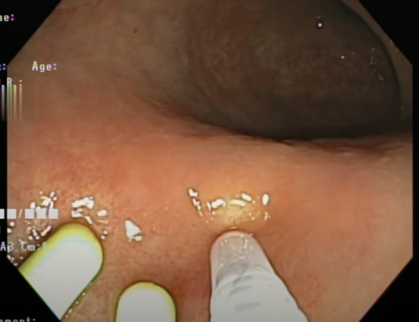 依照慣例,我們將粘膜層剝離後切除腫瘤並打上縫合釘。最後的病理報告的確是惡性神經內分泌瘤。