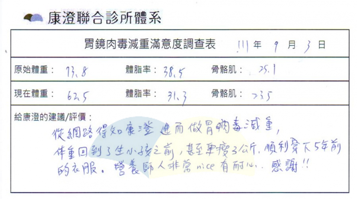 諮詢當天營養師跟小美介紹胃鏡胃肉毒是什麼,測量體脂,還有了解小美的飲食狀況,跟想要減重的需求,一起規劃整的治療過程。