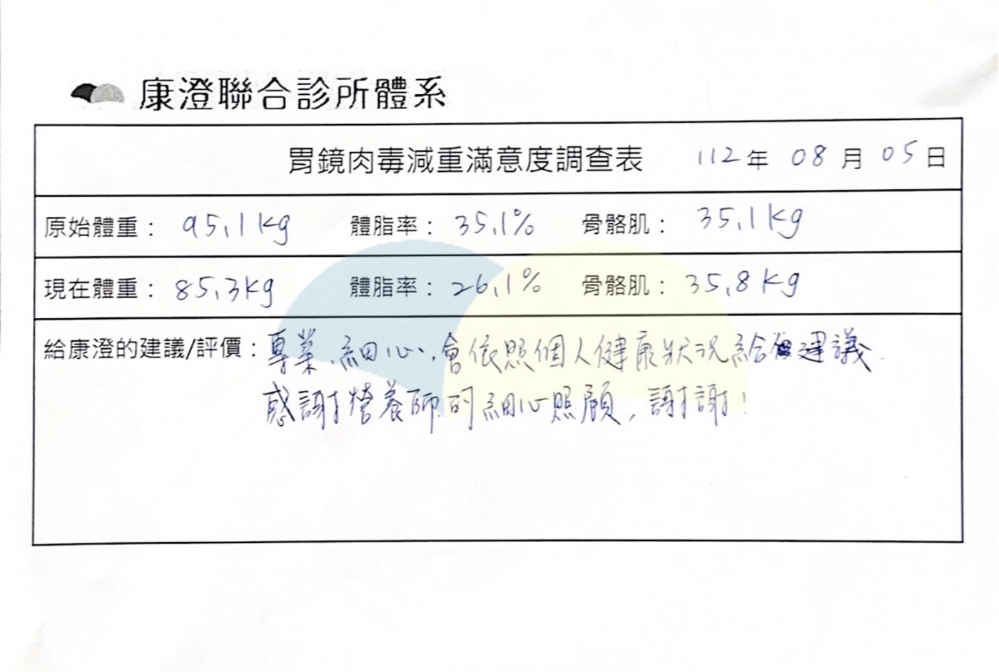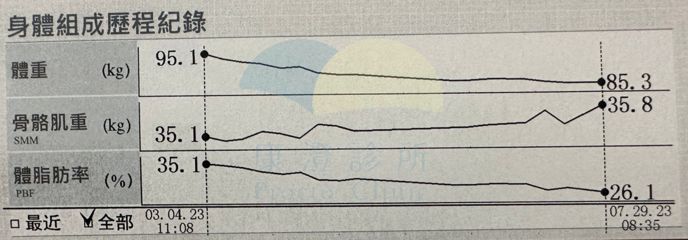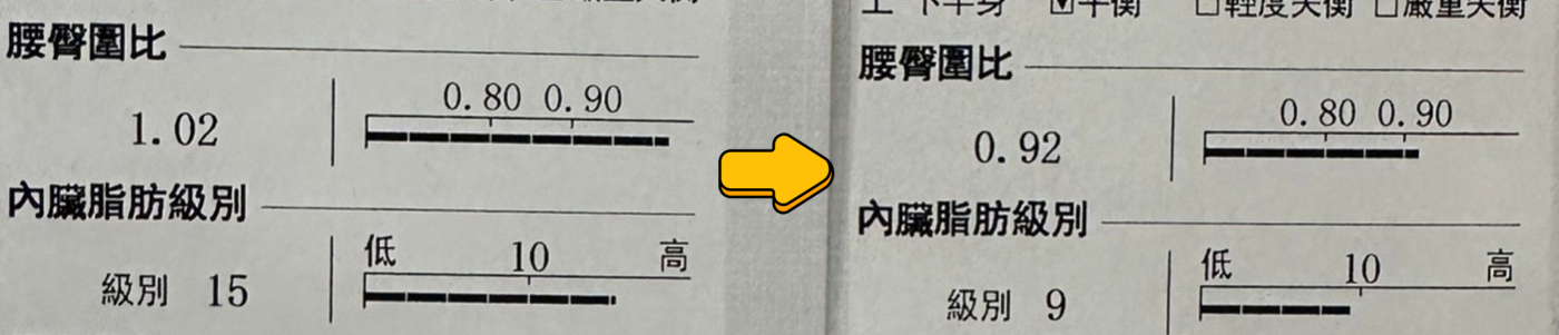 經過胃肉毒注射降低口腹之慾及營養師給予的個人化飲食建議過後,順利減下9.8公斤的體重,及8.8公斤的脂肪重相當於9%的體脂率!內臟脂肪從級別15降至9