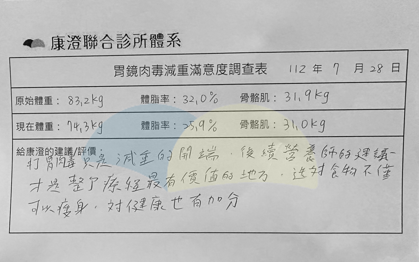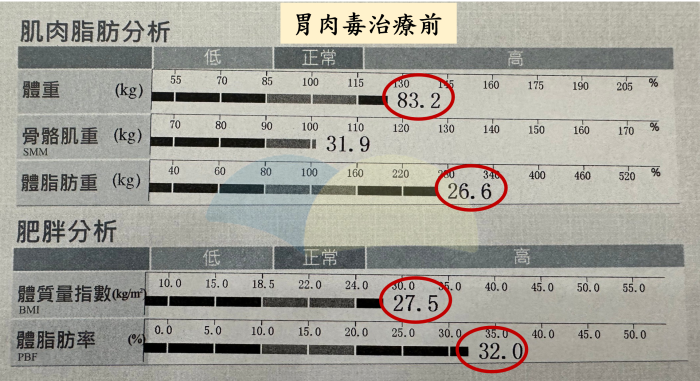經過一整個胃肉毒療程後,阿源順利減下8.9公斤的體重,體脂肪率降了6.1%,等於是減下7.3公斤的純脂肪。不只是身形變得更好看,血液中的膽固醇以及三酸甘油脂也已經恢復正常,不再是滿江紅!