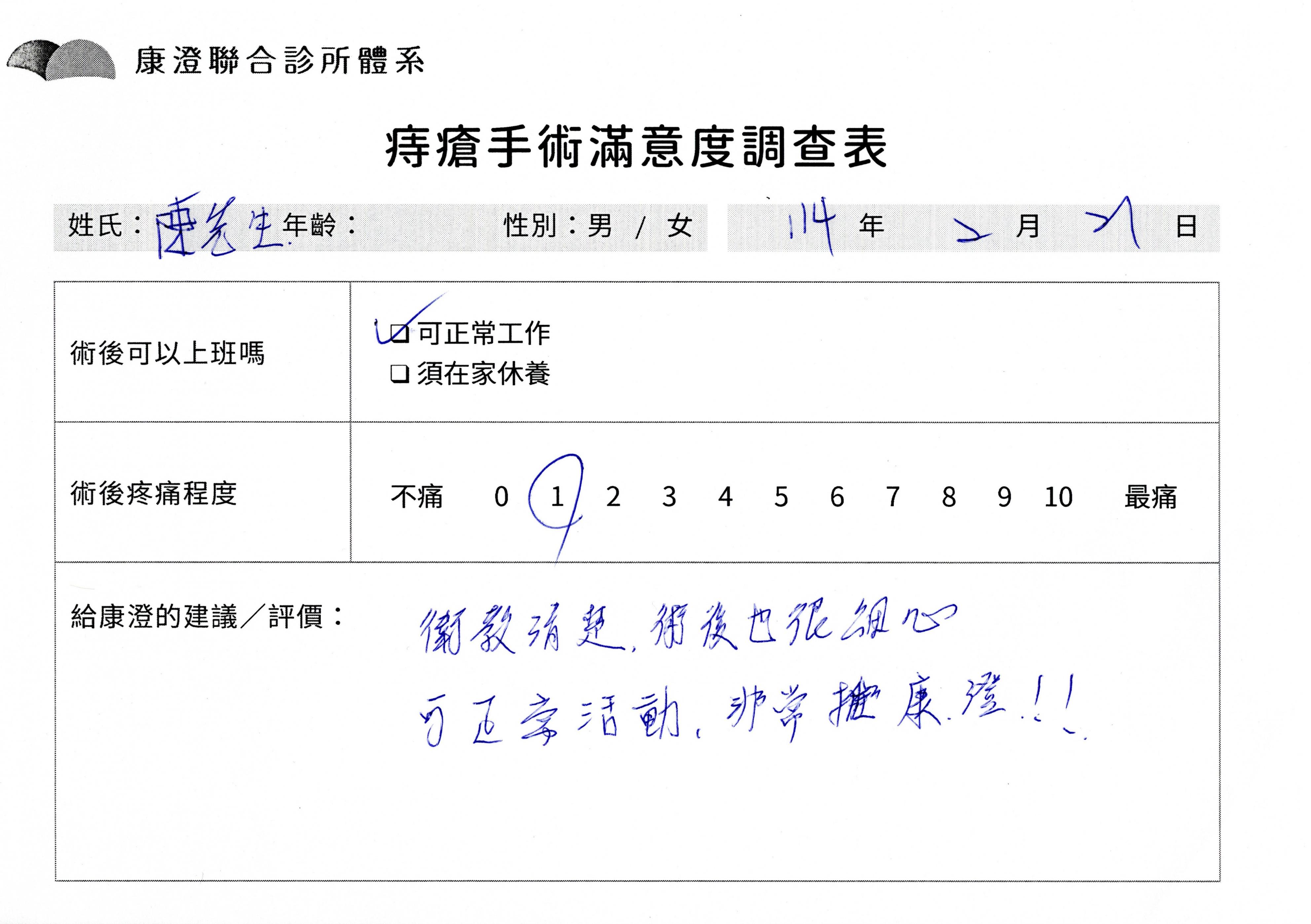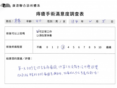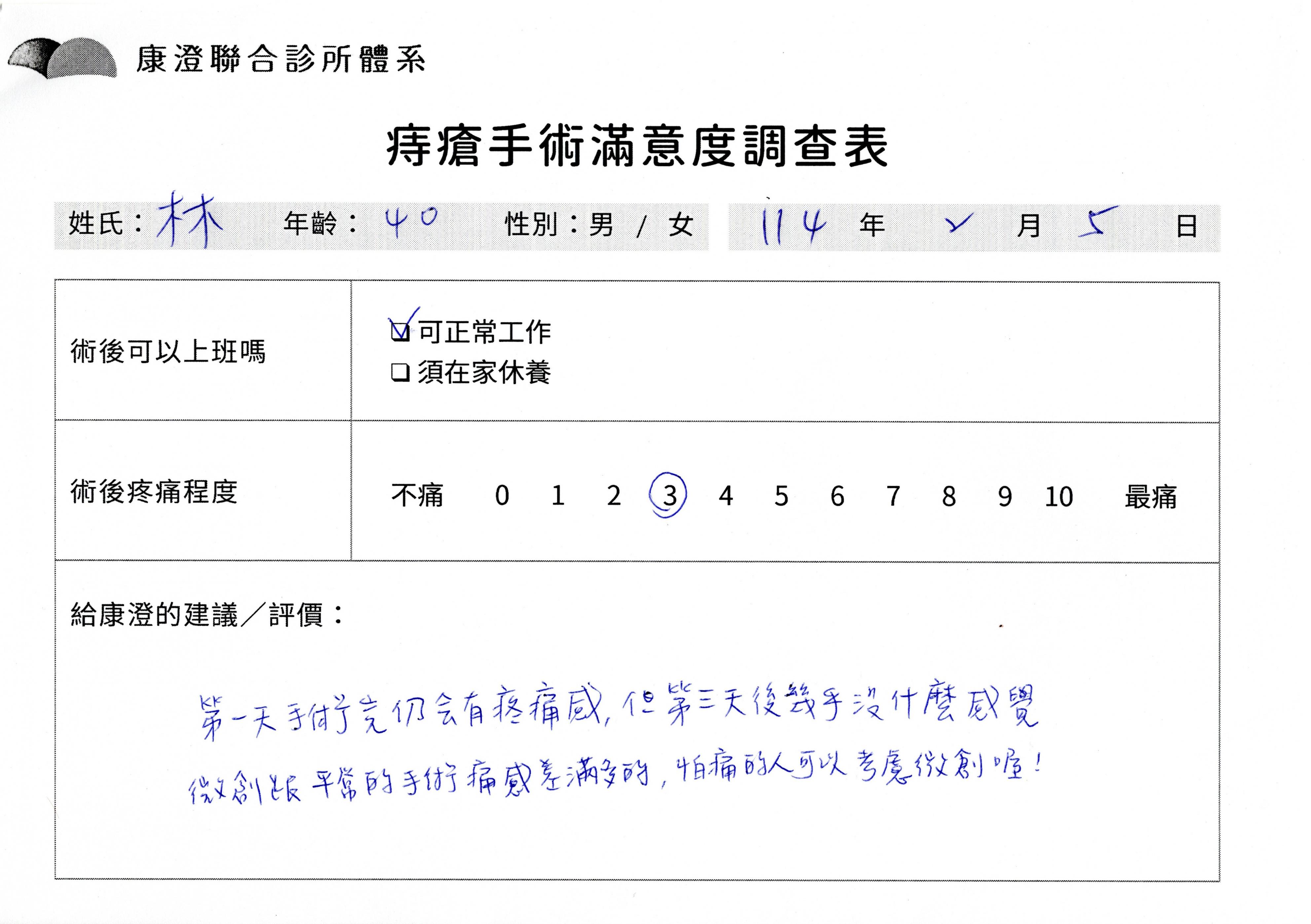「困擾了20多年的三期內痔,終於在幾天內就解決了,原以為會很疼痛的手術及復原過程,結果真是神奇 啊!不會痛呢!長效針應該是有用的,前幾天主要是腫脹,感謝林醫師,以及術後時時電話關心的小護士們,很棒!」