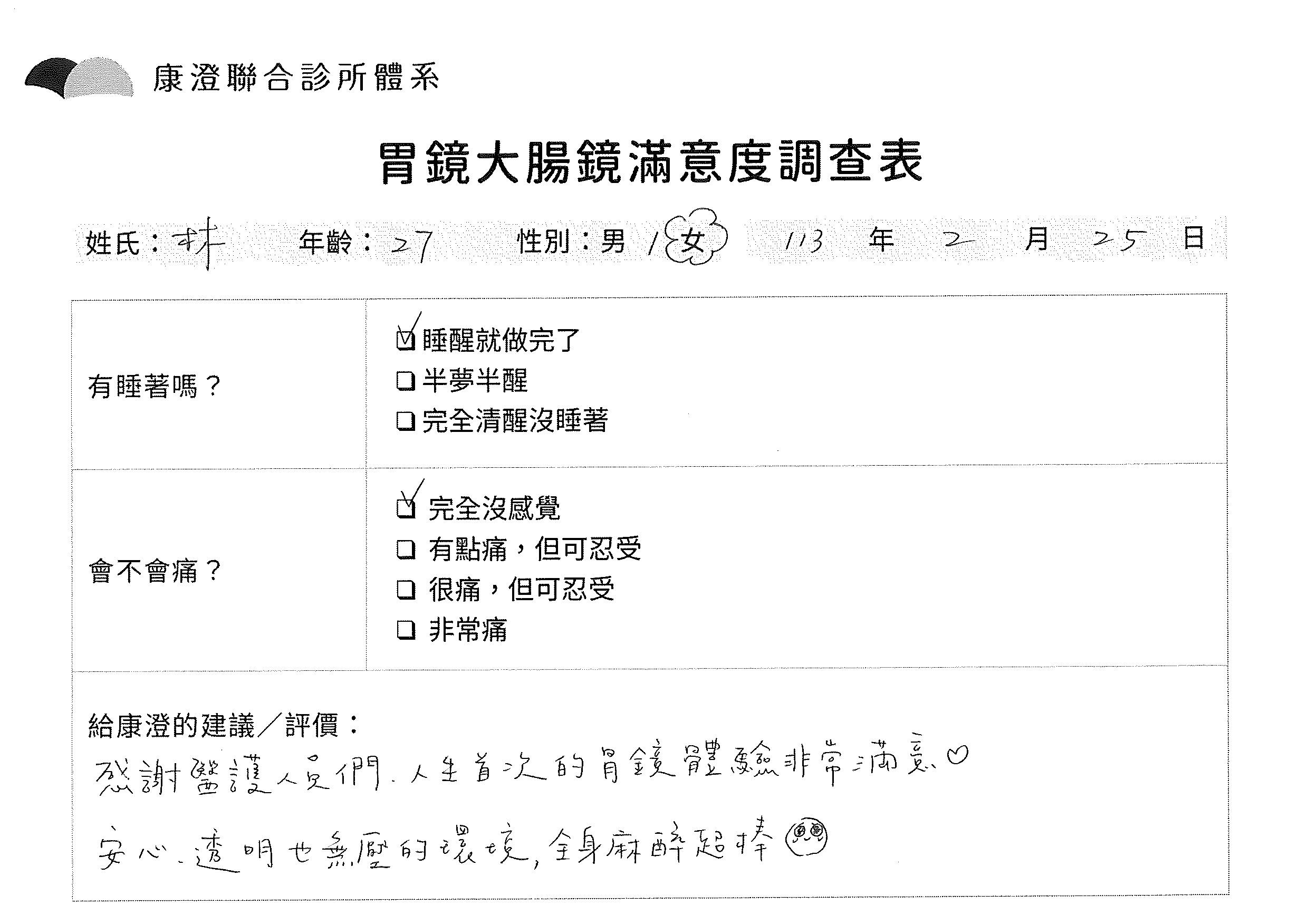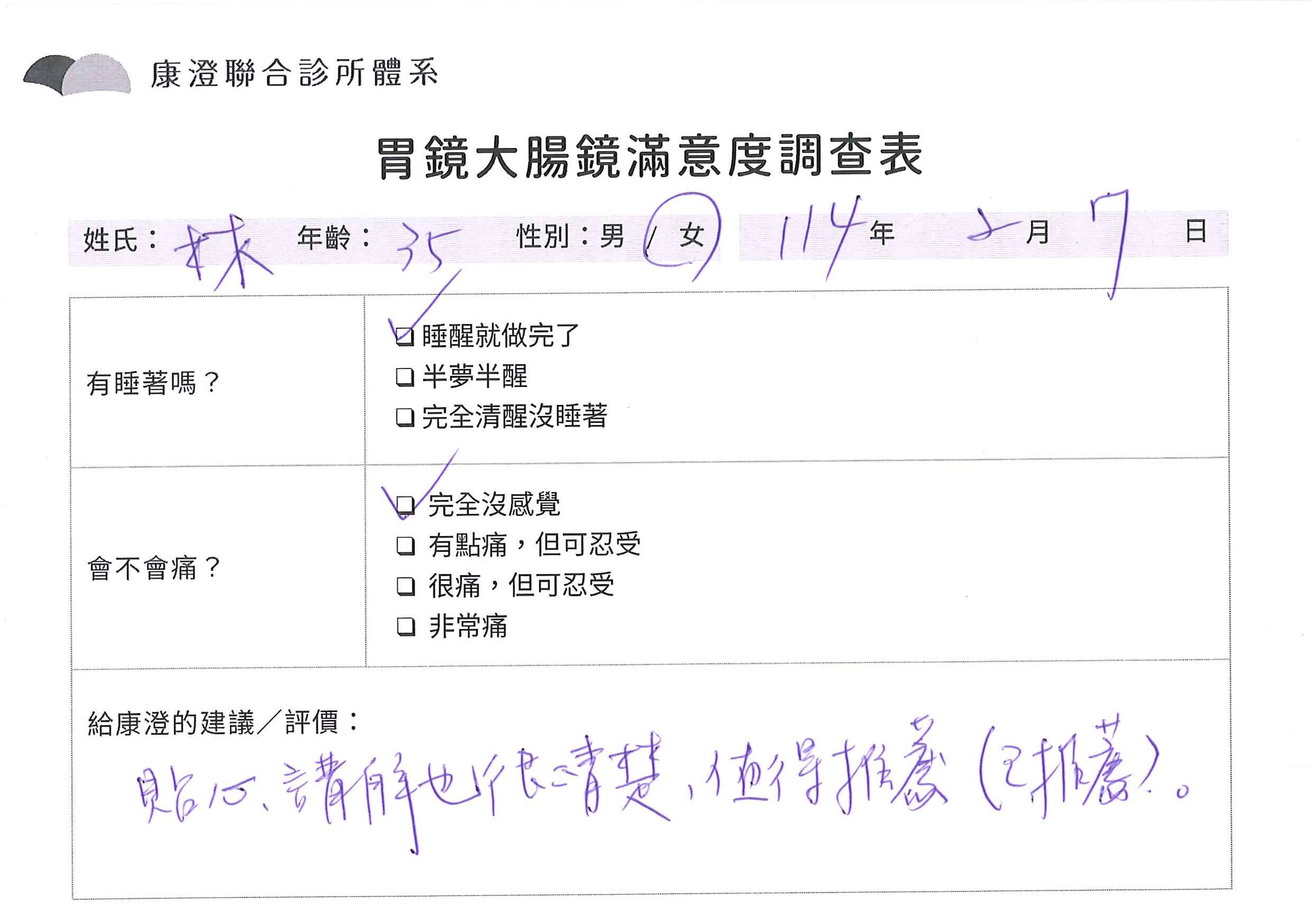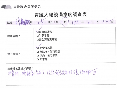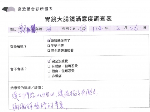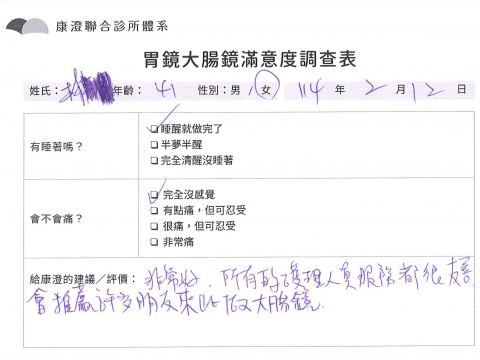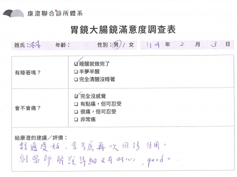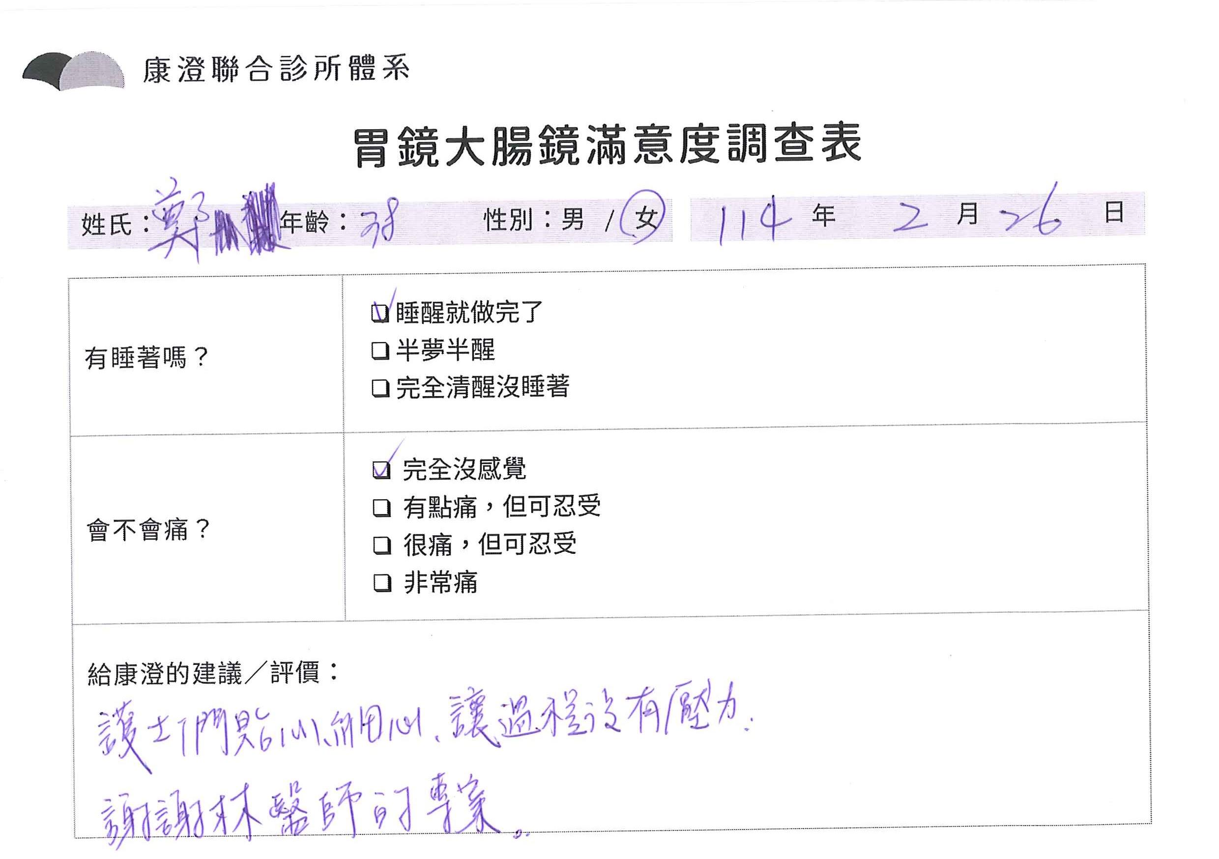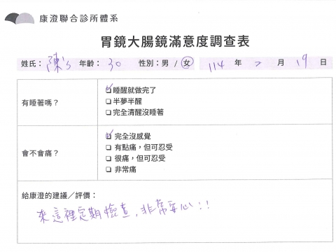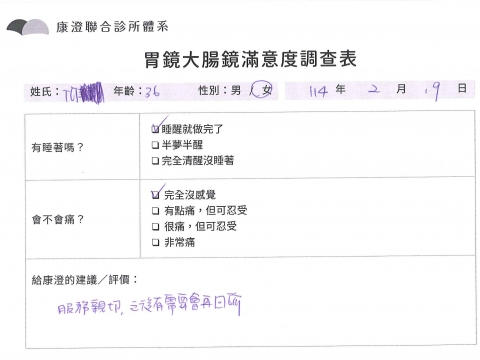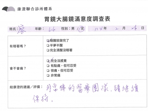 「定期穩定在櫃診所健檢,腸胃鏡的檢查醫療團隊及護理人員後續衛教的處理不輸醫院等級ㆍ專業丶舒適丶 安心,整個療程無痛,護理人員親切可降低檢查的緊張感,非常感謝!」