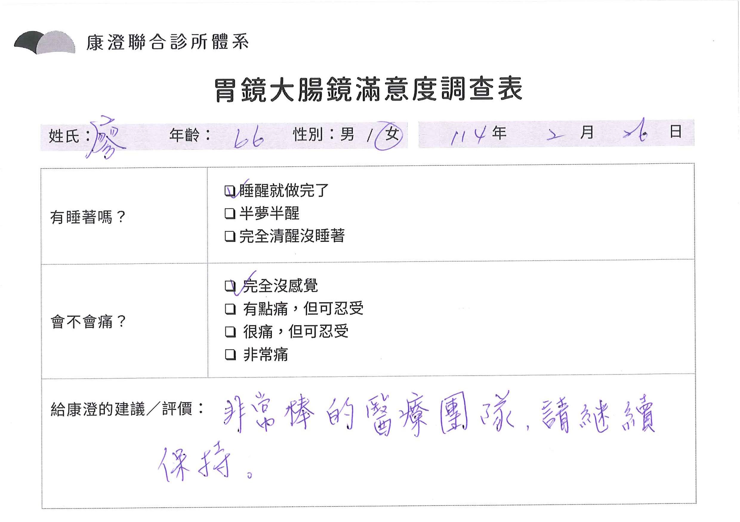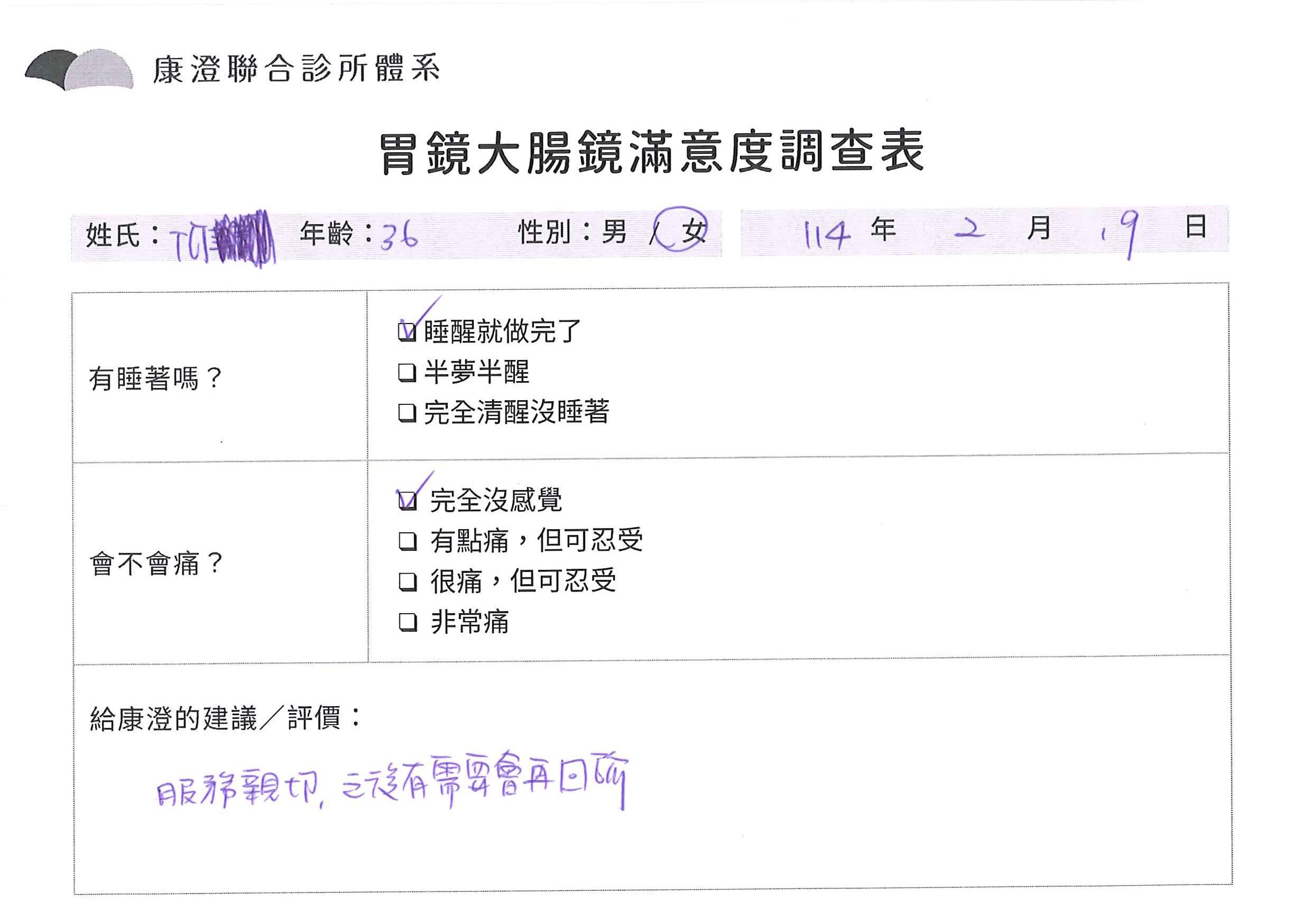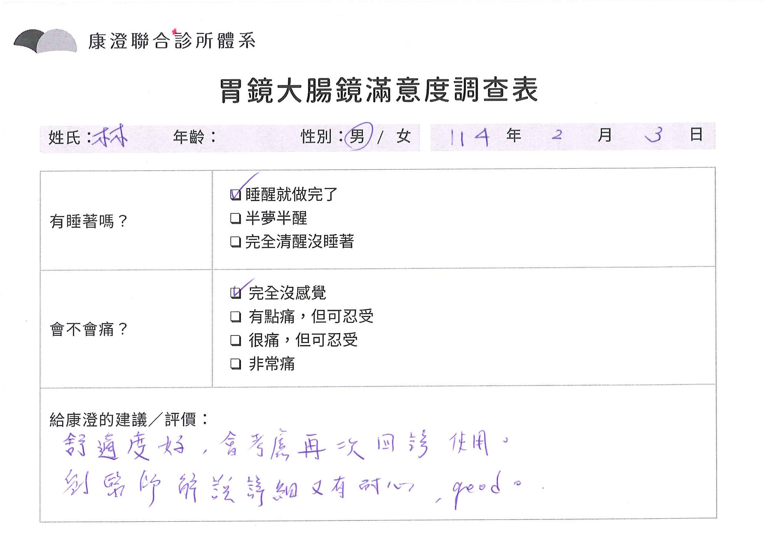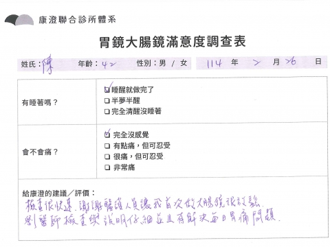 「定期穩定在櫃診所健檢,腸胃鏡的檢查醫療團隊及護理人員後續衛教的處理不輸醫院等級ㆍ專業丶舒適丶 安心,整個療程無痛,護理人員親切可降低檢查的緊張感,非常感謝!」