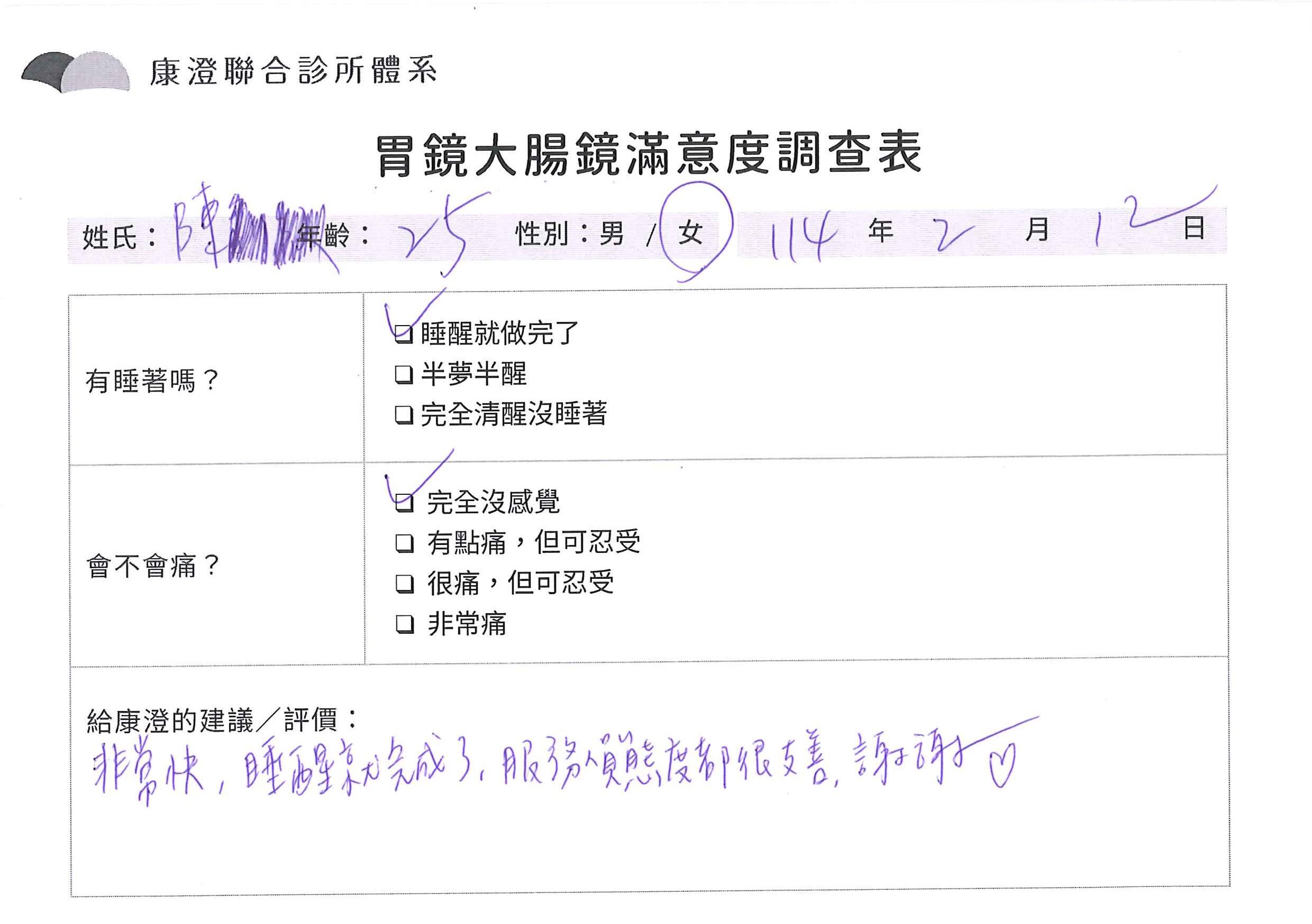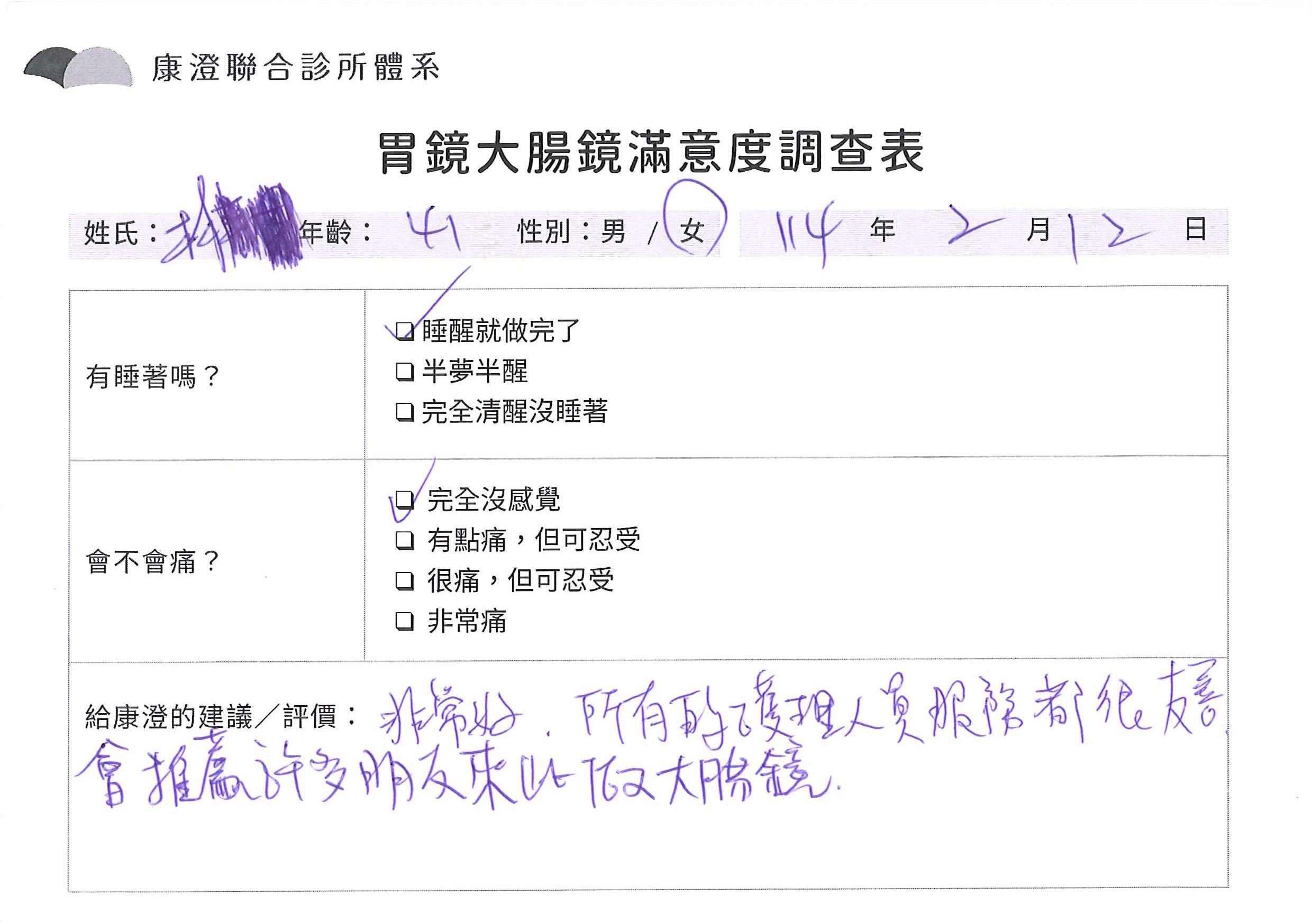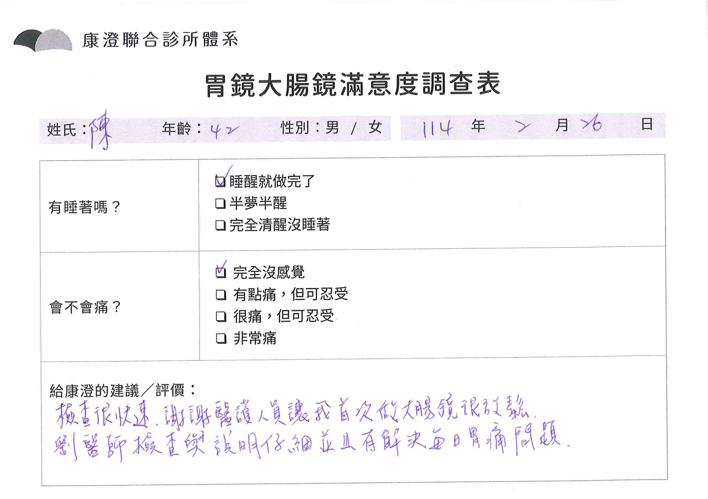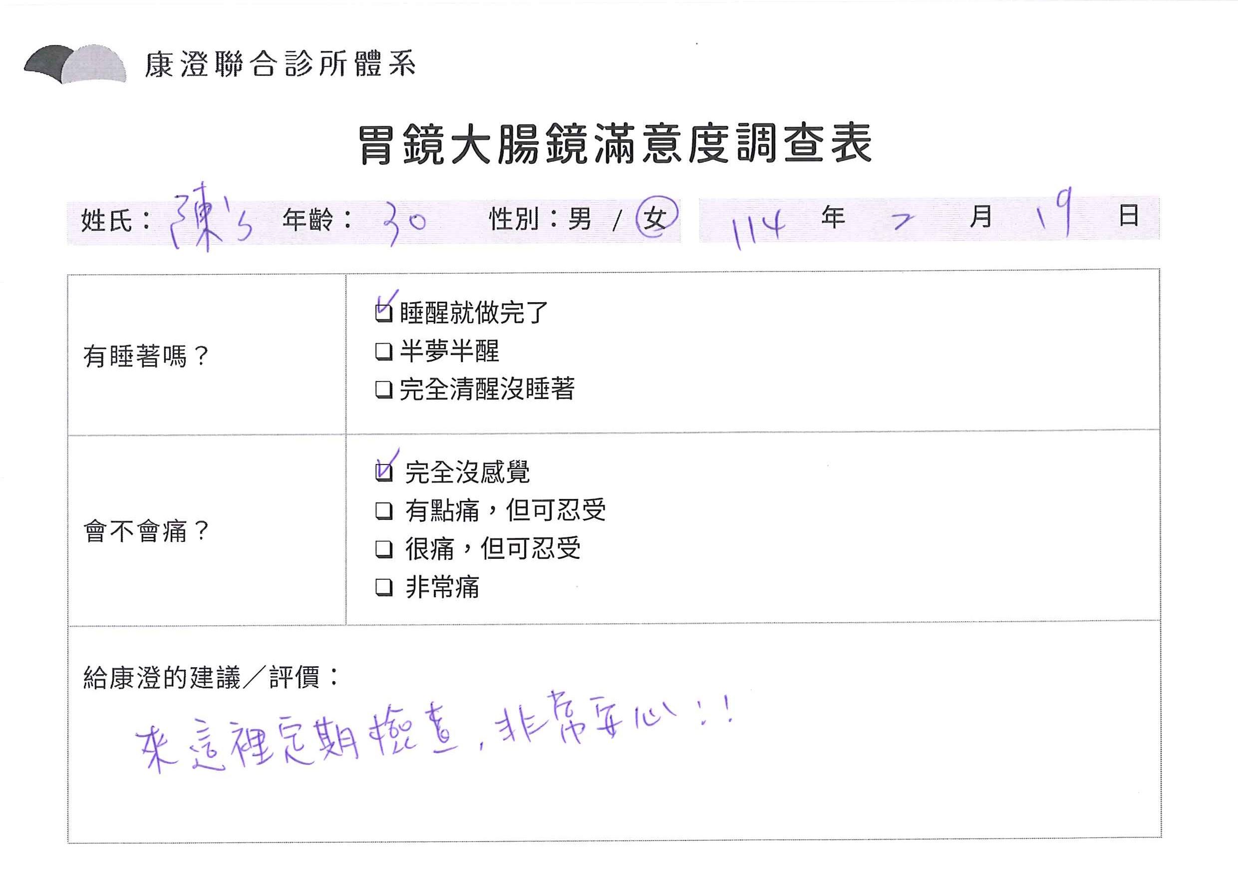 「定期穩定在櫃診所健檢,腸胃鏡的檢查醫療團隊及護理人員後續衛教的處理不輸醫院等級ㆍ專業丶舒適丶 安心,整個療程無痛,護理人員親切可降低檢查的緊張感,非常感謝!」