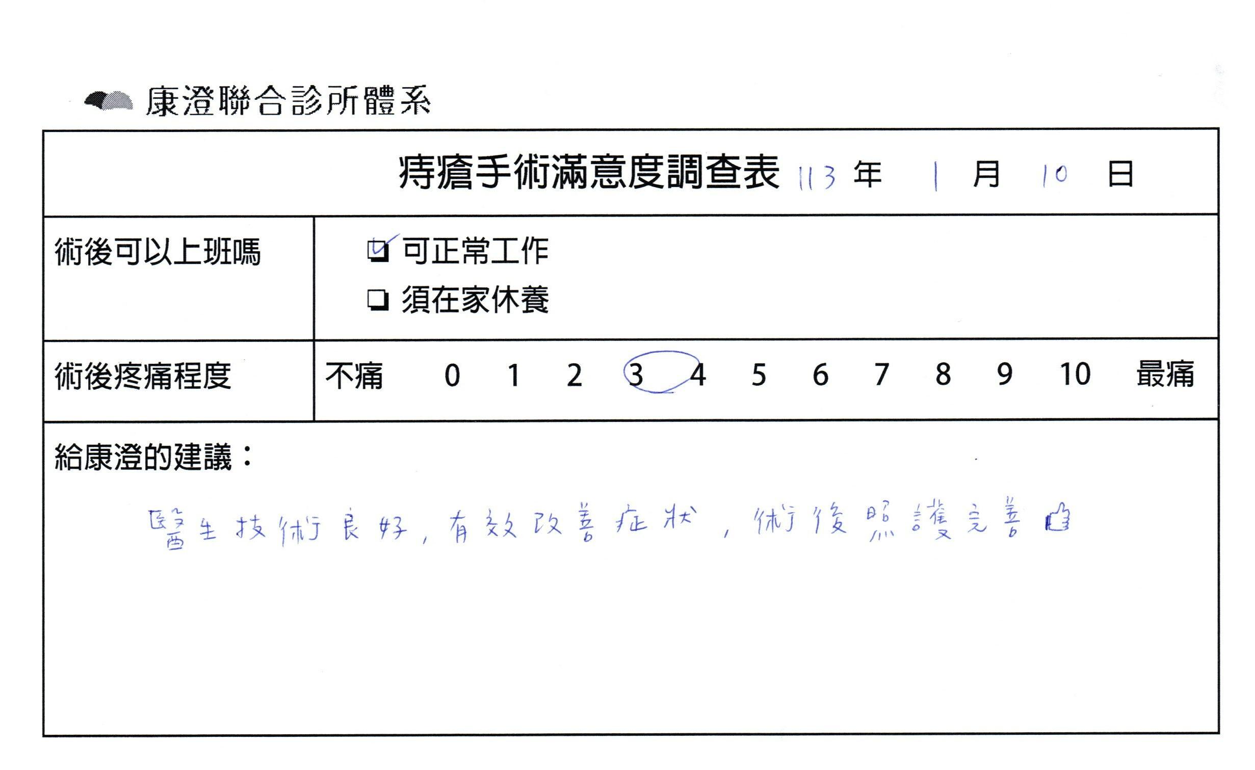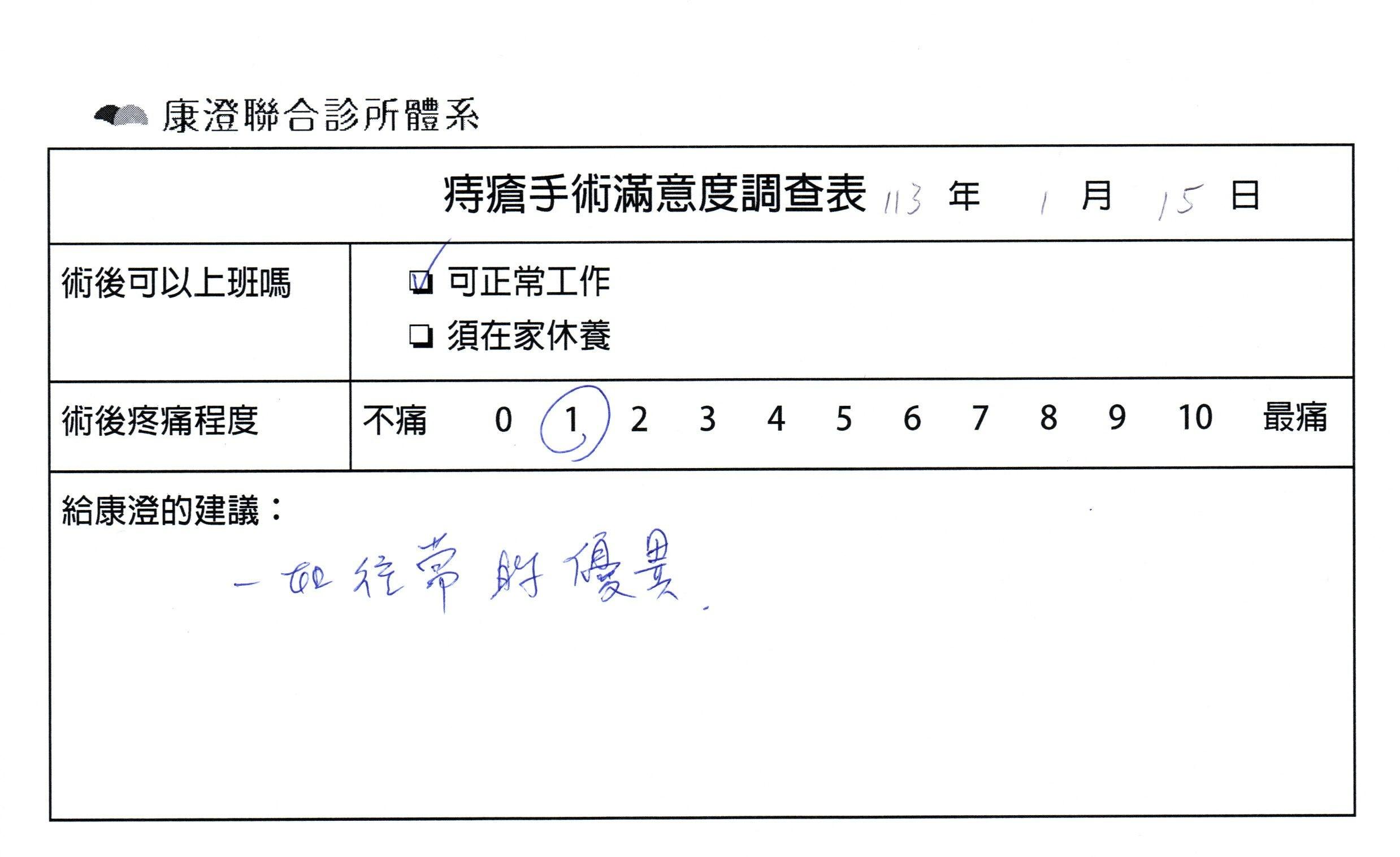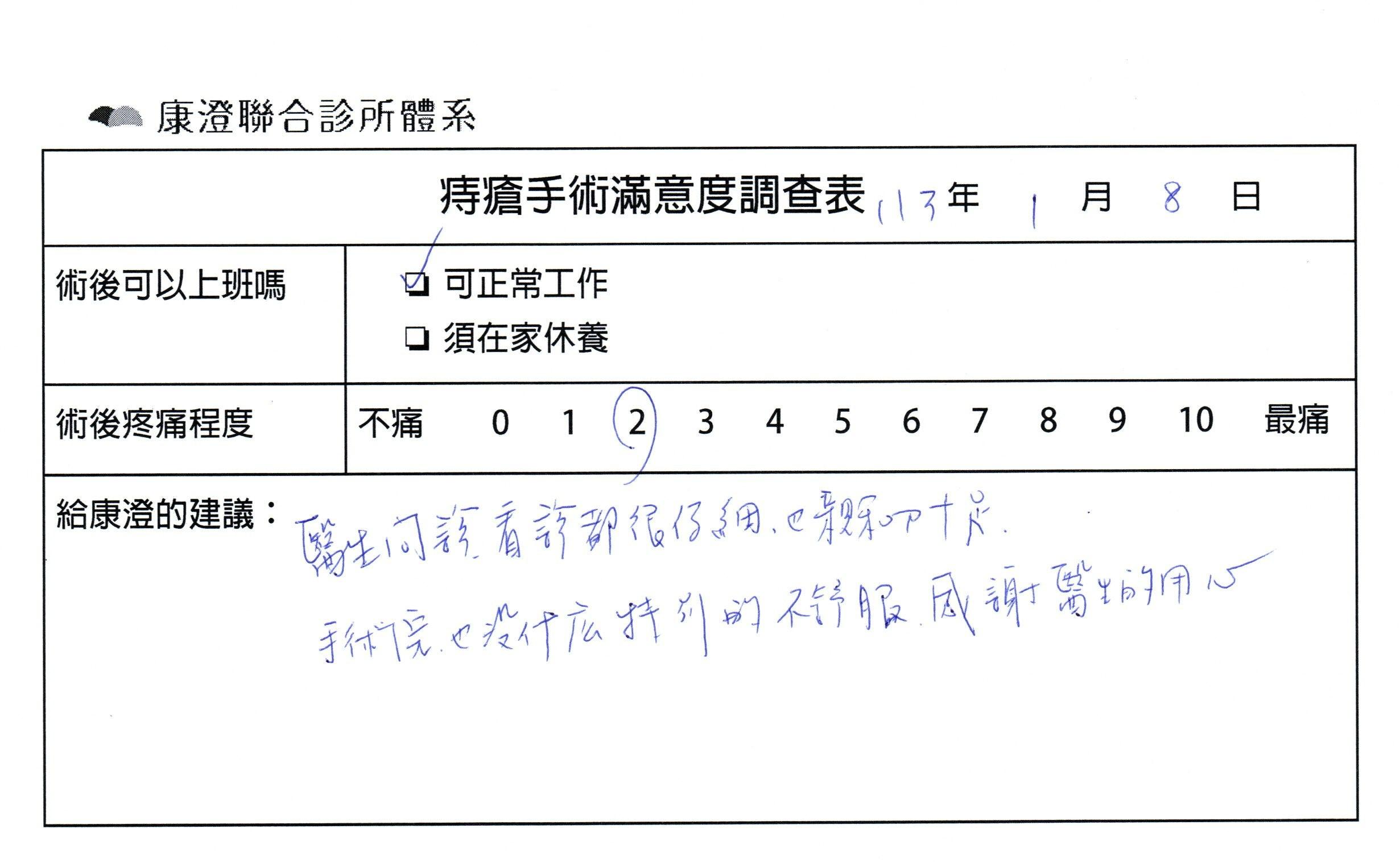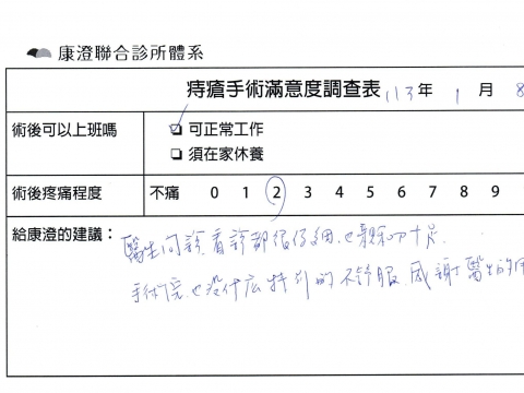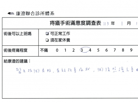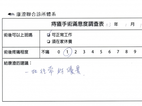 「困擾了20多年的三期內痔,終於在幾天內就解決了,原以為會很疼痛的手術及復原過程,結果真是神奇 啊!不會痛呢!長效針應該是有用的,前幾天主要是腫脹,感謝林醫師,以及術後時時電話關心的小護士們,很棒!」