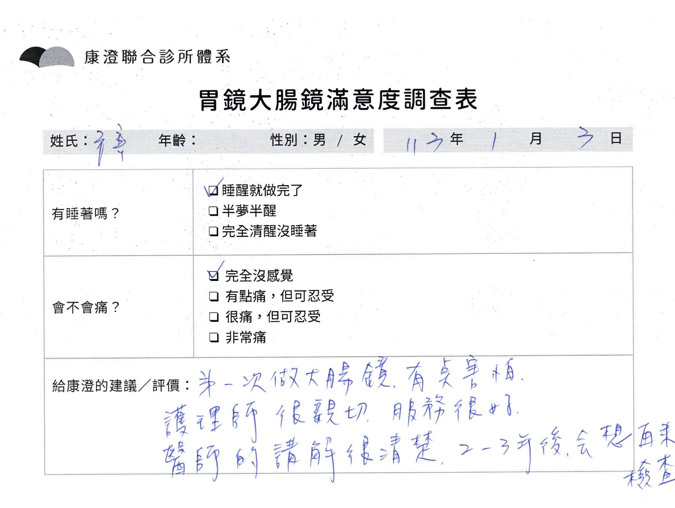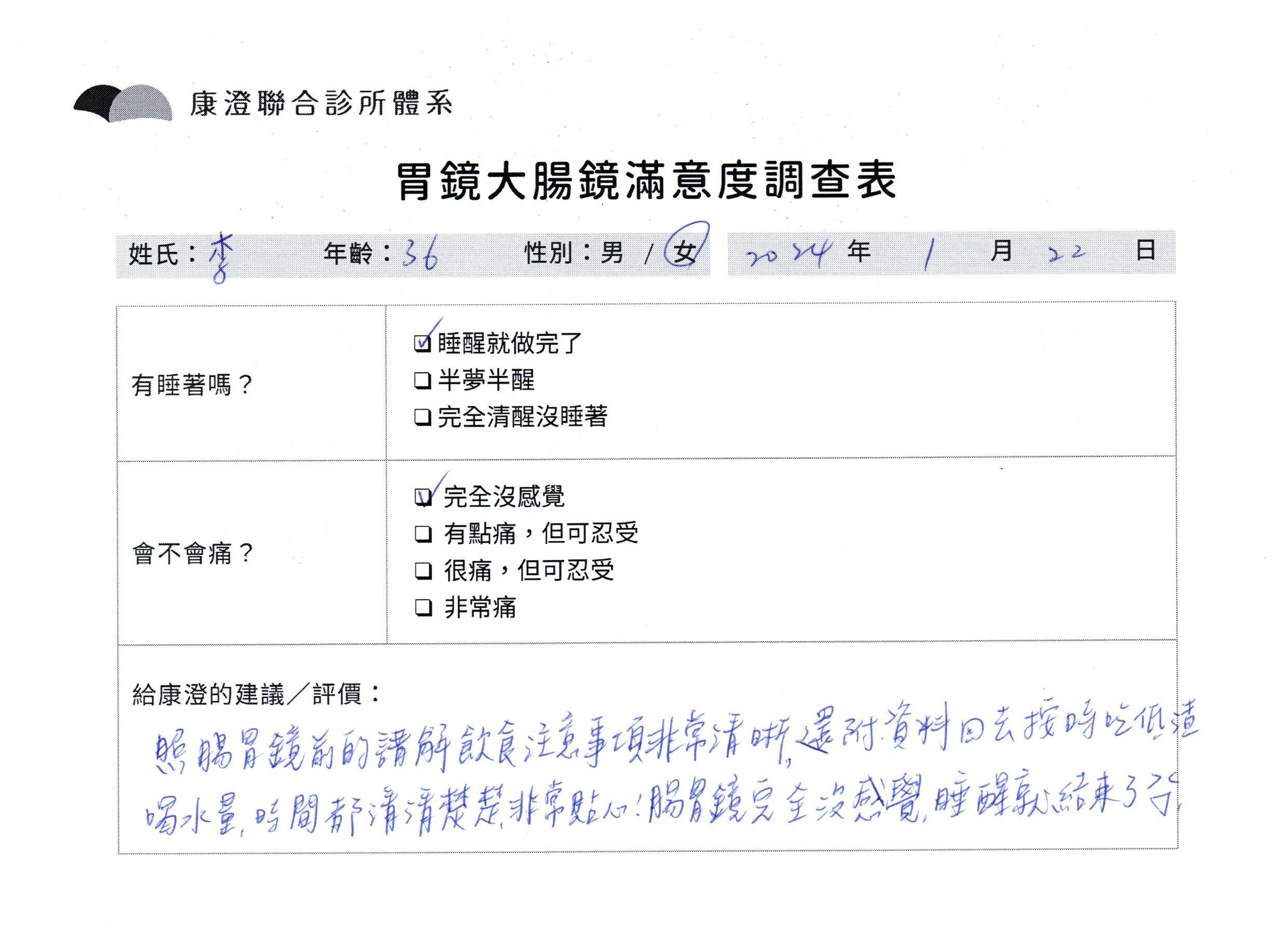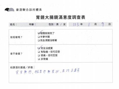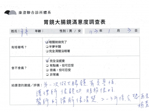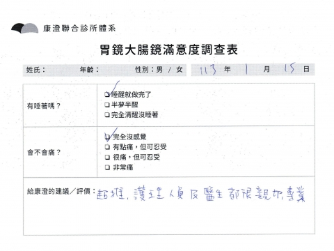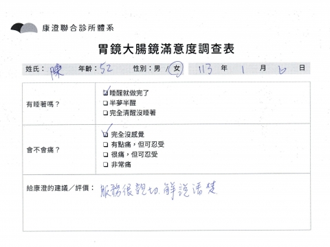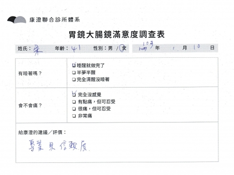 「定期穩定在櫃診所健檢,腸胃鏡的檢查醫療團隊及護理人員後續衛教的處理不輸醫院等級ㆍ專業丶舒適丶 安心,整個療程無痛,護理人員親切可降低檢查的緊張感,非常感謝!」