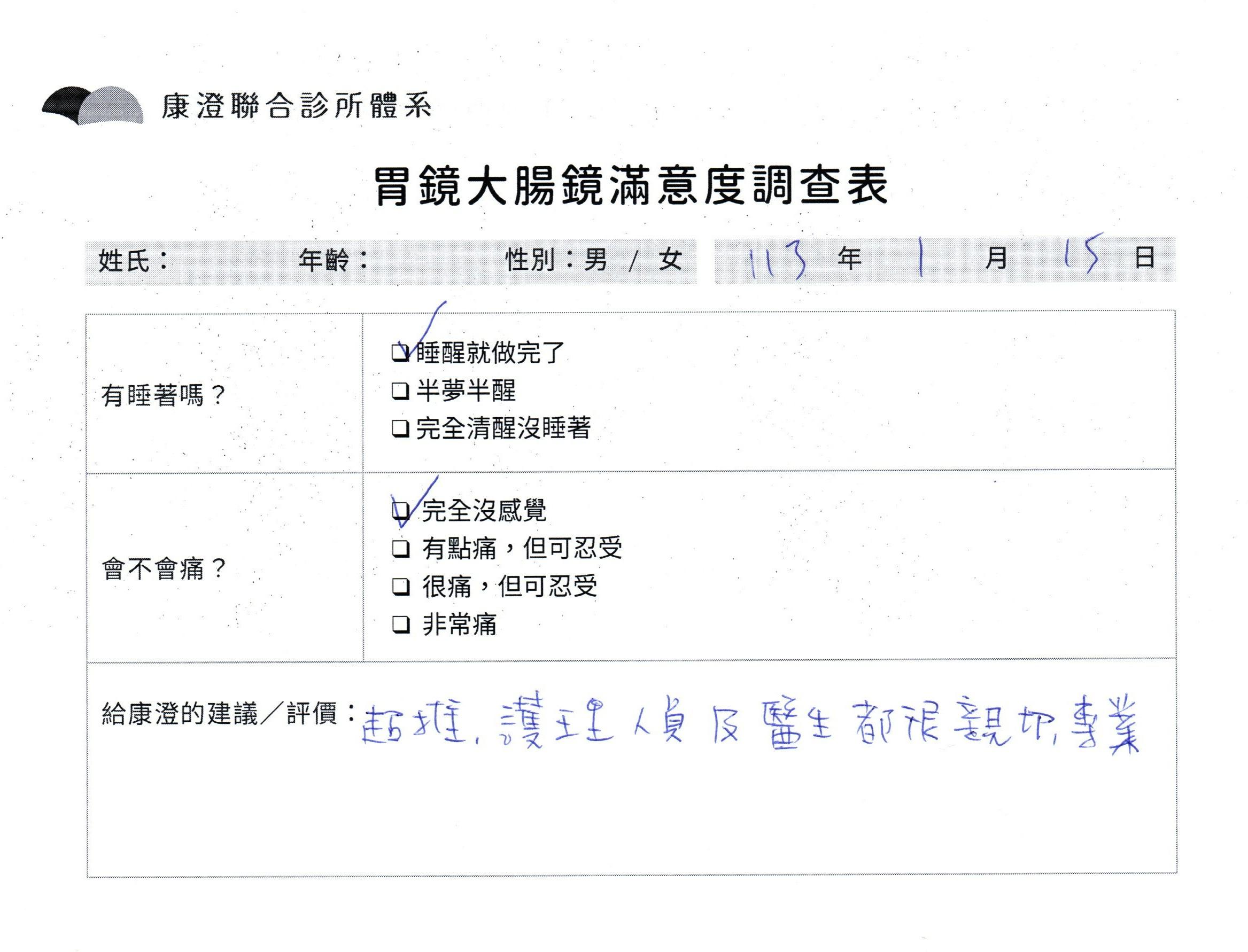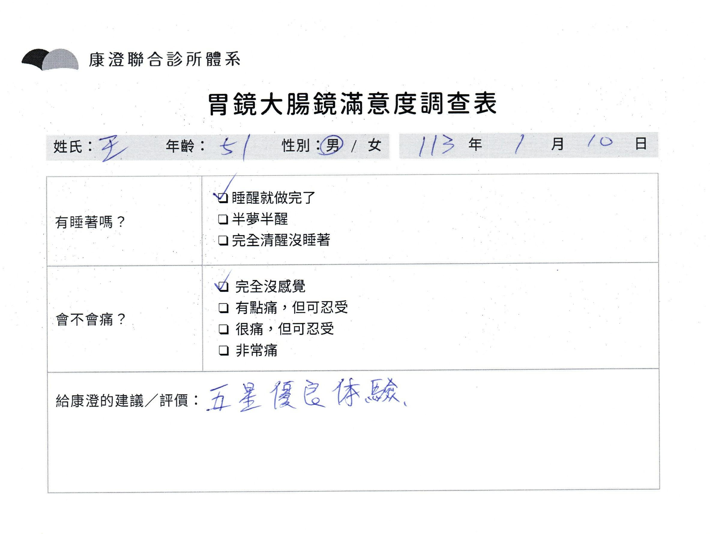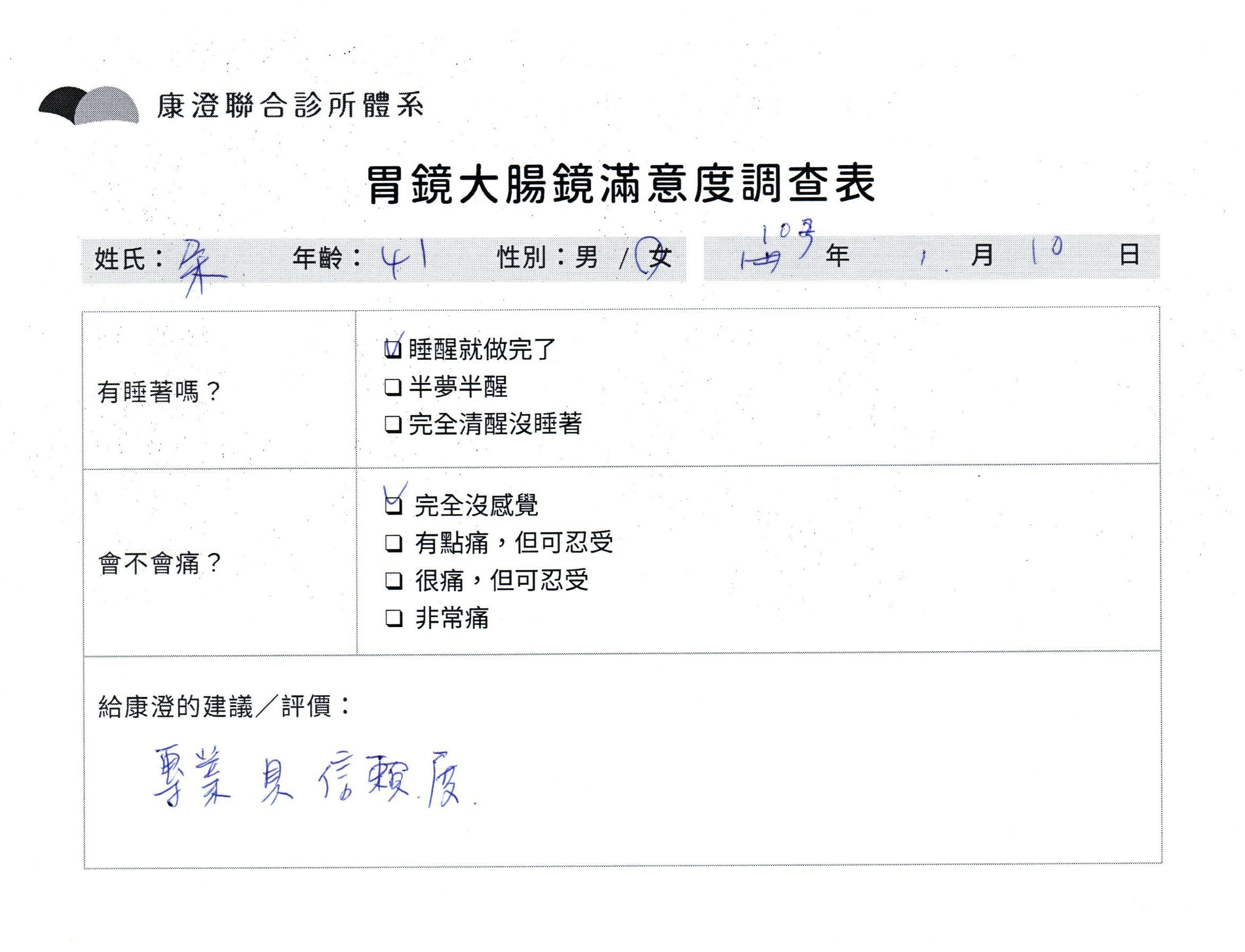 「定期穩定在櫃診所健檢,腸胃鏡的檢查醫療團隊及護理人員後續衛教的處理不輸醫院等級ㆍ專業丶舒適丶 安心,整個療程無痛,護理人員親切可降低檢查的緊張感,非常感謝!」