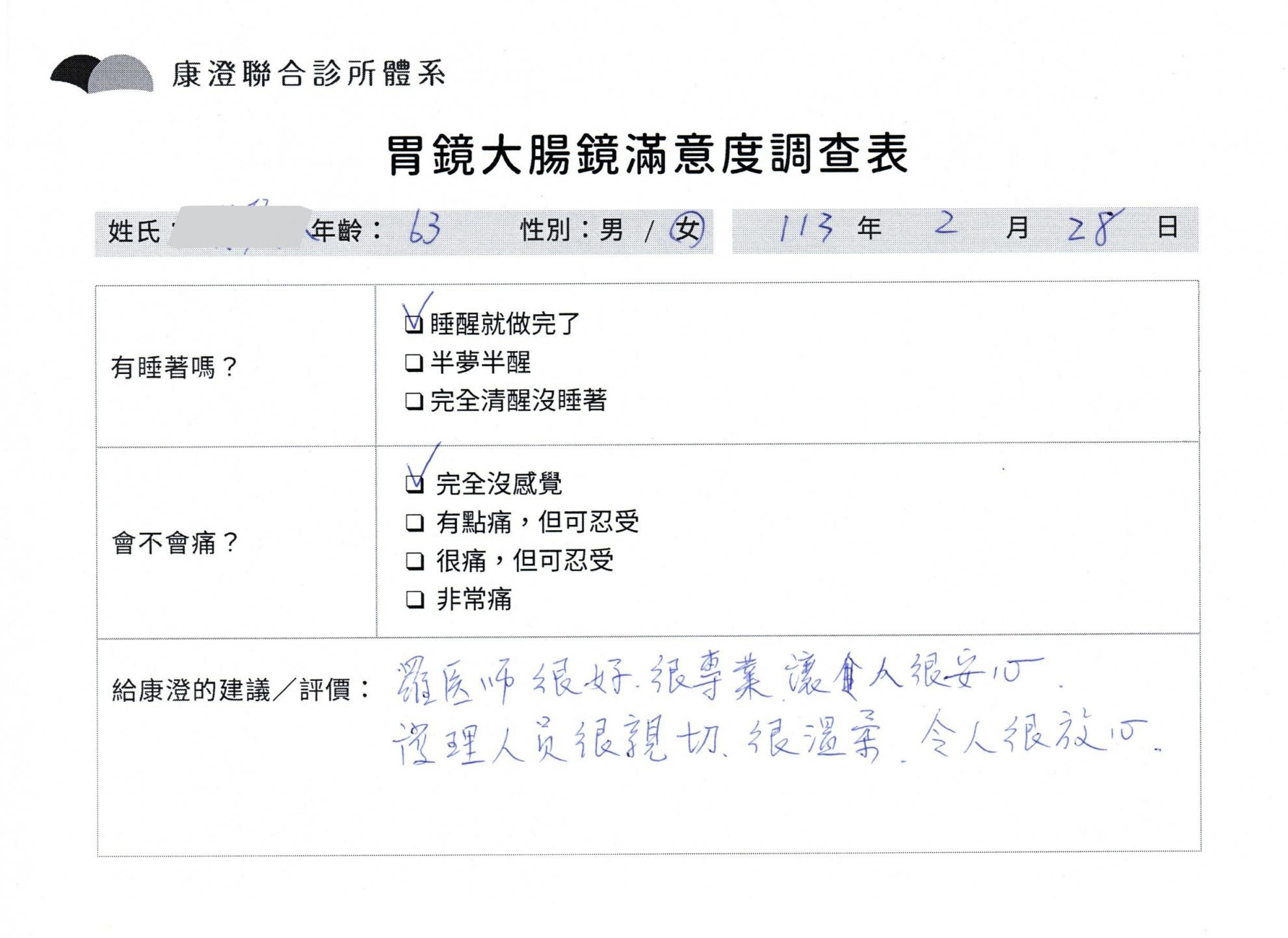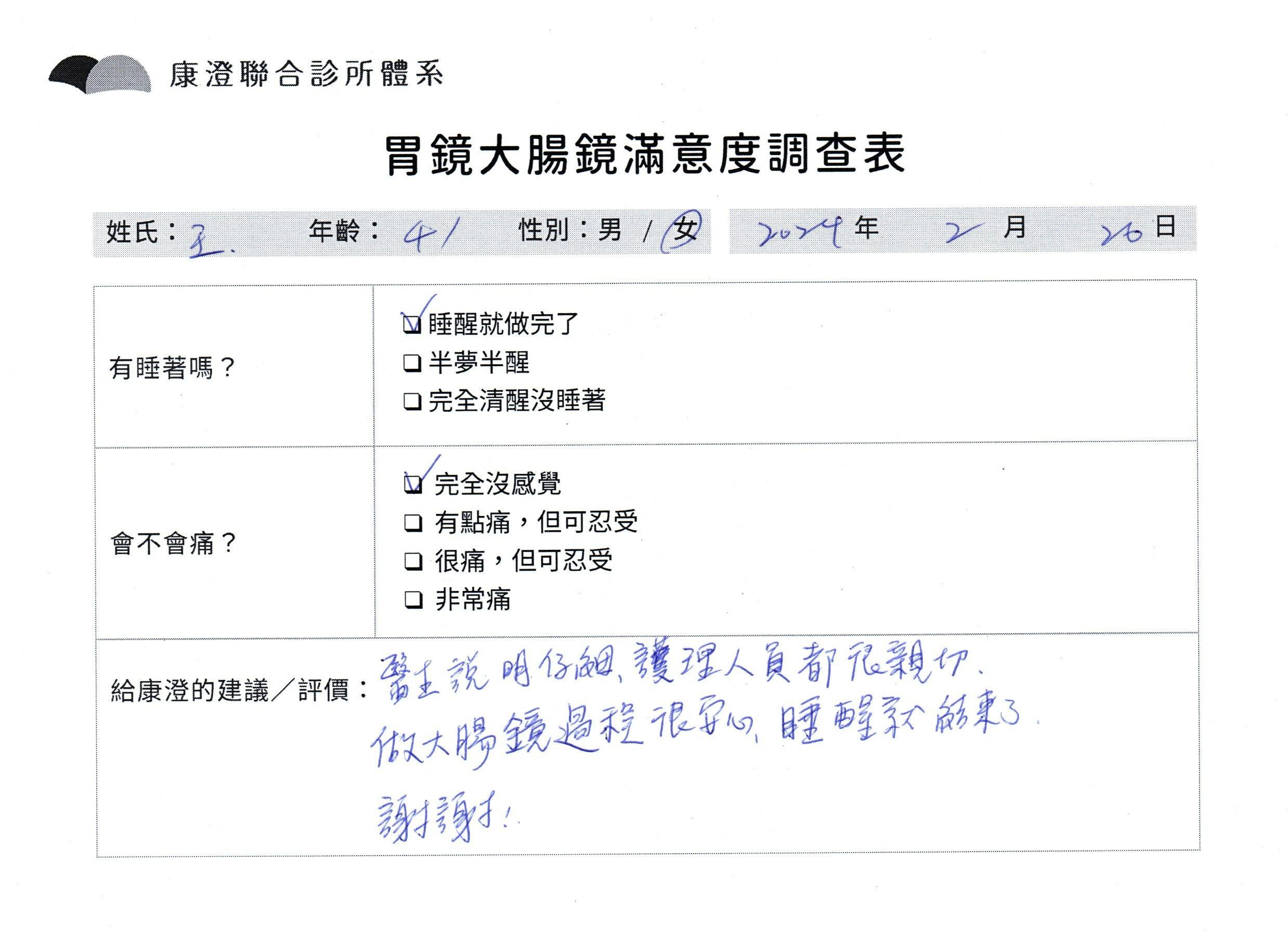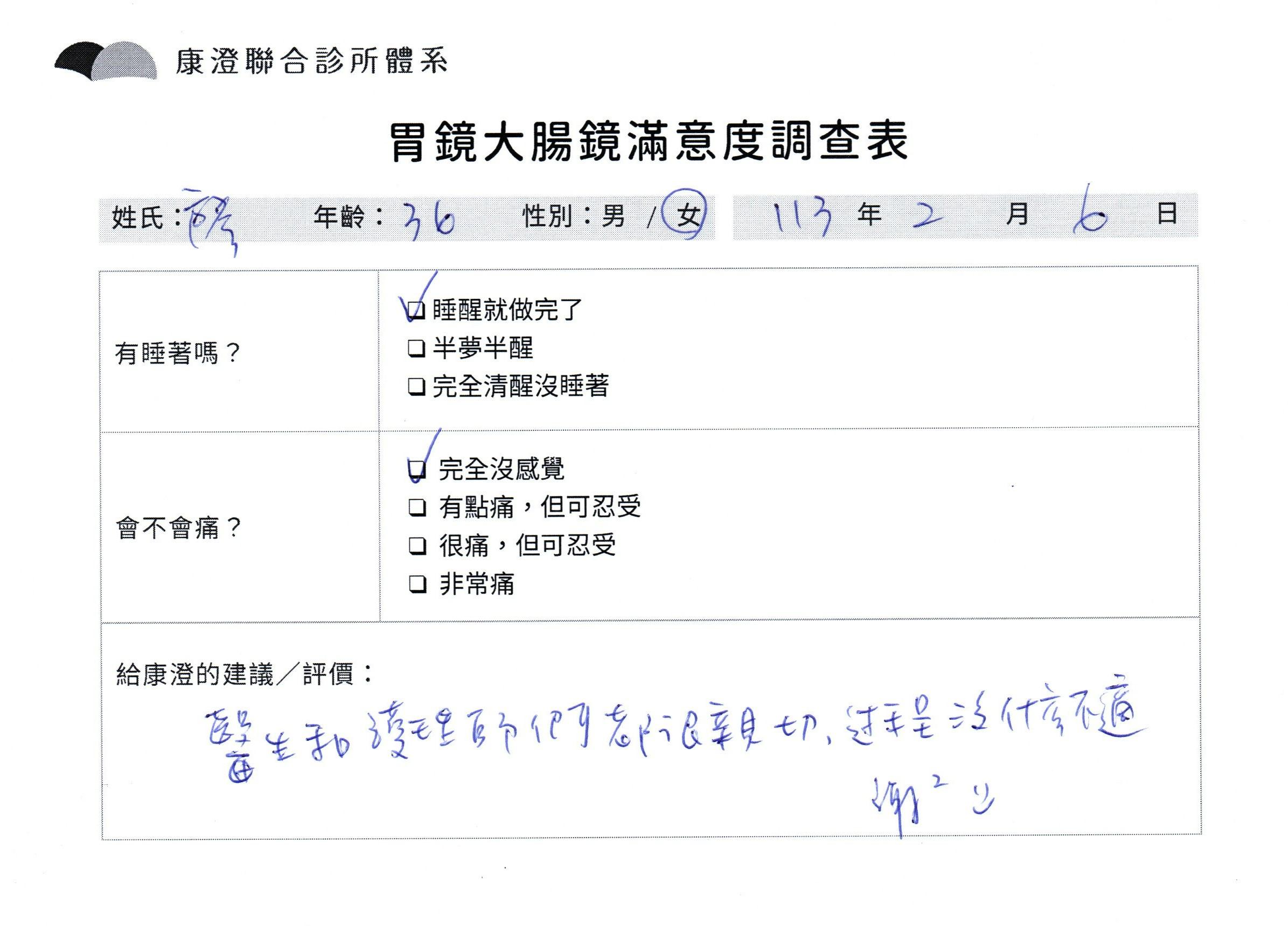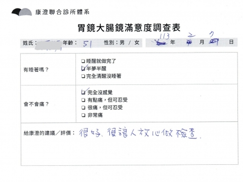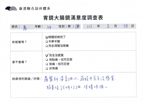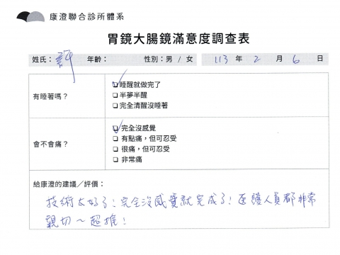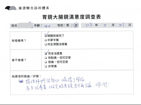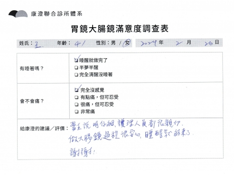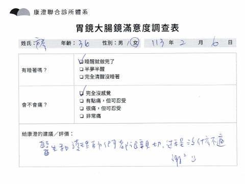 「定期穩定在櫃診所健檢,腸胃鏡的檢查醫療團隊及護理人員後續衛教的處理不輸醫院等級ㆍ專業丶舒適丶 安心,整個療程無痛,護理人員親切可降低檢查的緊張感,非常感謝!」