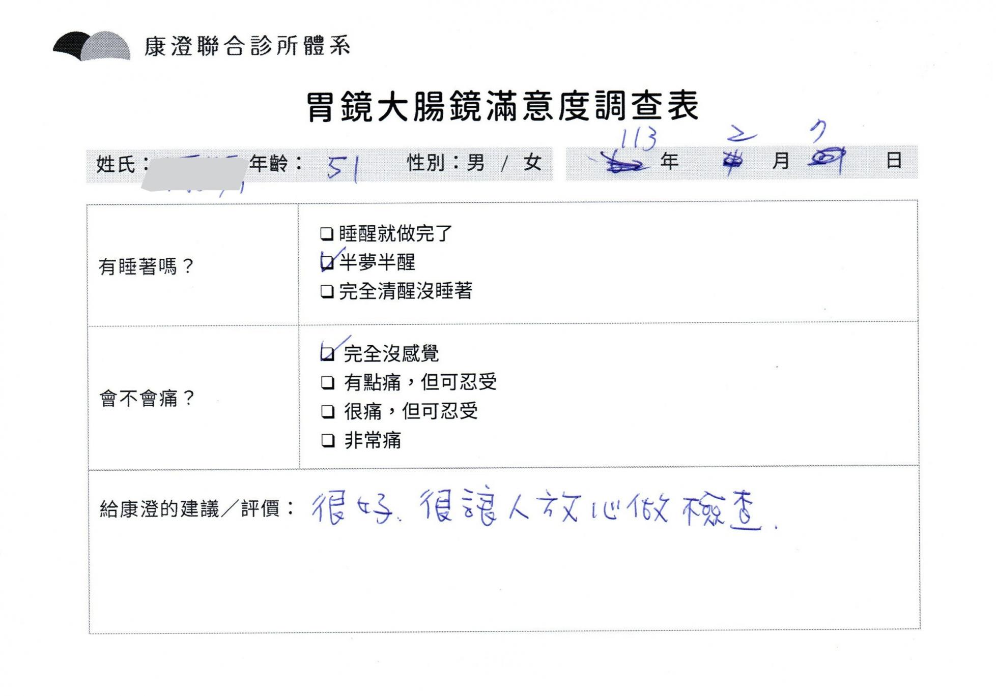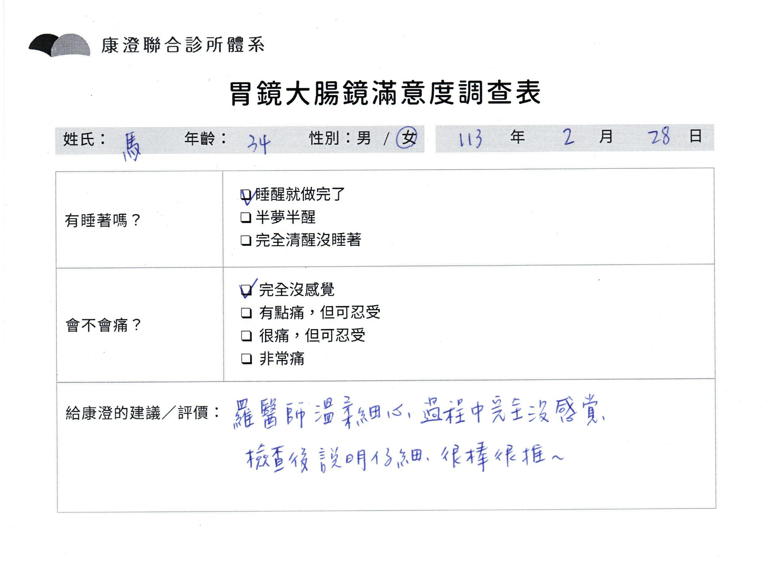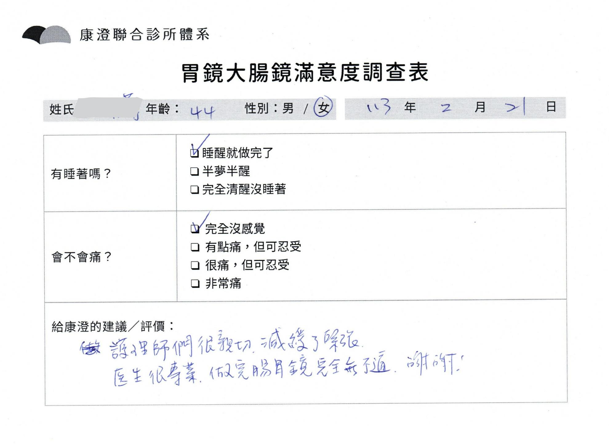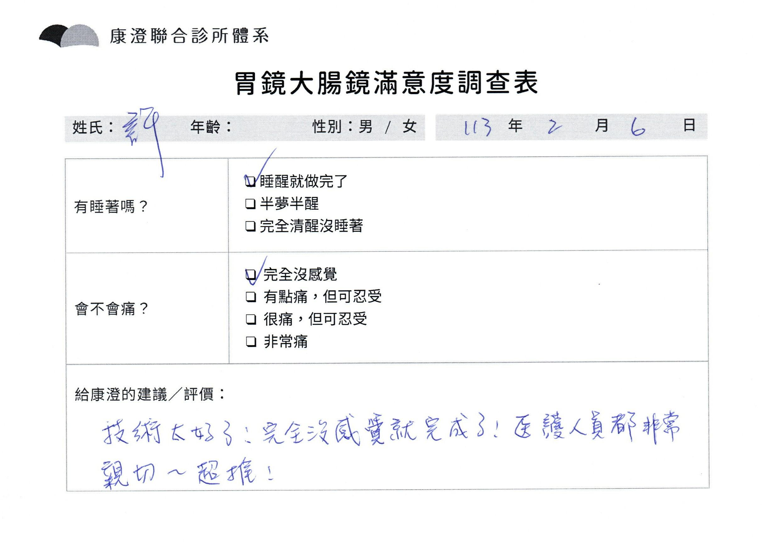 「定期穩定在櫃診所健檢,腸胃鏡的檢查醫療團隊及護理人員後續衛教的處理不輸醫院等級ㆍ專業丶舒適丶 安心,整個療程無痛,護理人員親切可降低檢查的緊張感,非常感謝!」