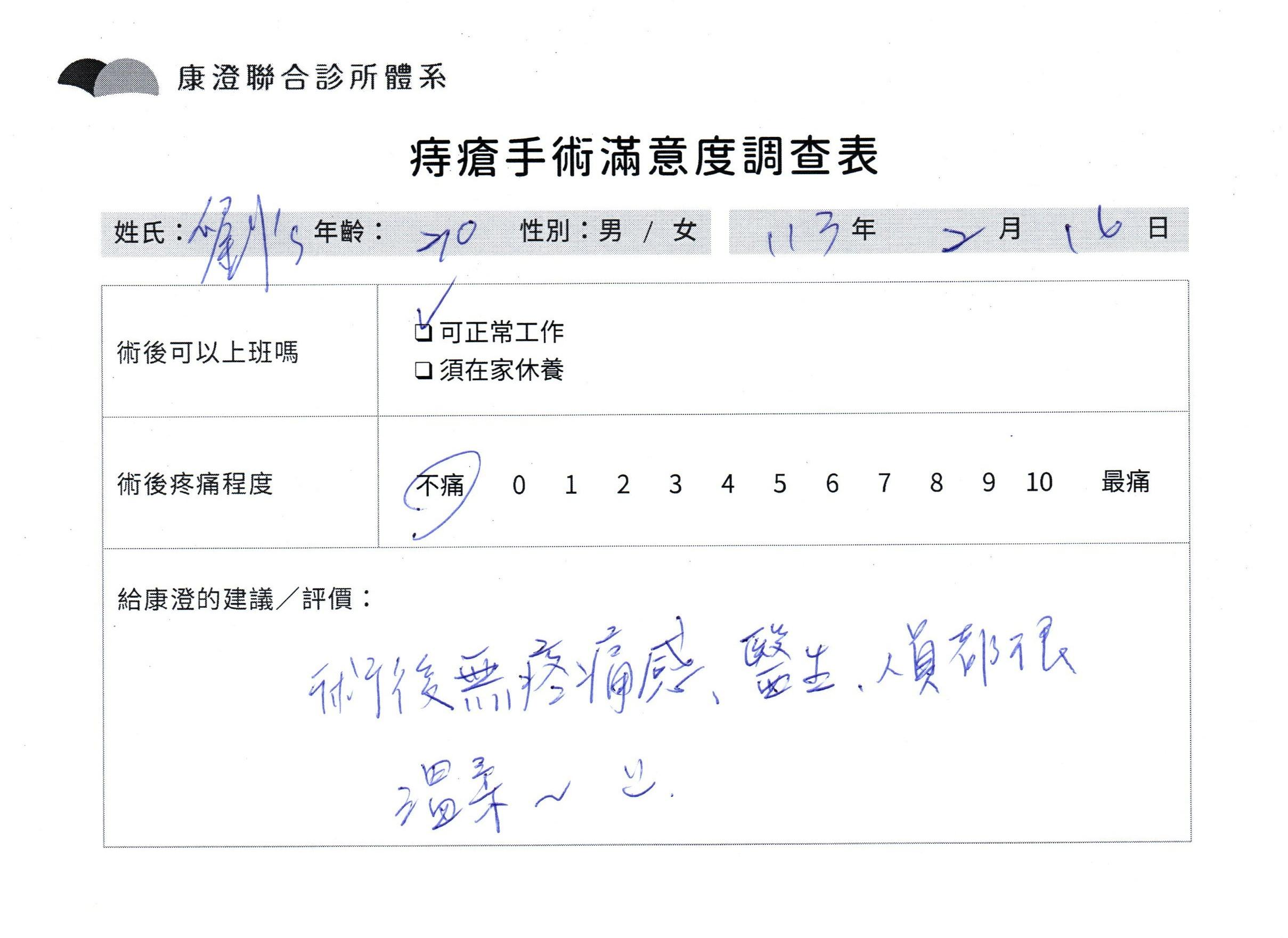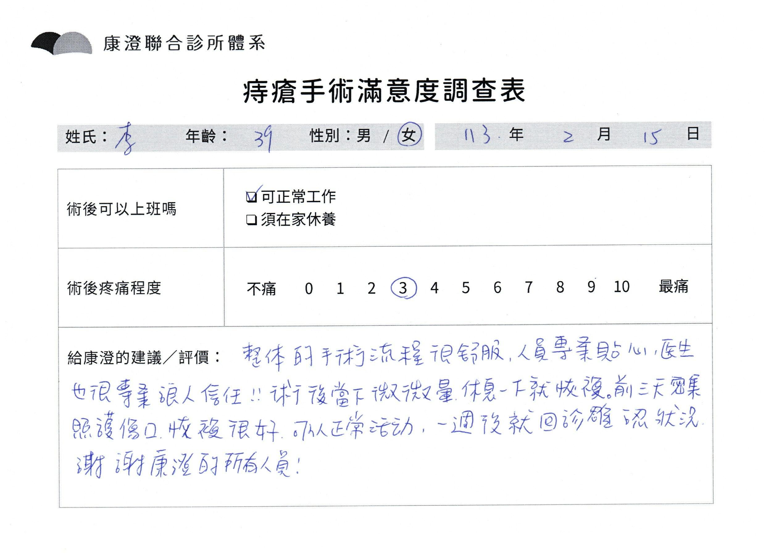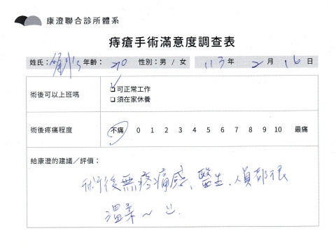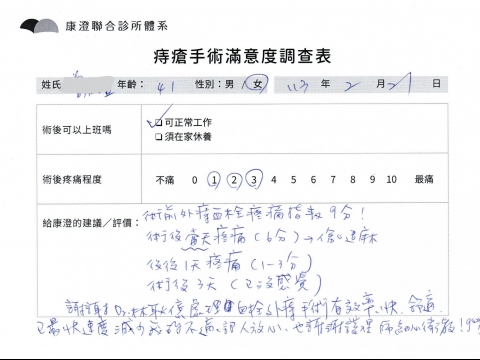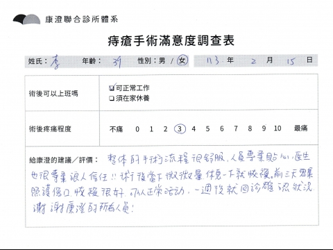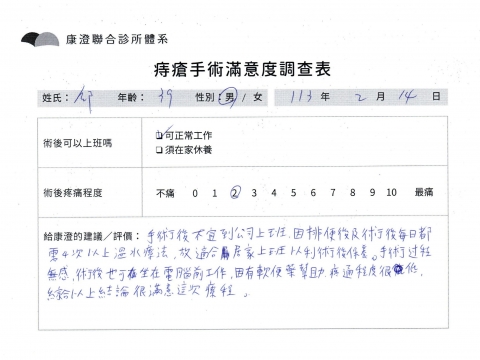 「困擾了20多年的三期內痔,終於在幾天內就解決了,原以為會很疼痛的手術及復原過程,結果真是神奇 啊!不會痛呢!長效針應該是有用的,前幾天主要是腫脹,感謝林醫師,以及術後時時電話關心的小護士們,很棒!」