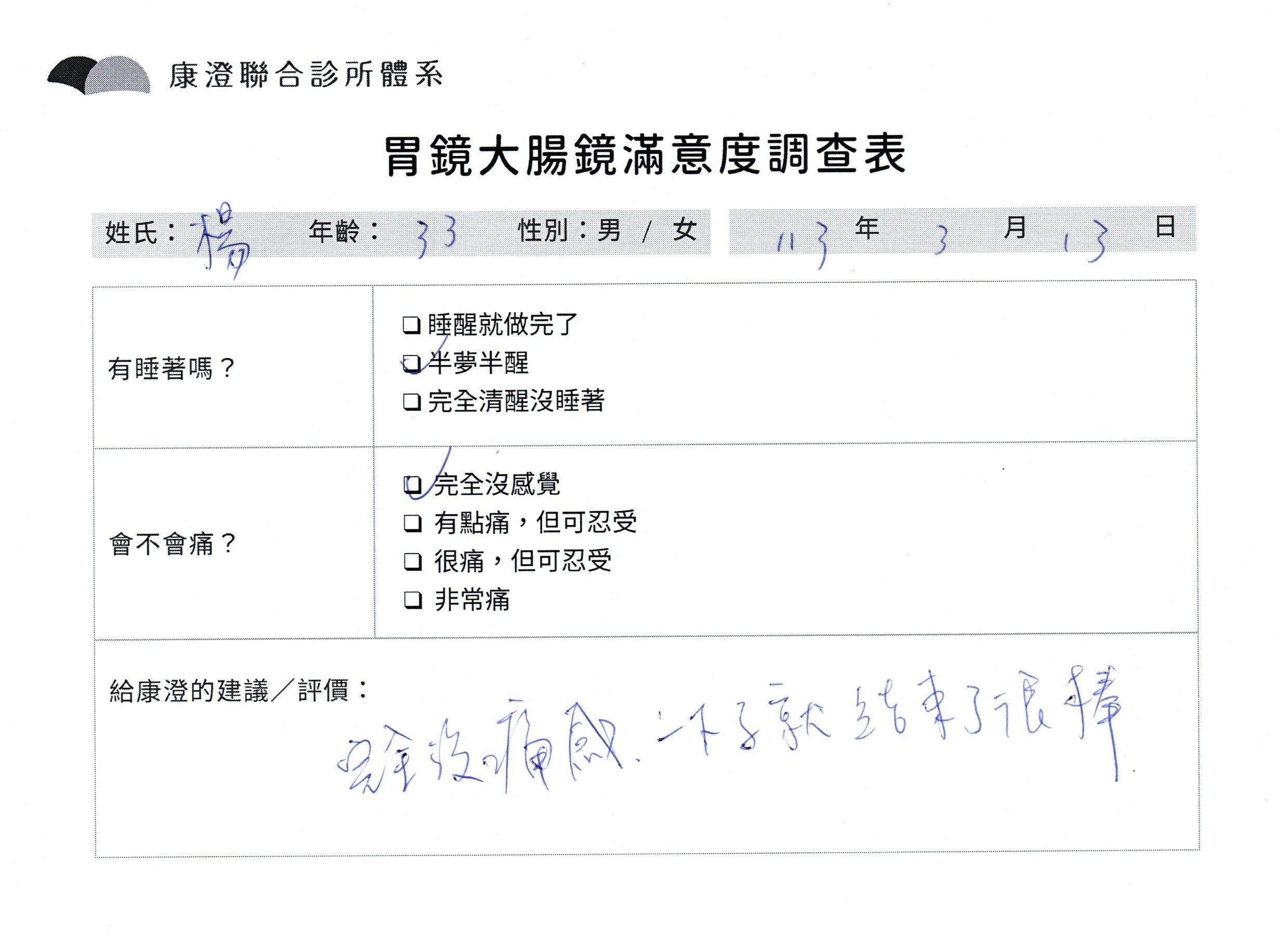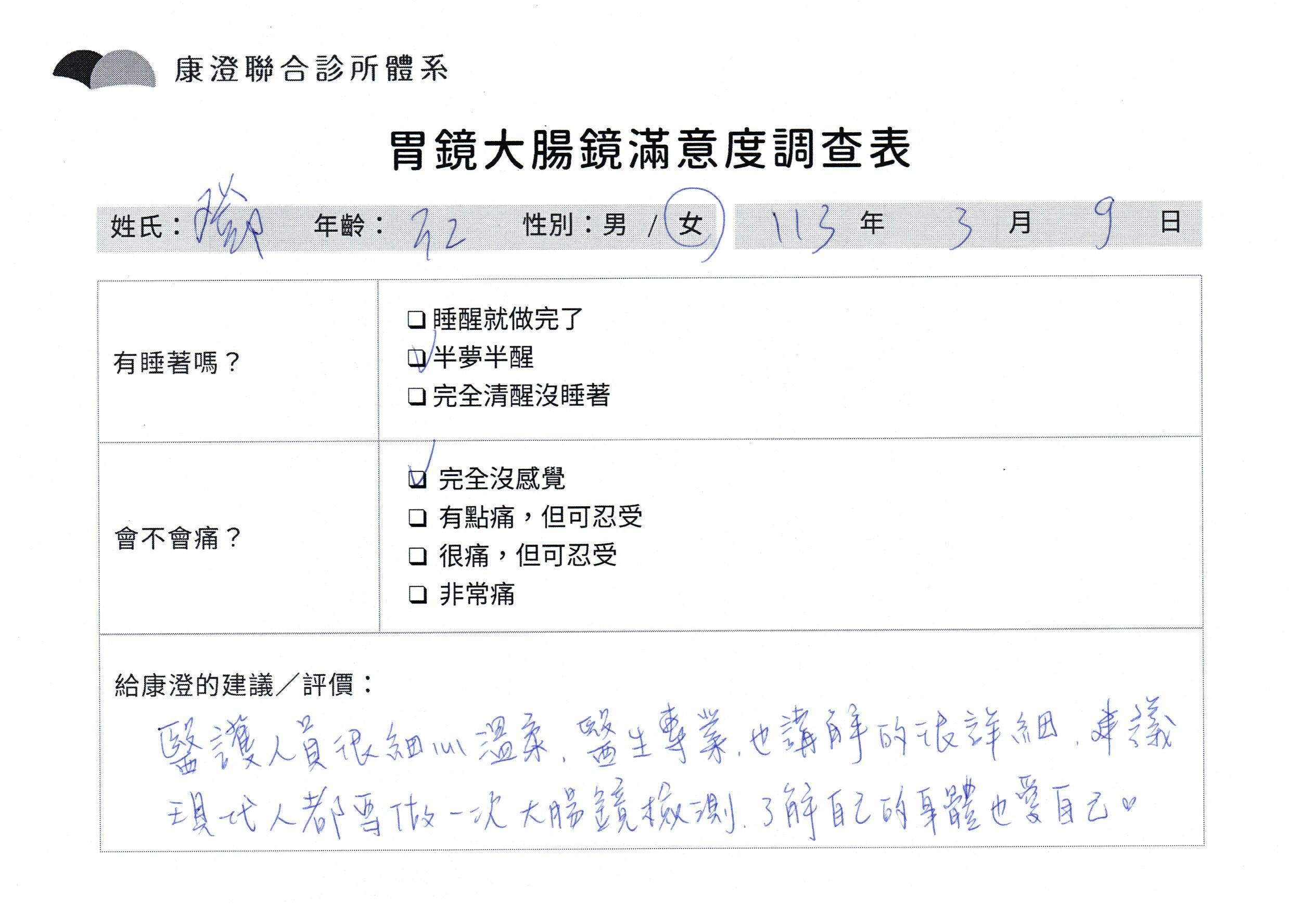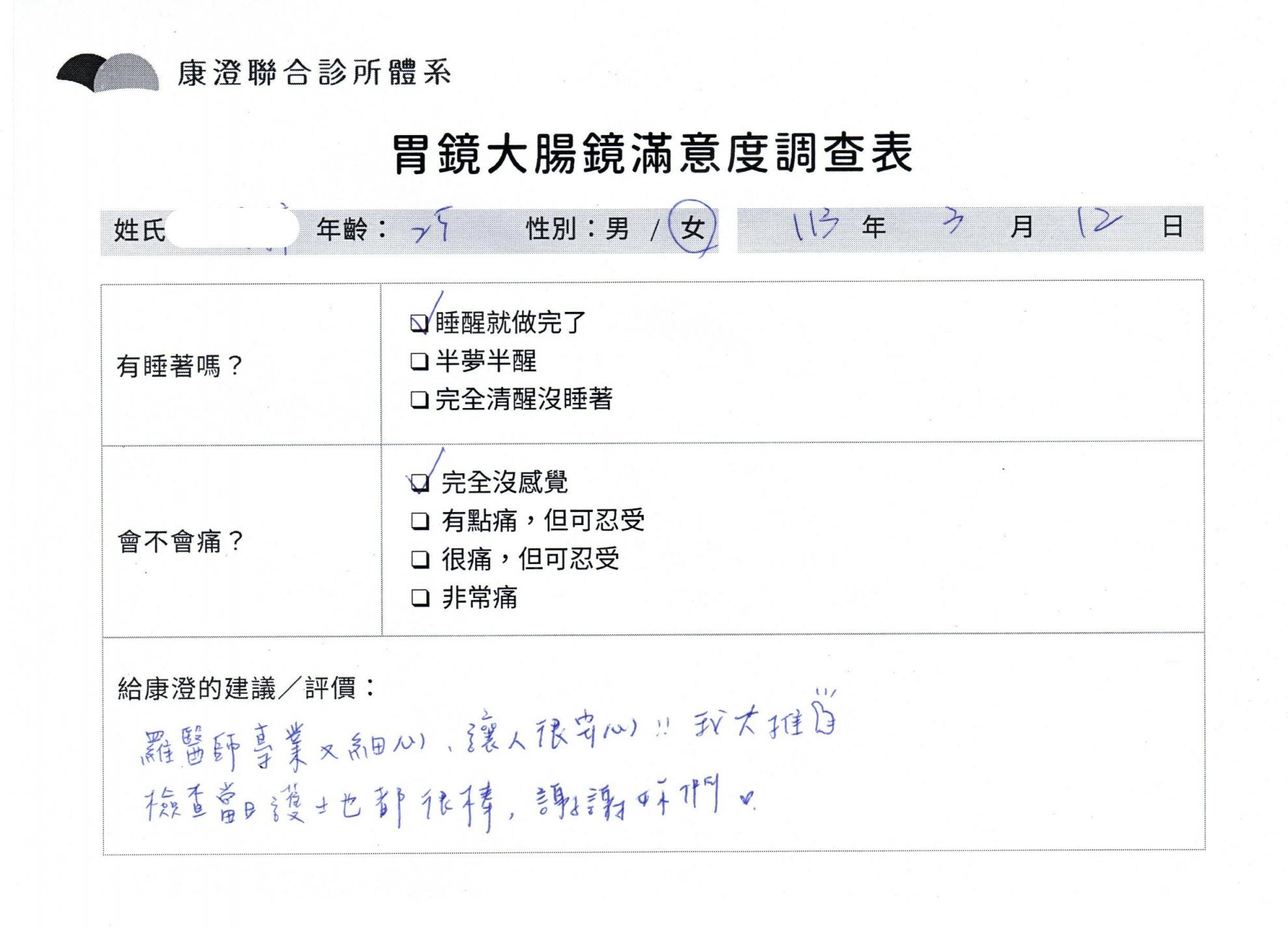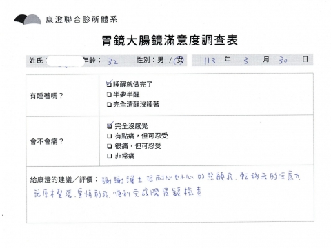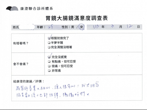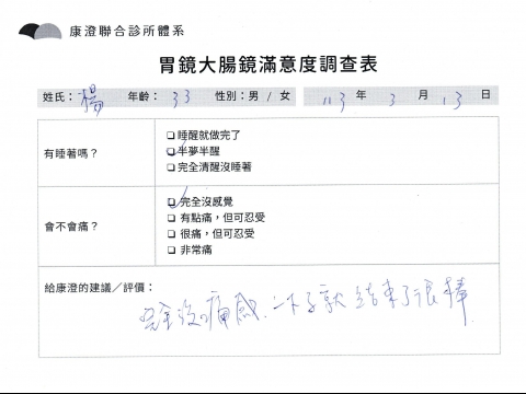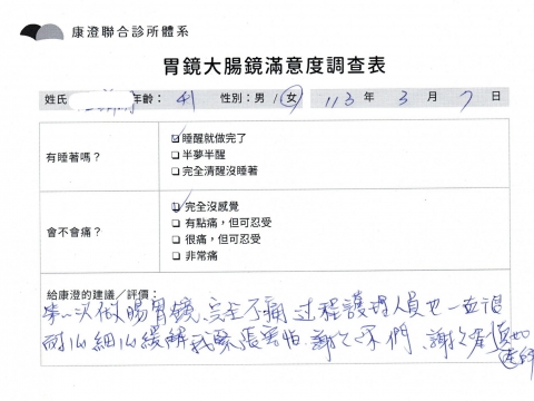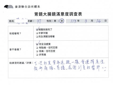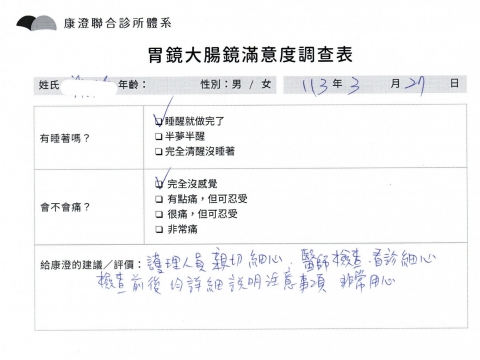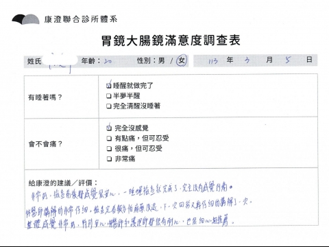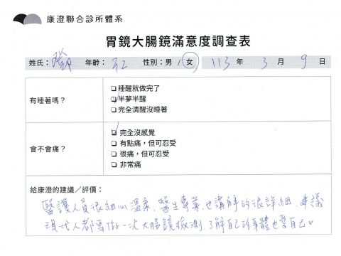 「定期穩定在櫃診所健檢,腸胃鏡的檢查醫療團隊及護理人員後續衛教的處理不輸醫院等級ㆍ專業丶舒適丶 安心,整個療程無痛,護理人員親切可降低檢查的緊張感,非常感謝!」