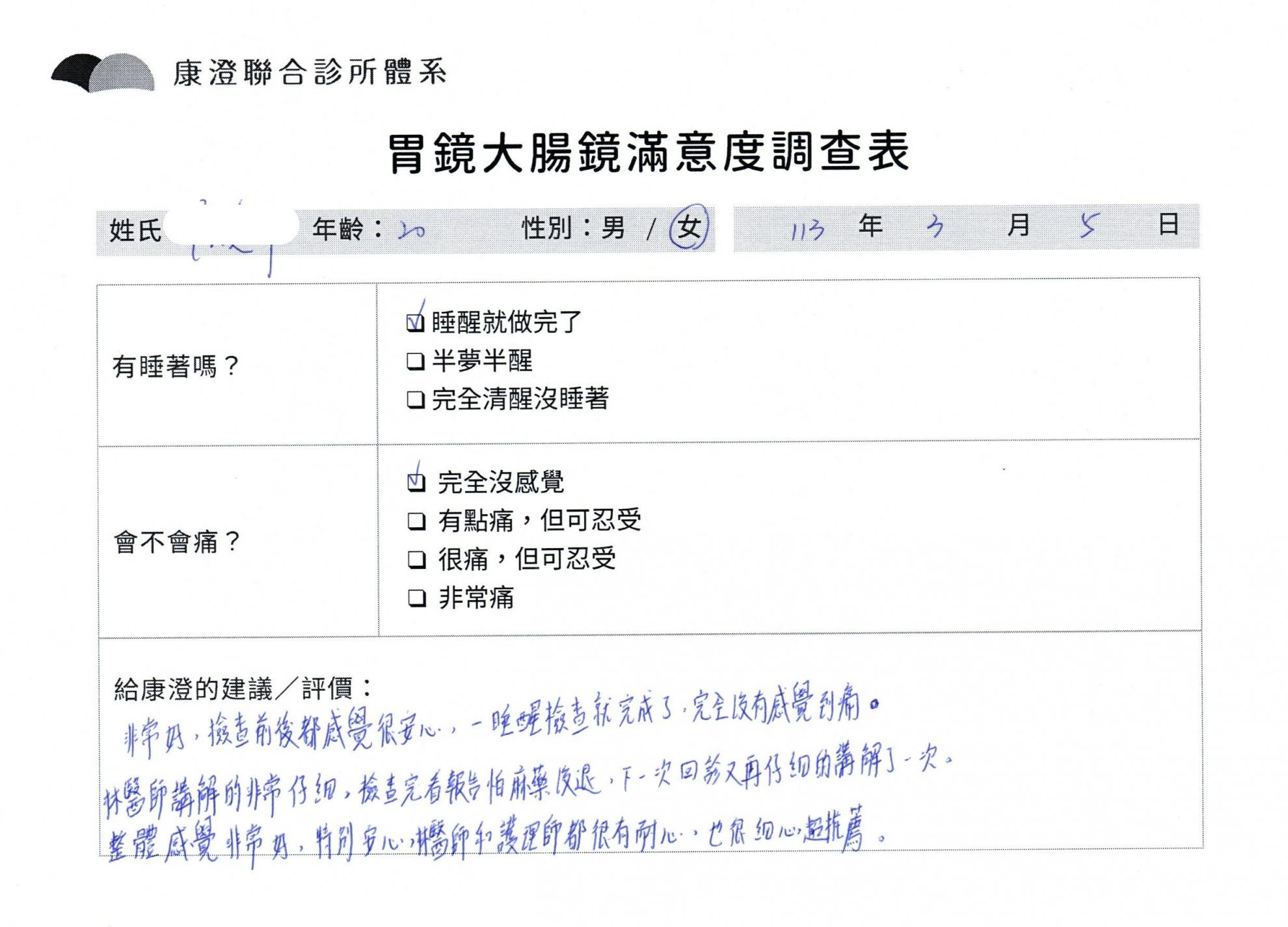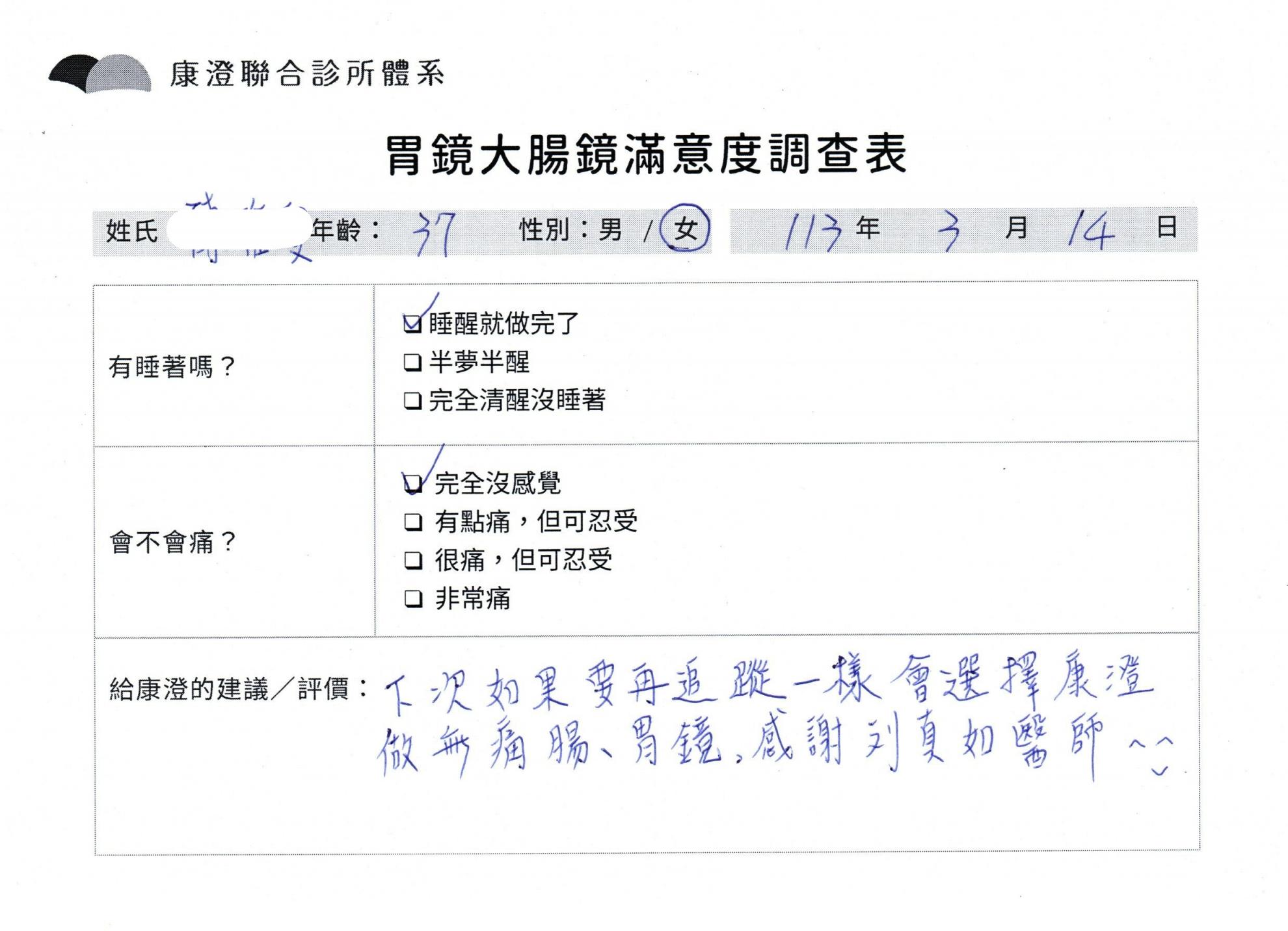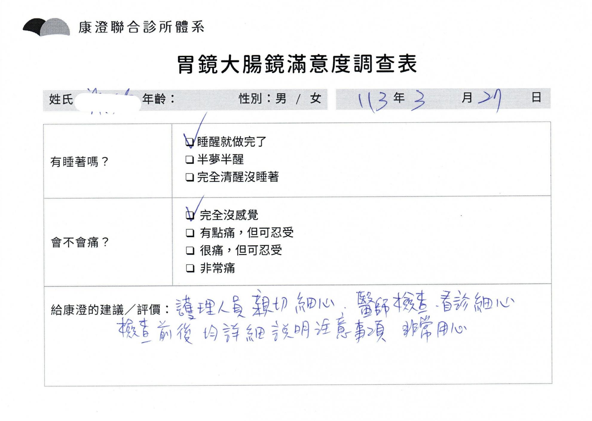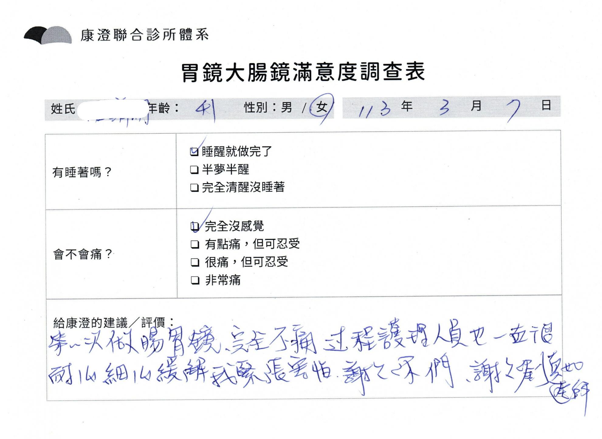 「定期穩定在櫃診所健檢,腸胃鏡的檢查醫療團隊及護理人員後續衛教的處理不輸醫院等級ㆍ專業丶舒適丶 安心,整個療程無痛,護理人員親切可降低檢查的緊張感,非常感謝!」