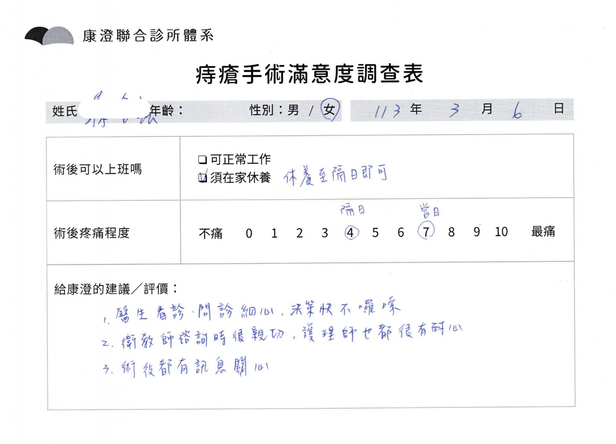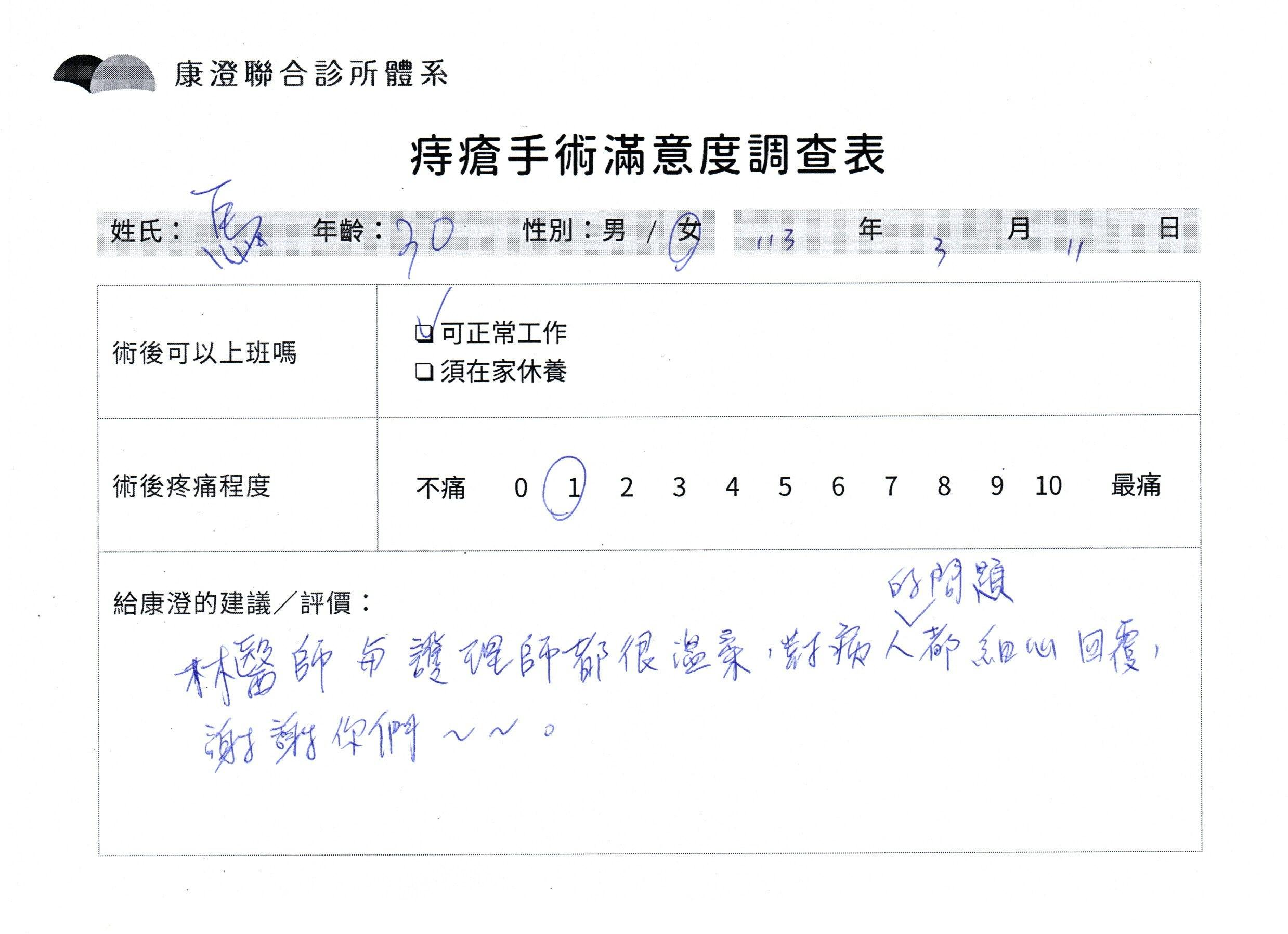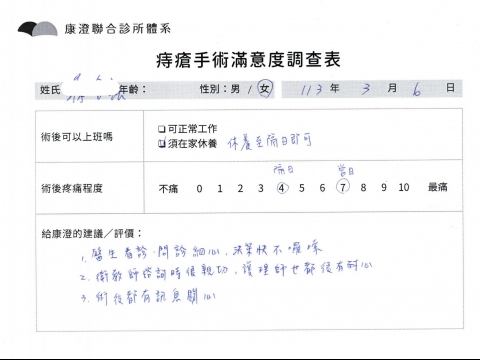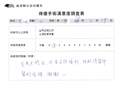 「困擾了20多年的三期內痔,終於在幾天內就解決了,原以為會很疼痛的手術及復原過程,結果真是神奇 啊!不會痛呢!長效針應該是有用的,前幾天主要是腫脹,感謝林醫師,以及術後時時電話關心的小護士們,很棒!」