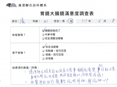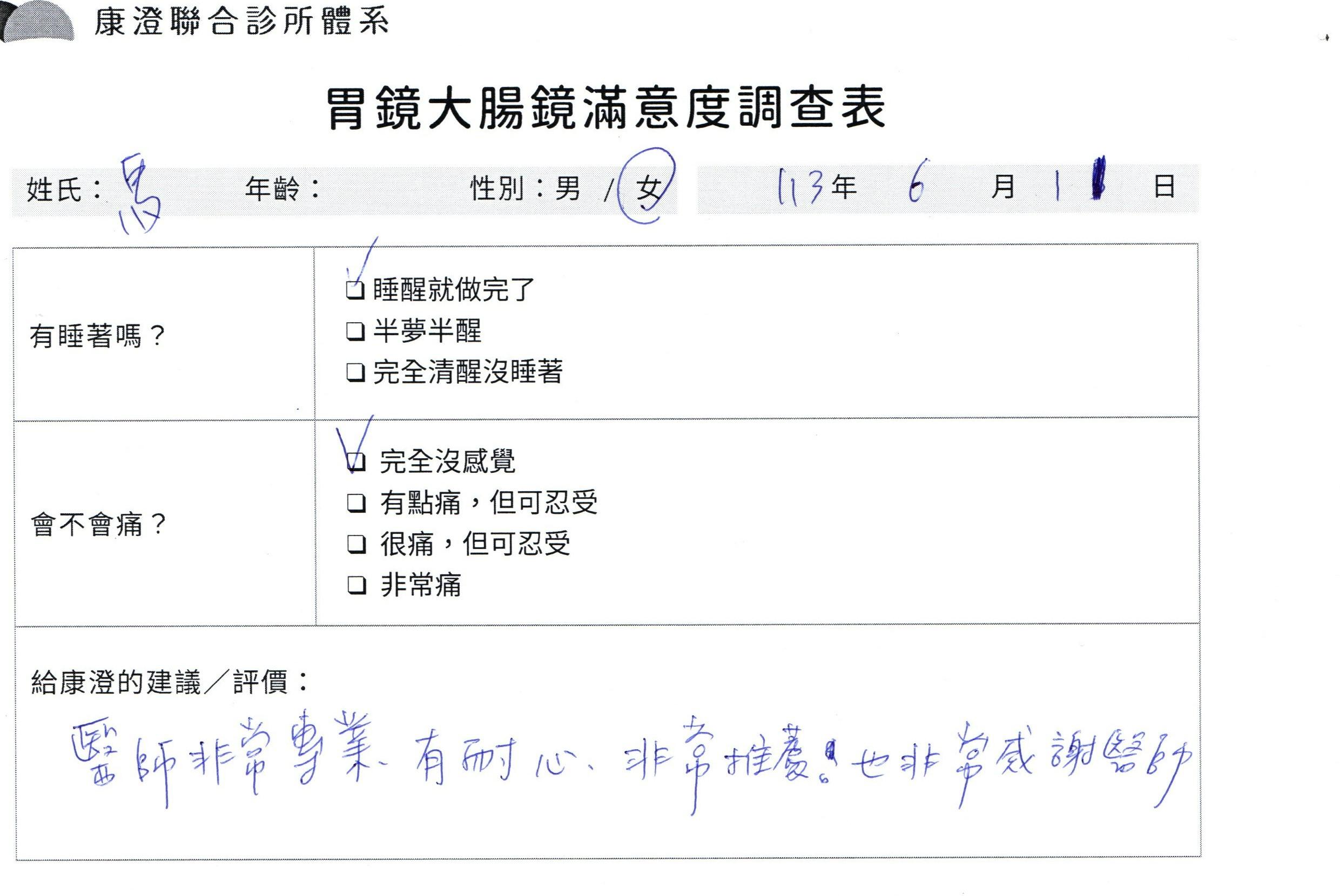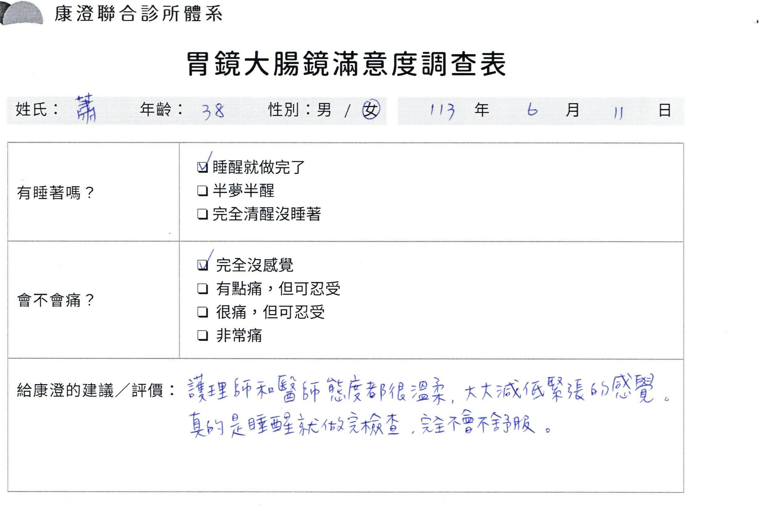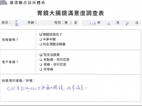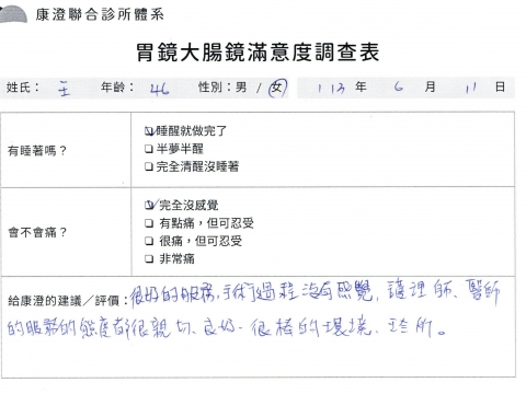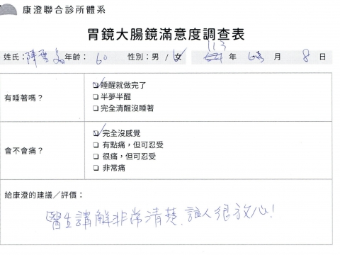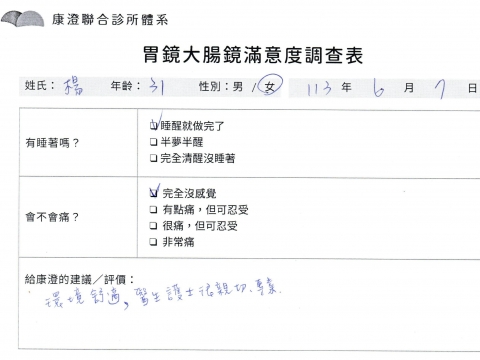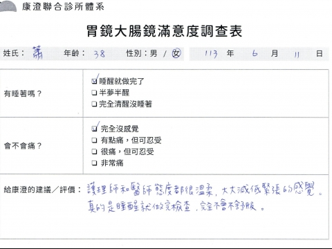 「定期穩定在櫃診所健檢,腸胃鏡的檢查醫療團隊及護理人員後續衛教的處理不輸醫院等級ㆍ專業丶舒適丶 安心,整個療程無痛,護理人員親切可降低檢查的緊張感,非常感謝!」
