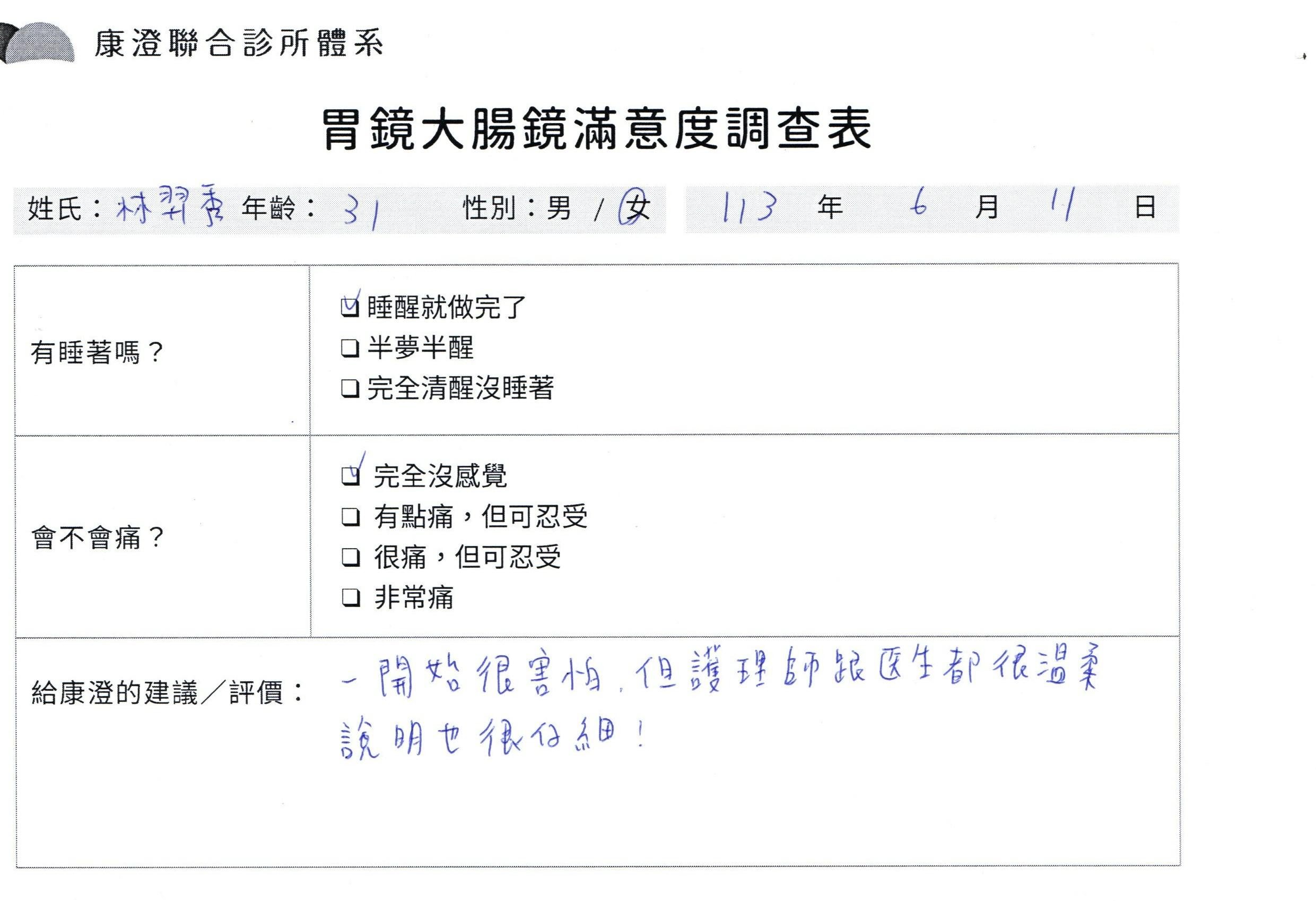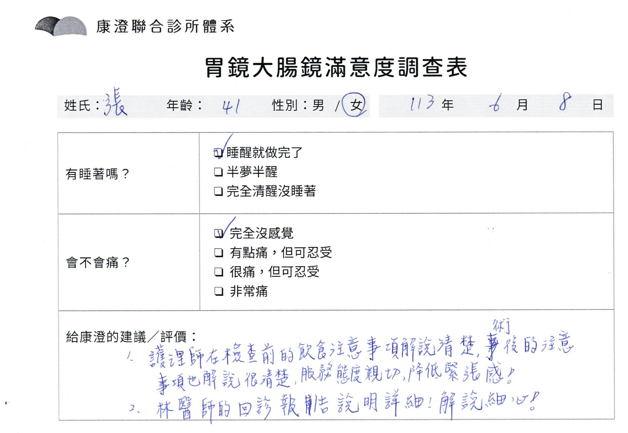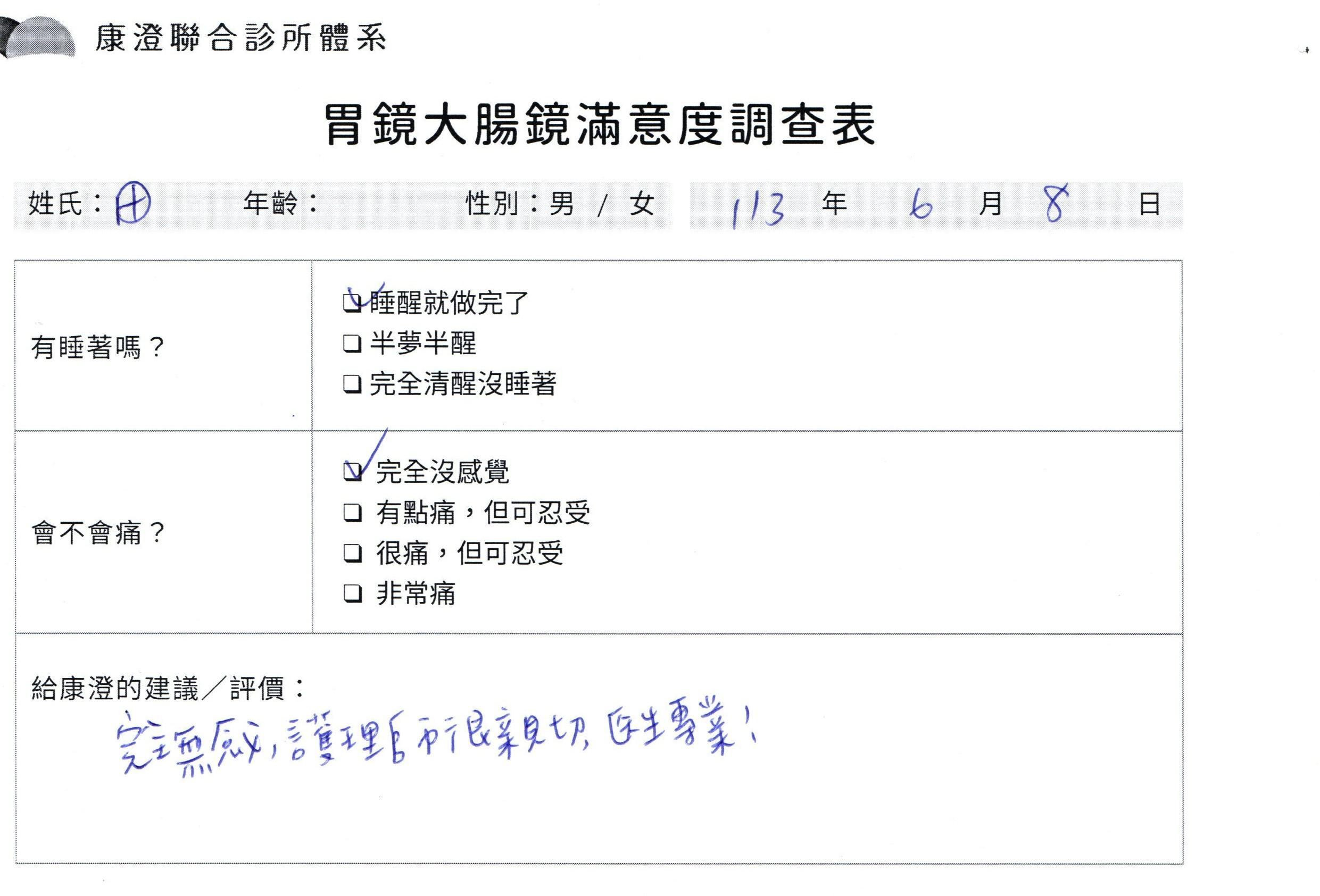 「定期穩定在櫃診所健檢,腸胃鏡的檢查醫療團隊及護理人員後續衛教的處理不輸醫院等級ㆍ專業丶舒適丶 安心,整個療程無痛,護理人員親切可降低檢查的緊張感,非常感謝!」