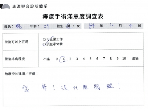 「困擾了20多年的三期內痔,終於在幾天內就解決了,原以為會很疼痛的手術及復原過程,結果真是神奇 啊!不會痛呢!長效針應該是有用的,前幾天主要是腫脹,感謝林醫師,以及術後時時電話關心的小護士們,很棒!」