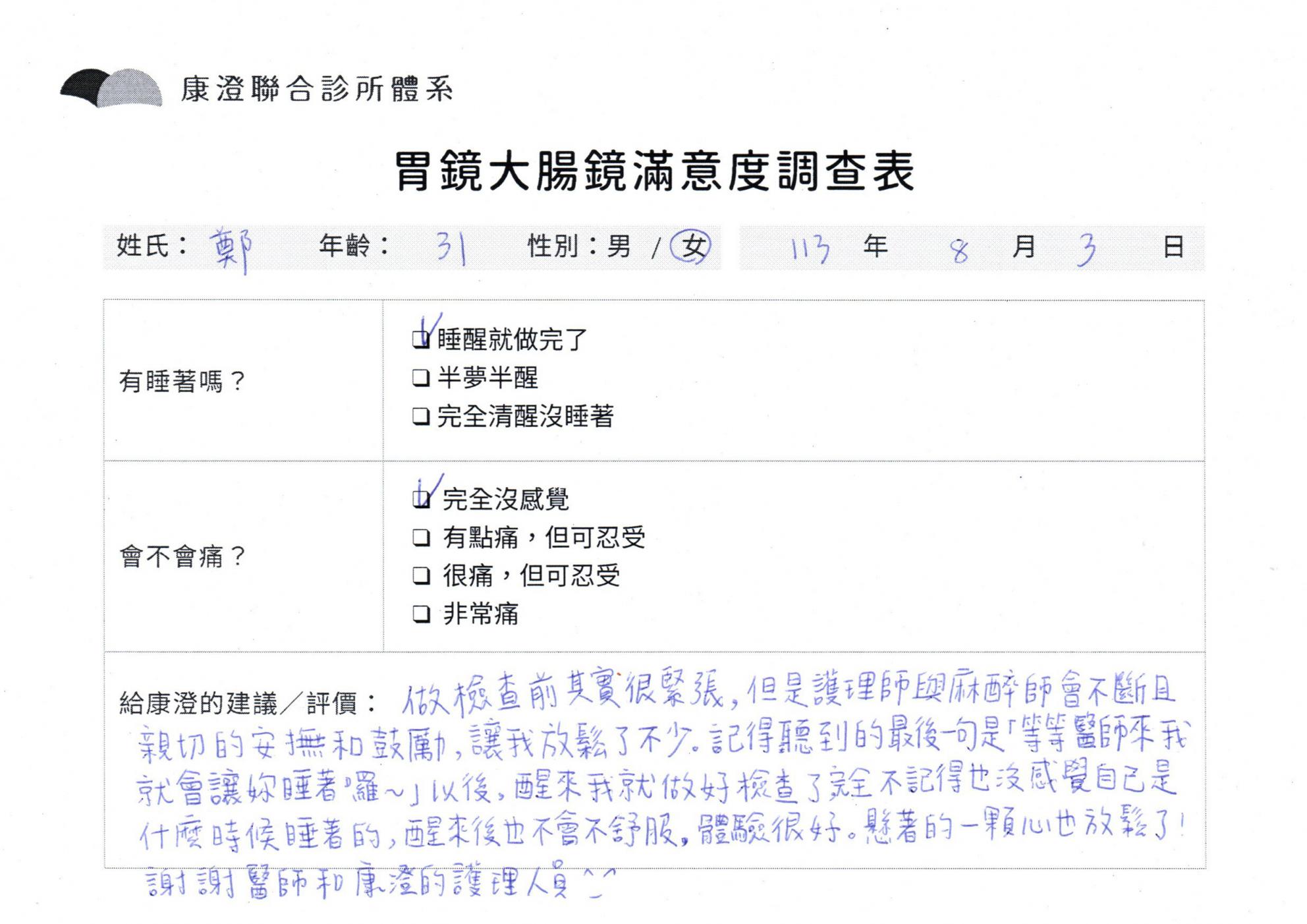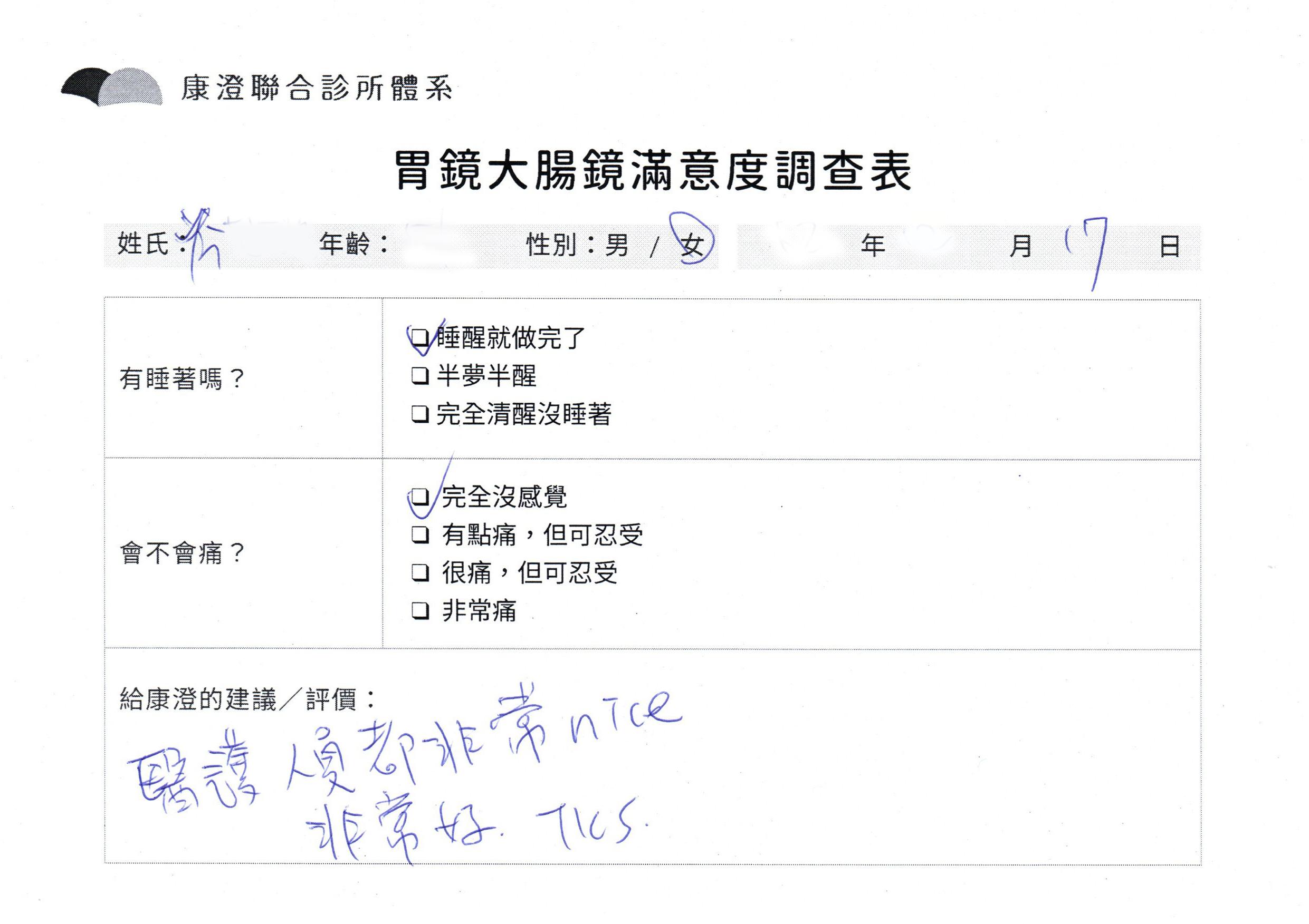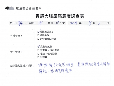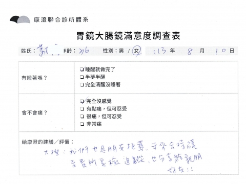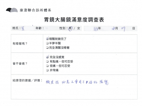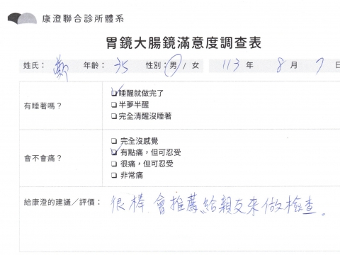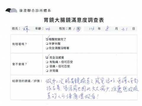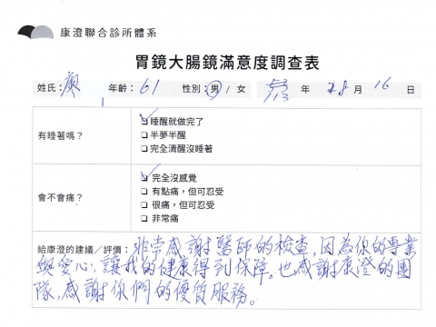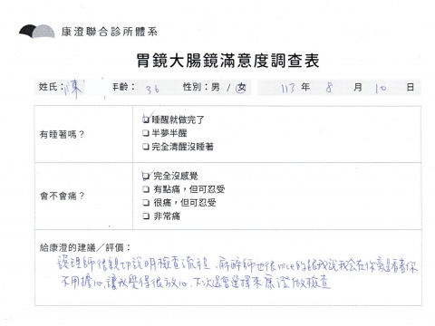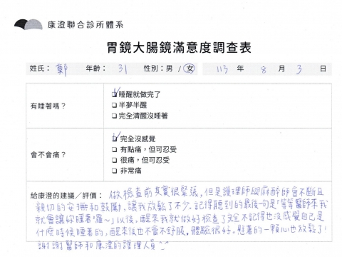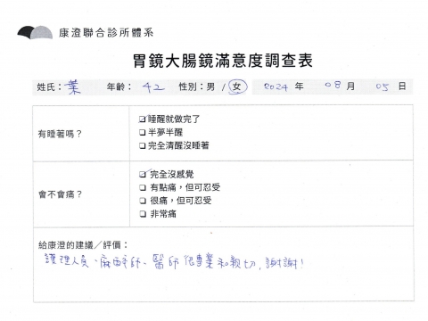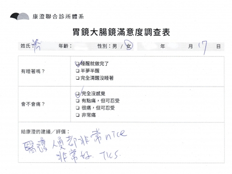 「定期穩定在櫃診所健檢,腸胃鏡的檢查醫療團隊及護理人員後續衛教的處理不輸醫院等級ㆍ專業丶舒適丶 安心,整個療程無痛,護理人員親切可降低檢查的緊張感,非常感謝!」