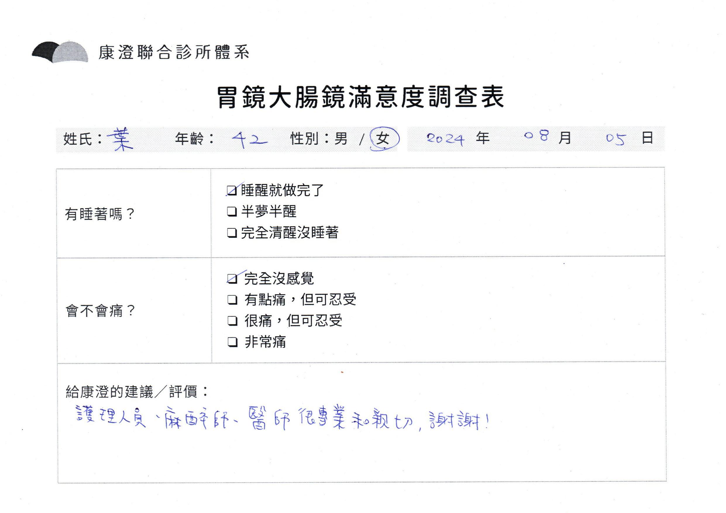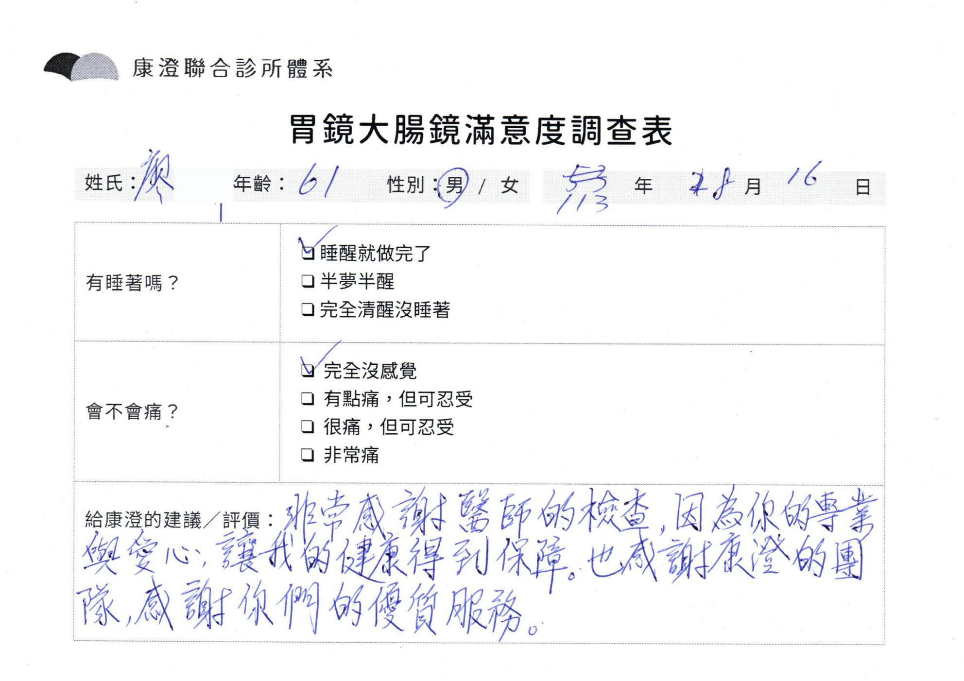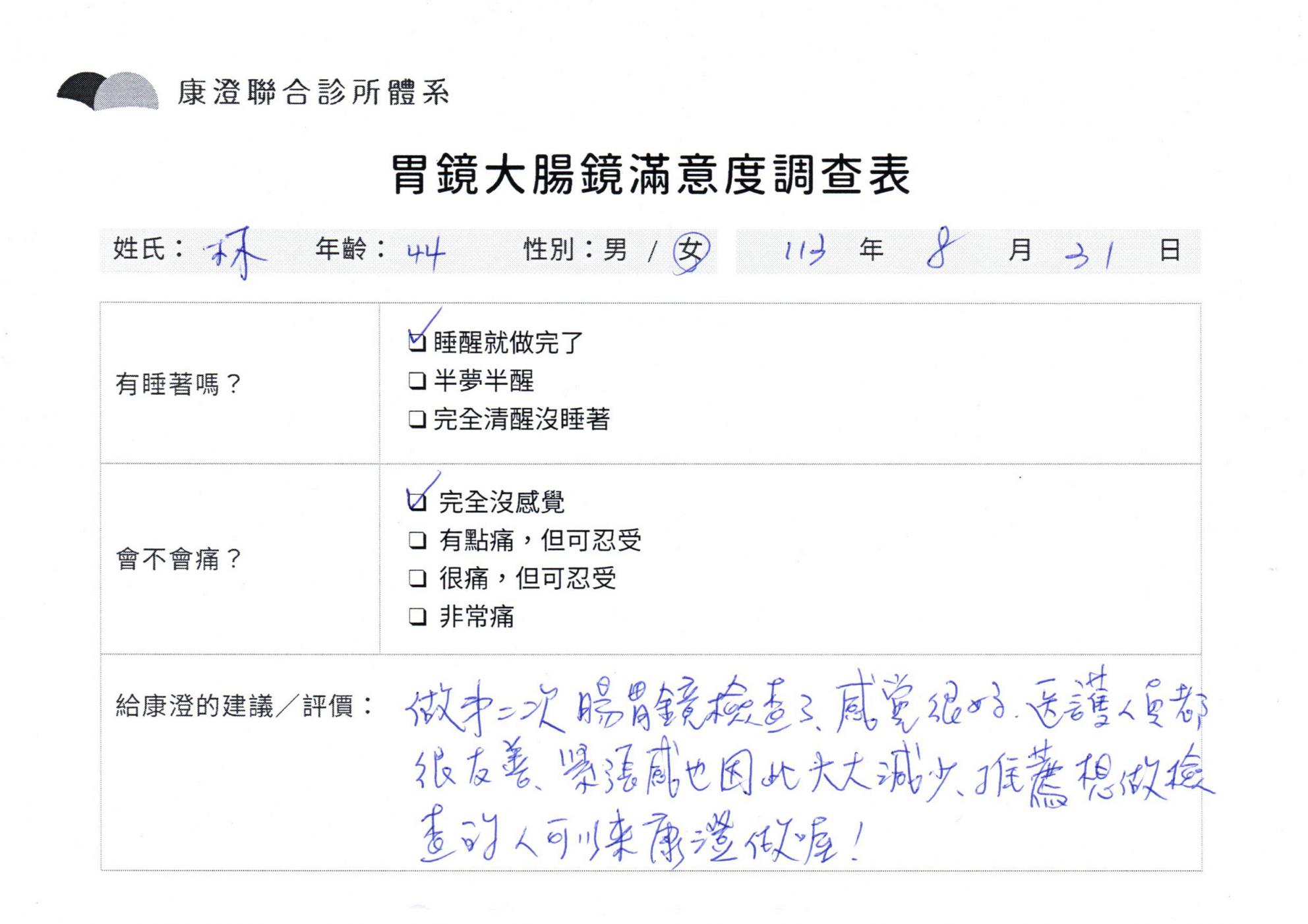 「定期穩定在櫃診所健檢,腸胃鏡的檢查醫療團隊及護理人員後續衛教的處理不輸醫院等級ㆍ專業丶舒適丶 安心,整個療程無痛,護理人員親切可降低檢查的緊張感,非常感謝!」