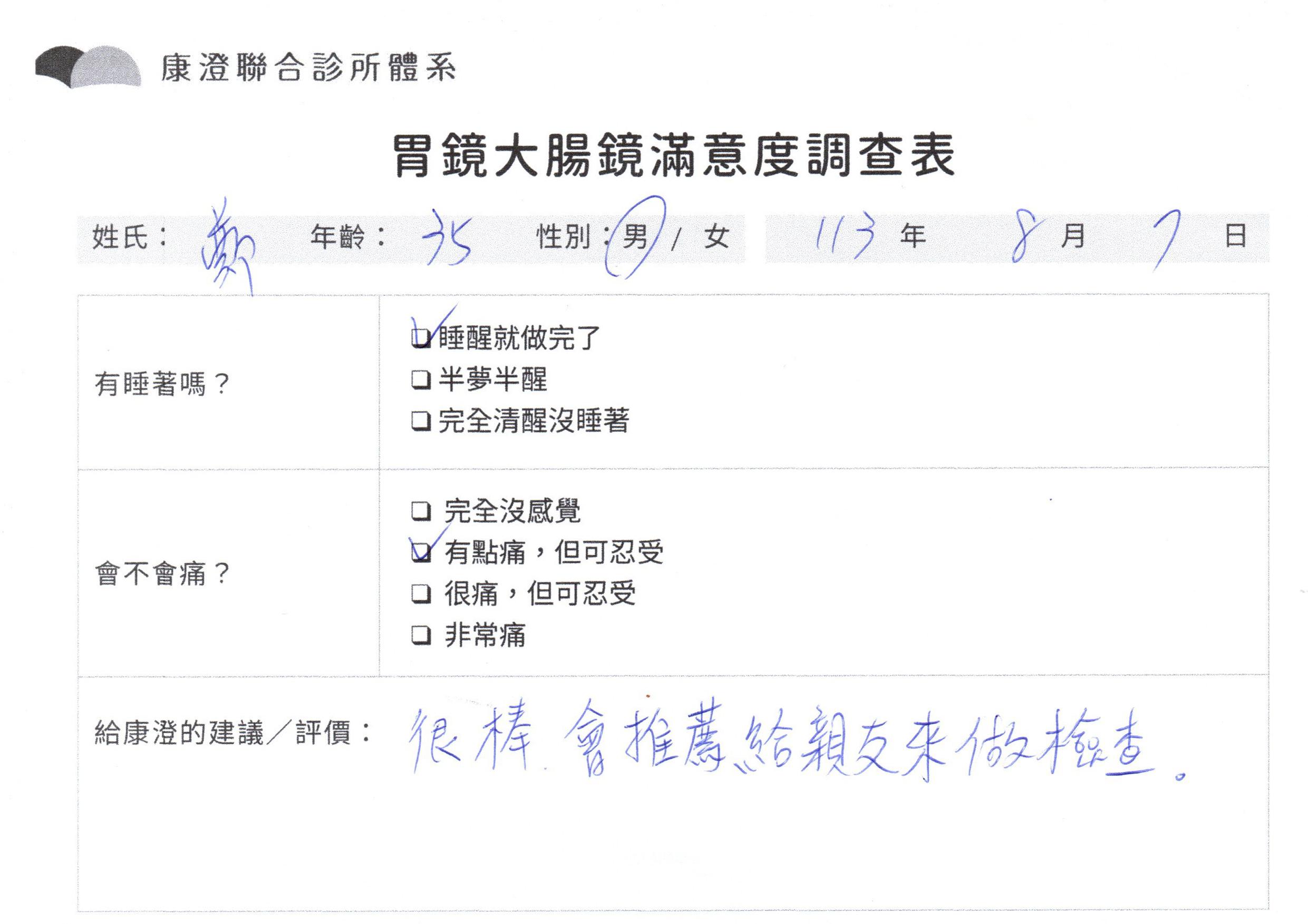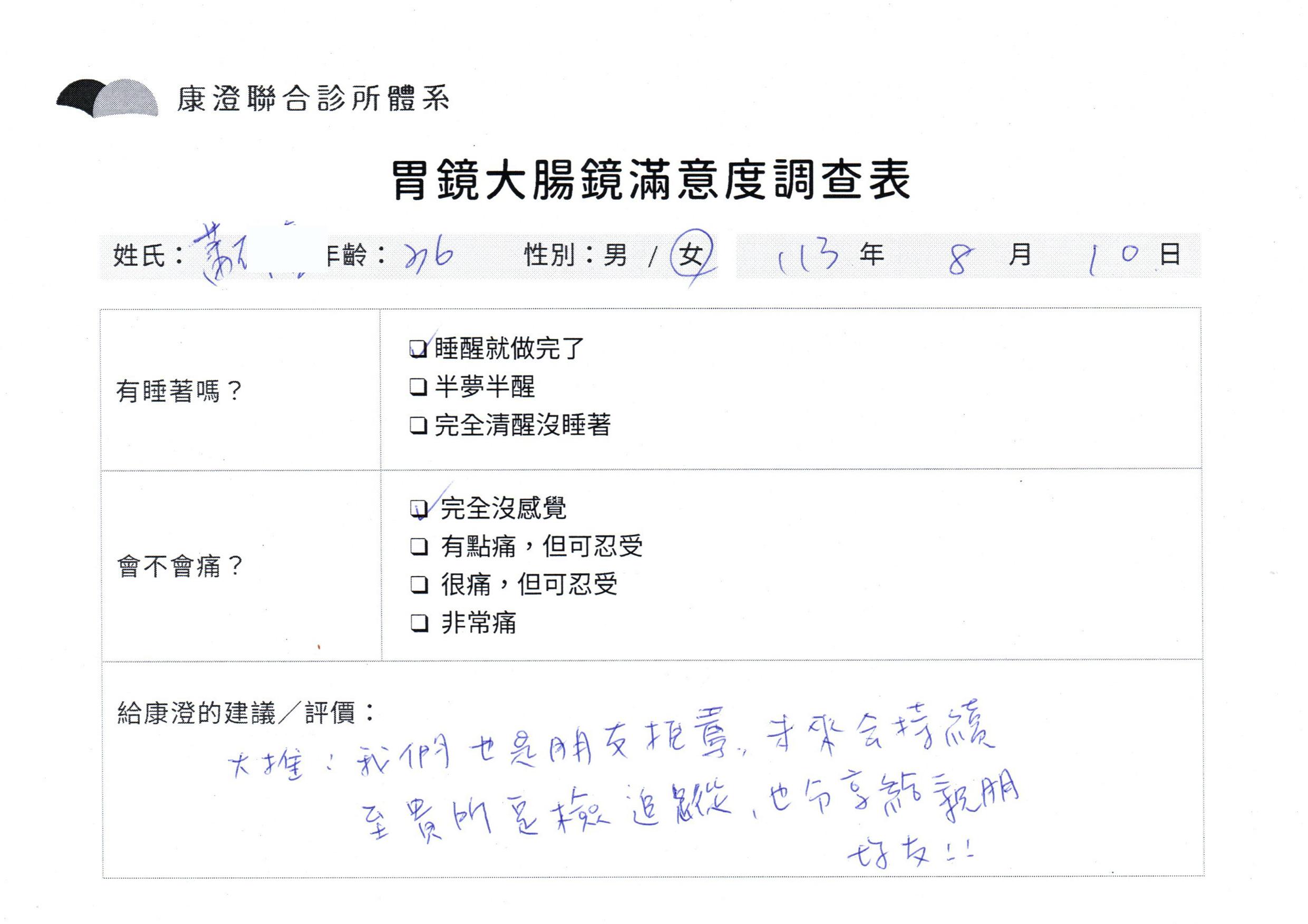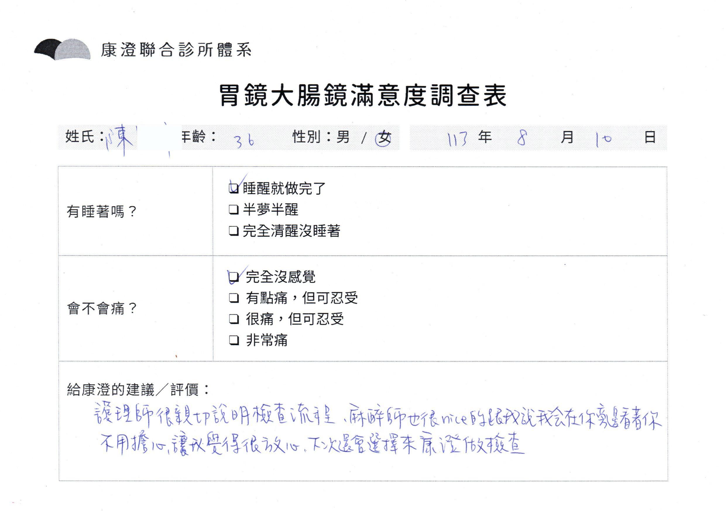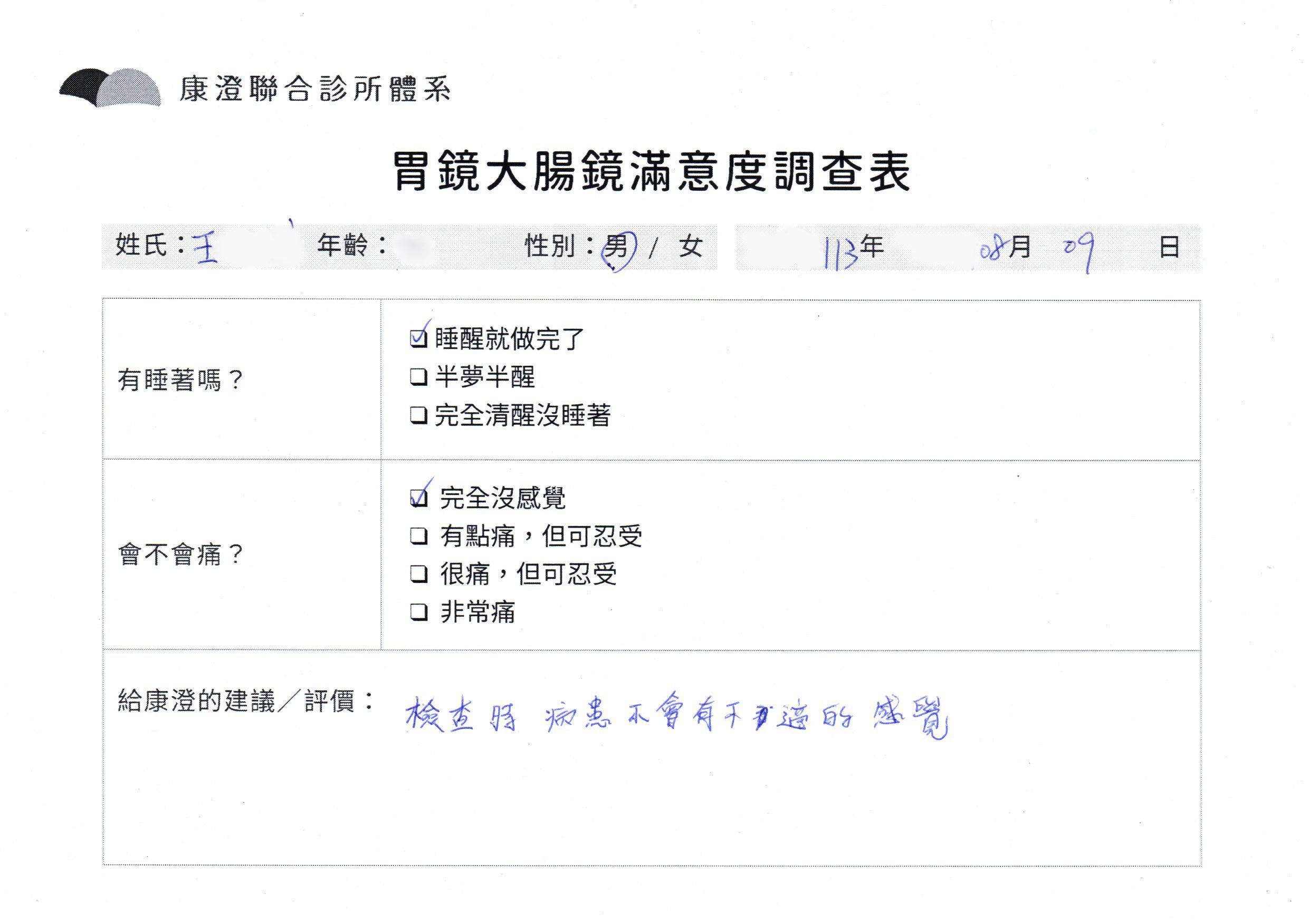 「定期穩定在櫃診所健檢,腸胃鏡的檢查醫療團隊及護理人員後續衛教的處理不輸醫院等級ㆍ專業丶舒適丶 安心,整個療程無痛,護理人員親切可降低檢查的緊張感,非常感謝!」