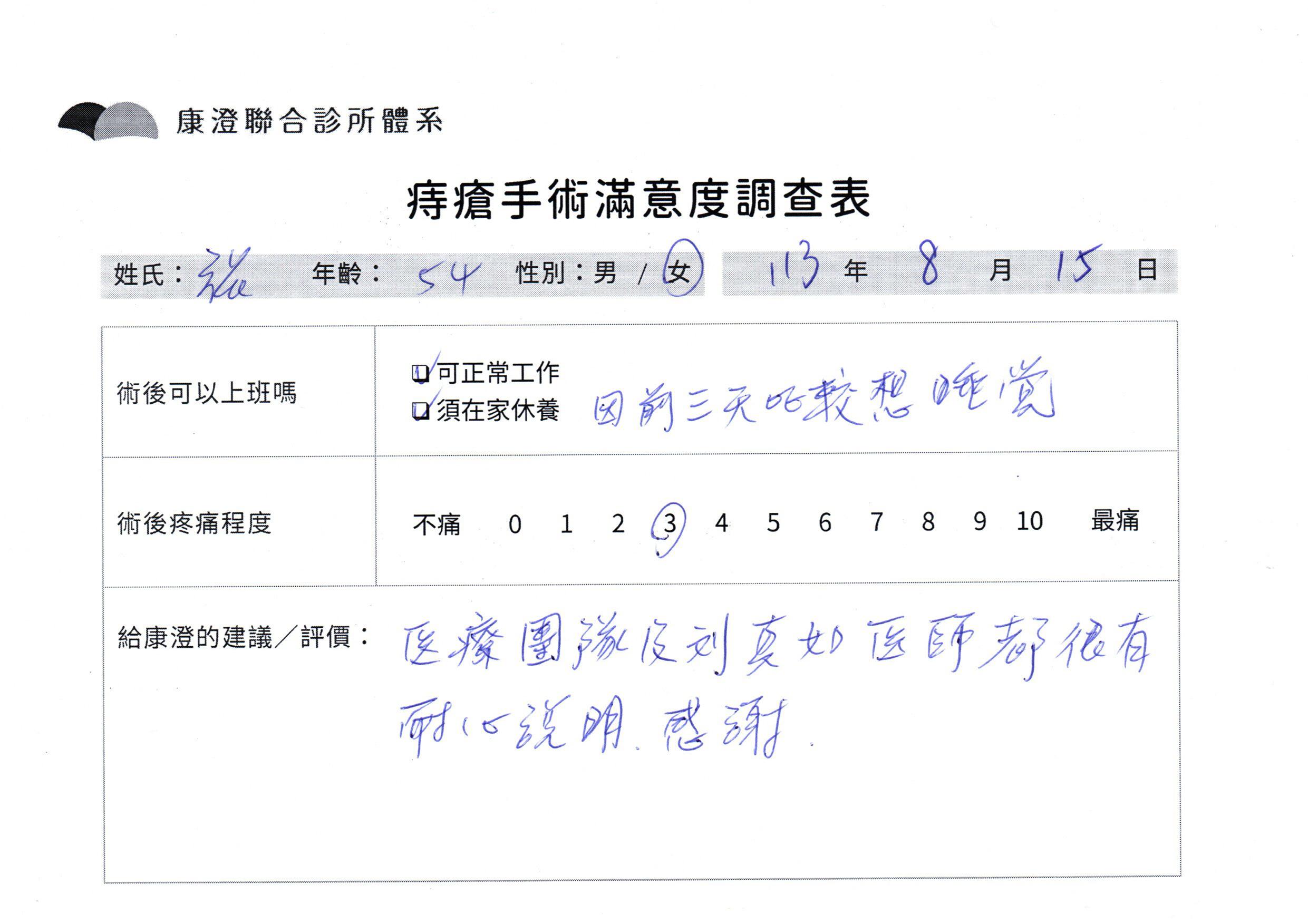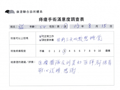 「困擾了20多年的三期內痔,終於在幾天內就解決了,原以為會很疼痛的手術及復原過程,結果真是神奇 啊!不會痛呢!長效針應該是有用的,前幾天主要是腫脹,感謝林醫師,以及術後時時電話關心的小護士們,很棒!」
