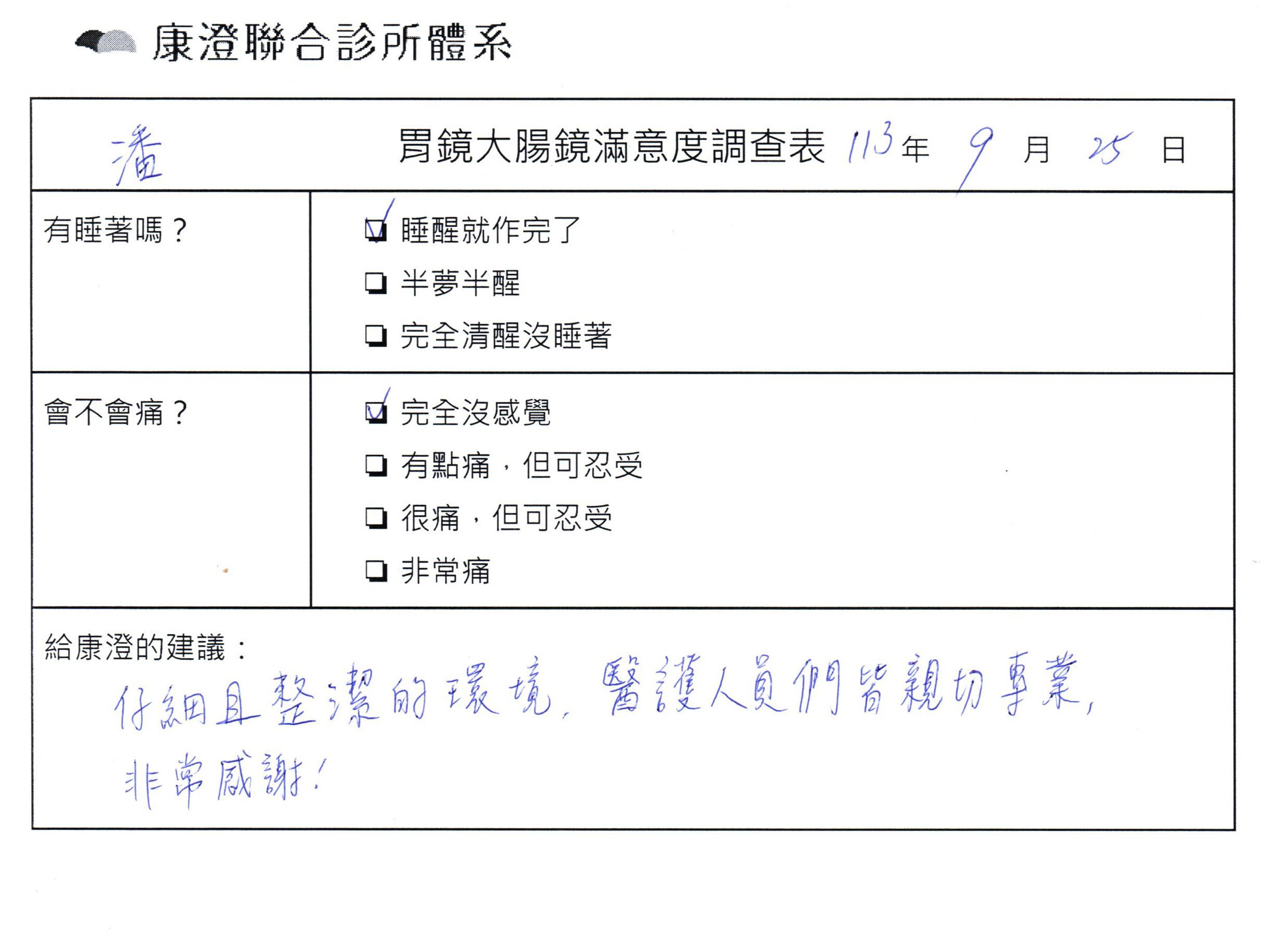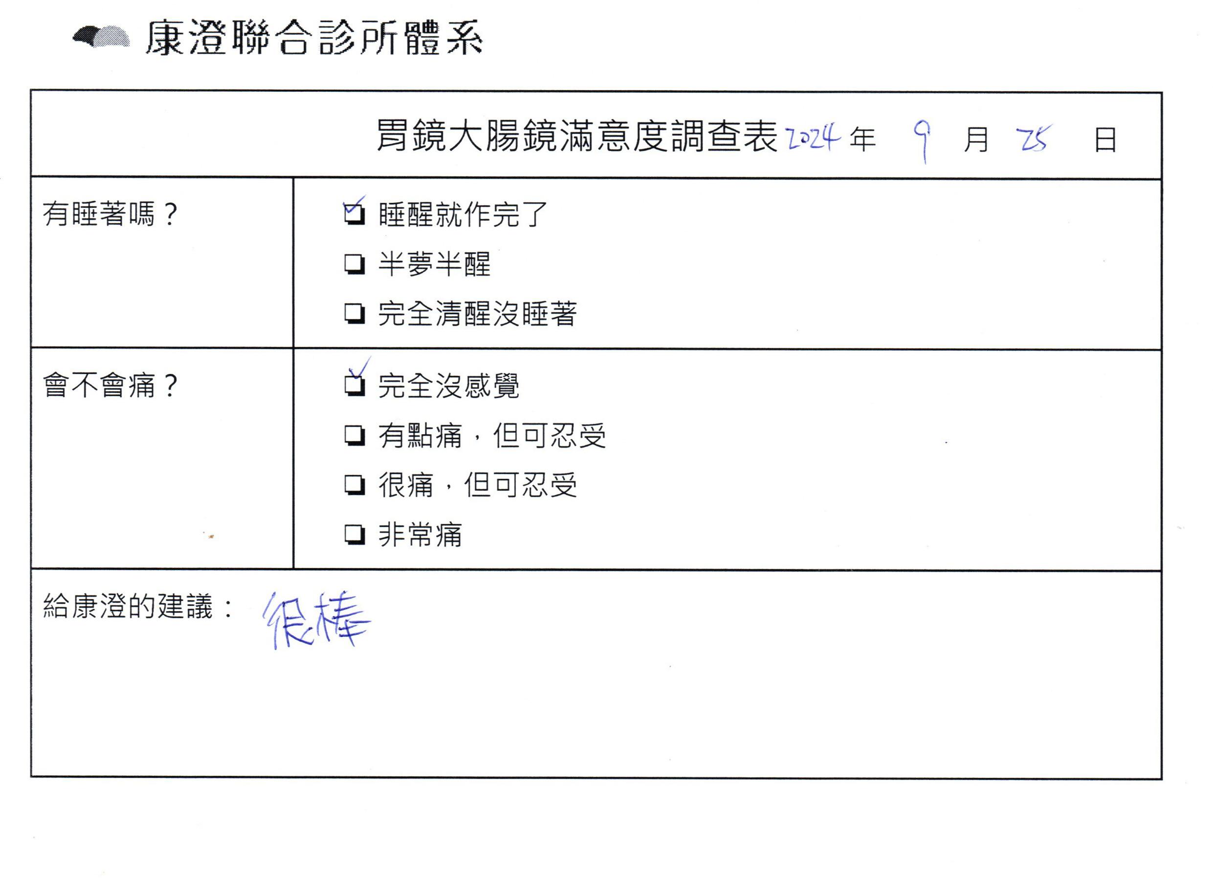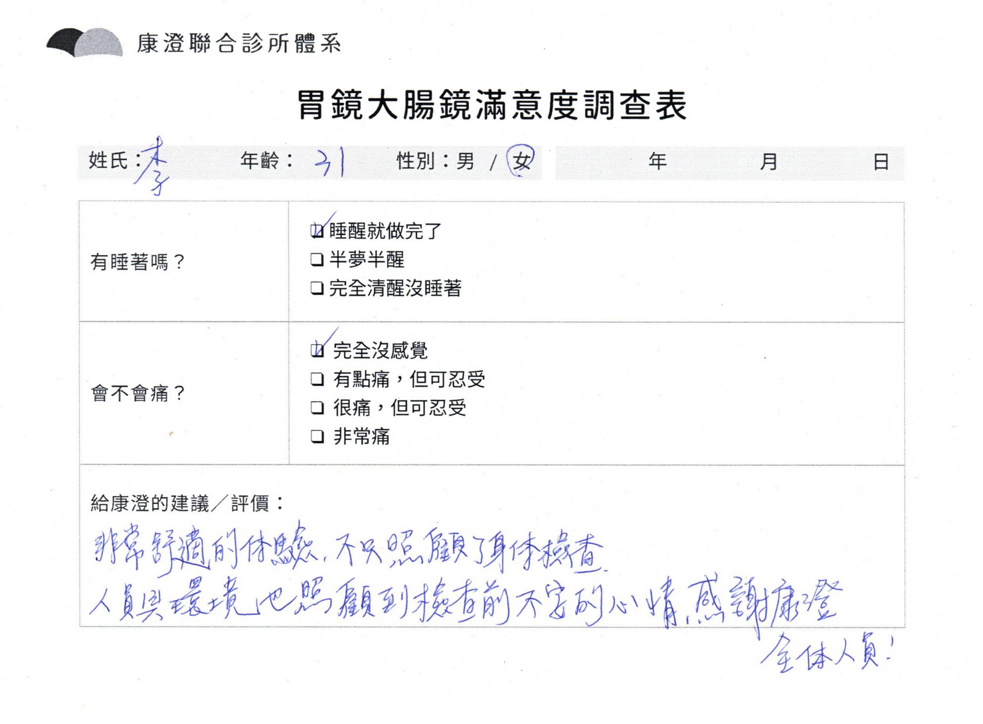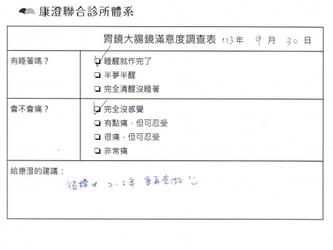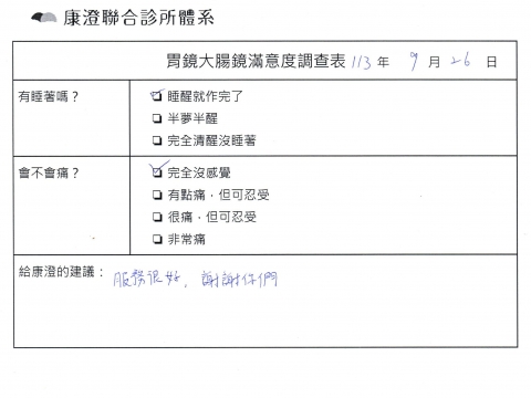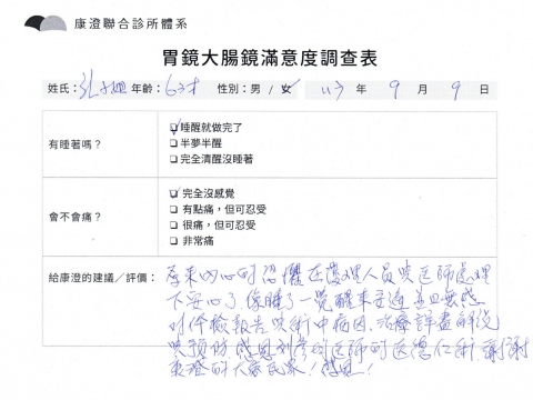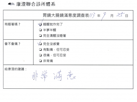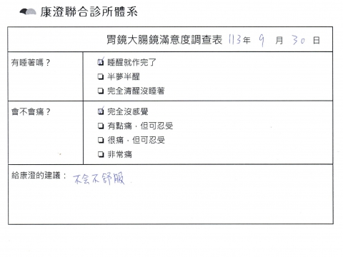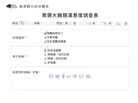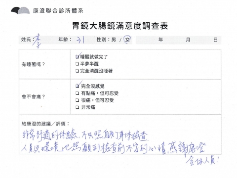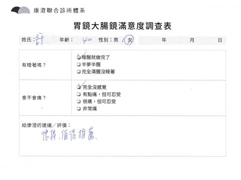 「定期穩定在櫃診所健檢,腸胃鏡的檢查醫療團隊及護理人員後續衛教的處理不輸醫院等級ㆍ專業丶舒適丶 安心,整個療程無痛,護理人員親切可降低檢查的緊張感,非常感謝!」