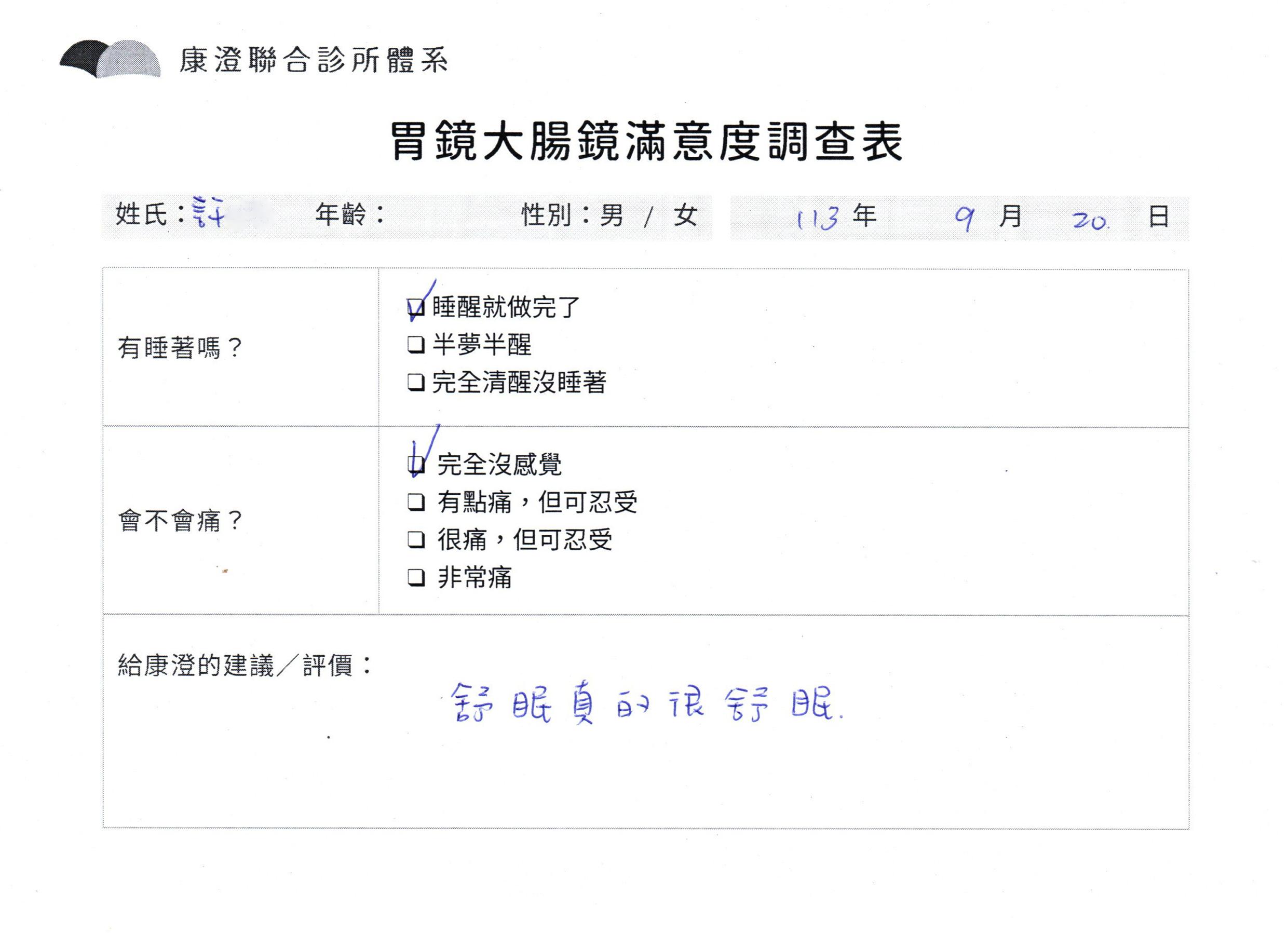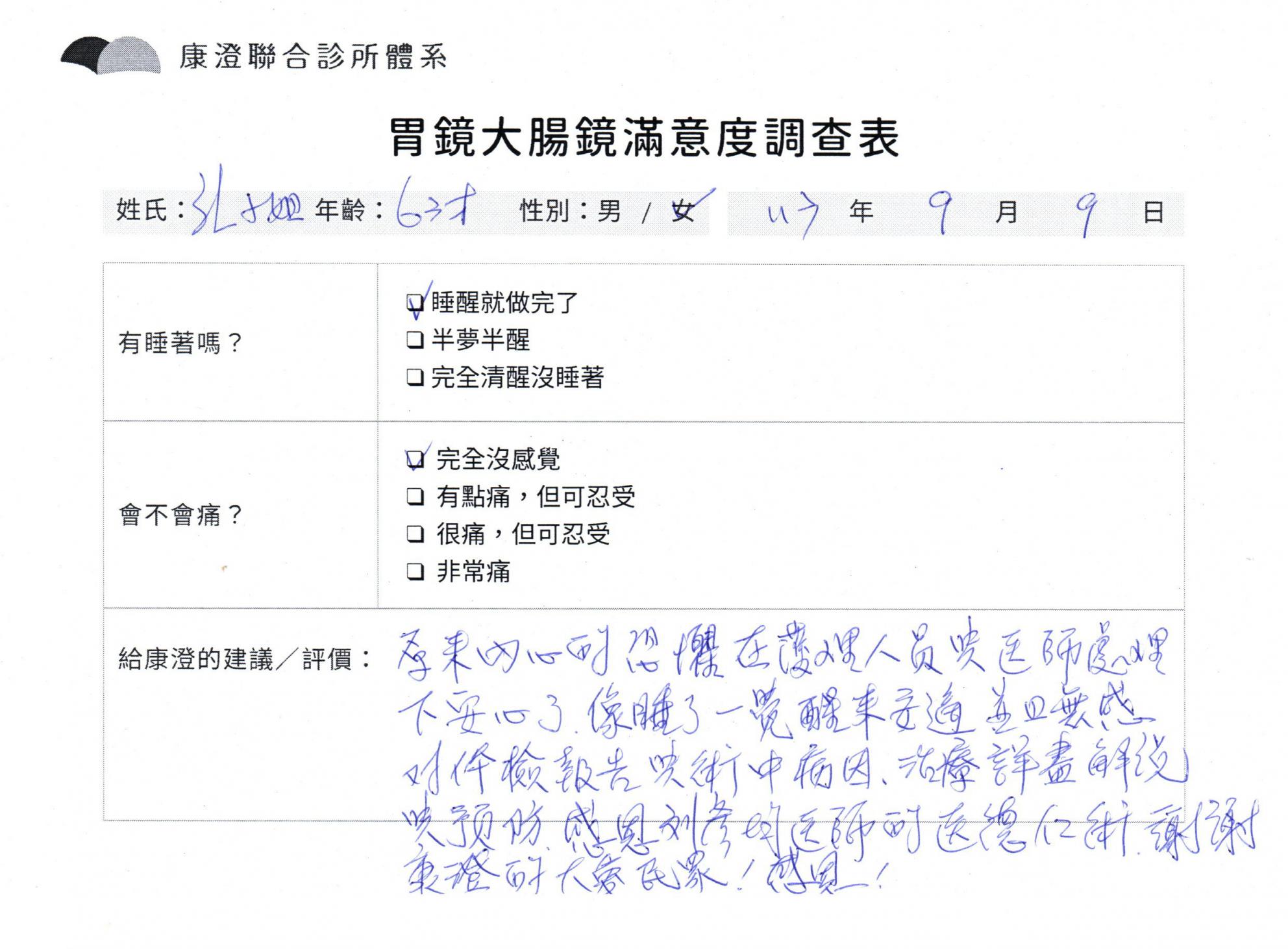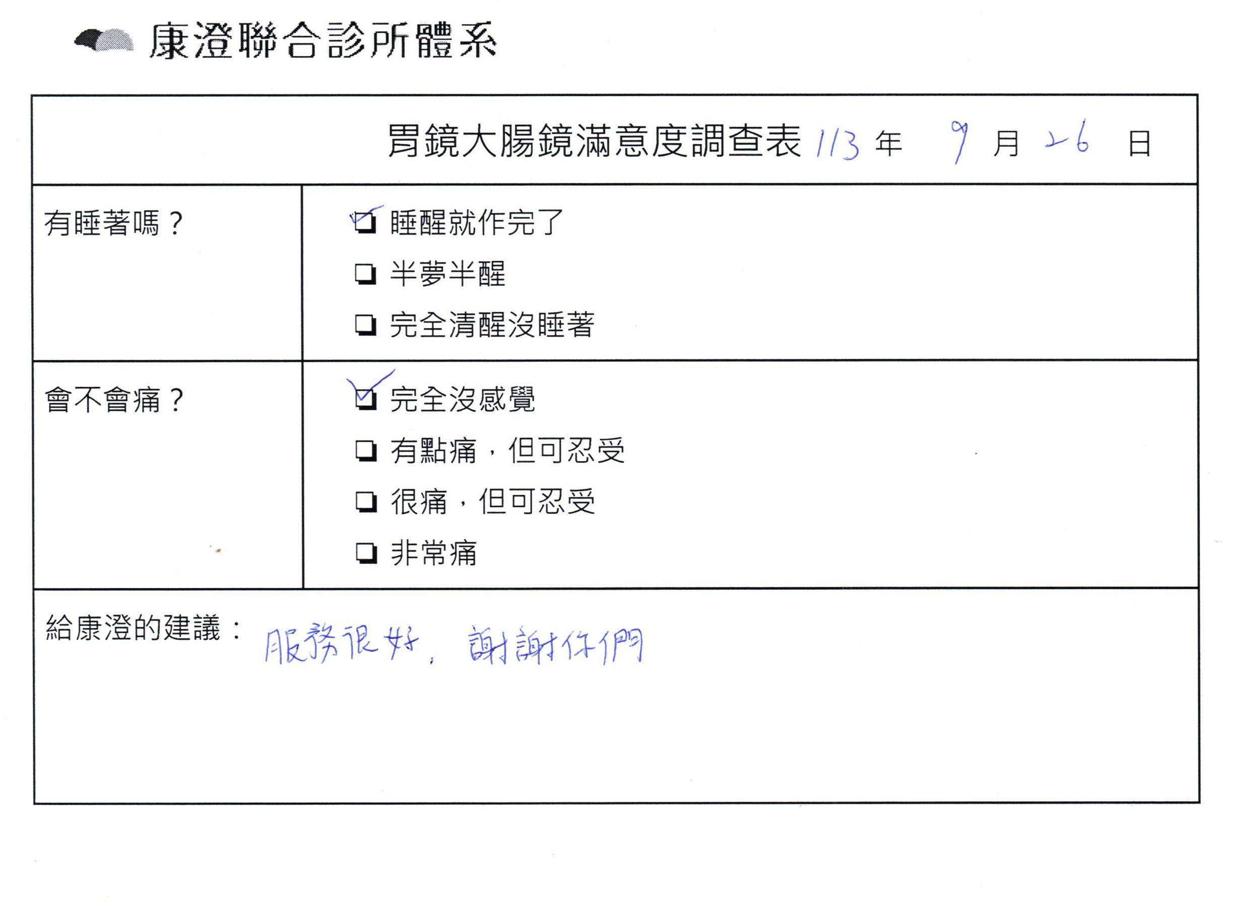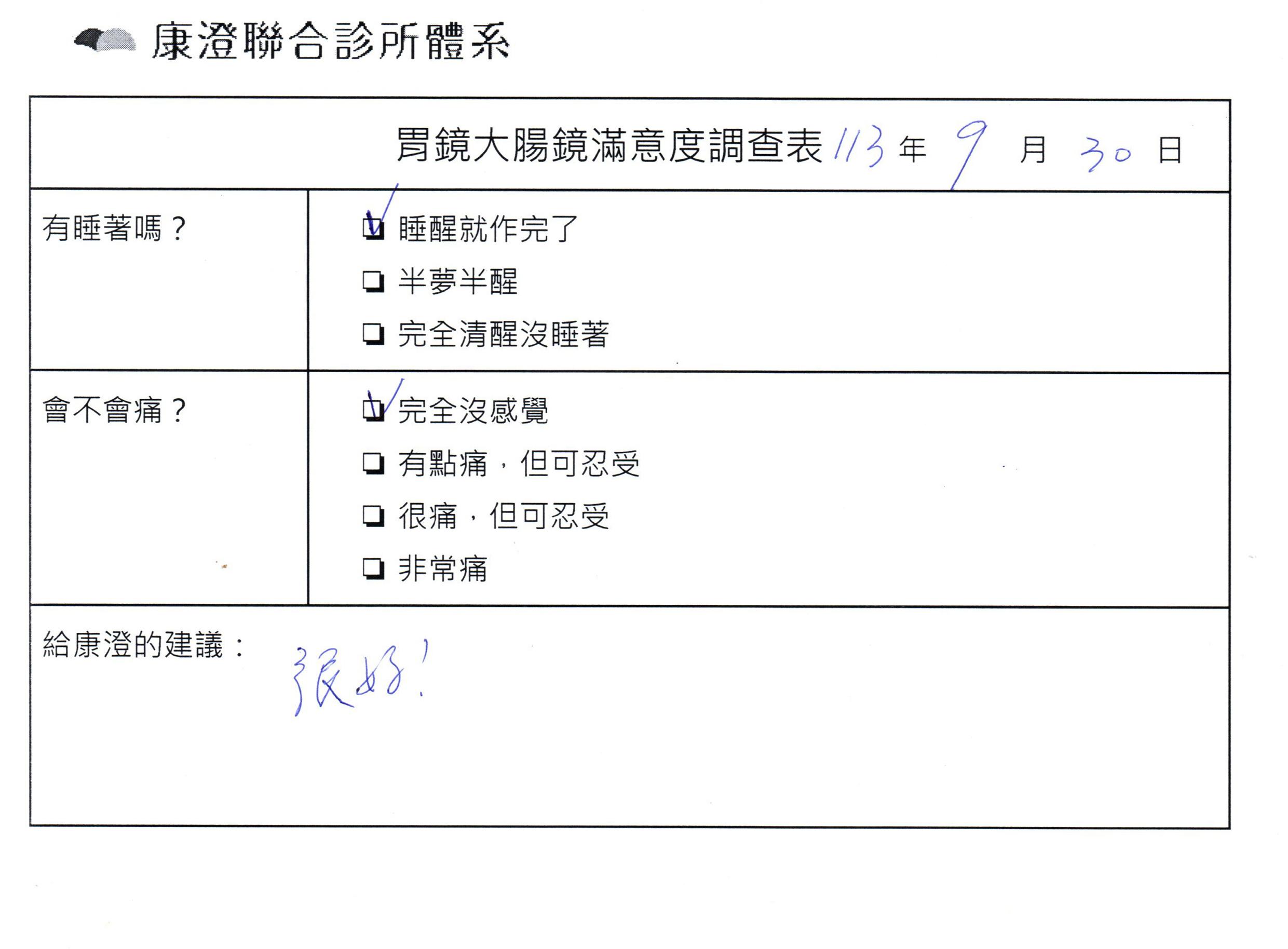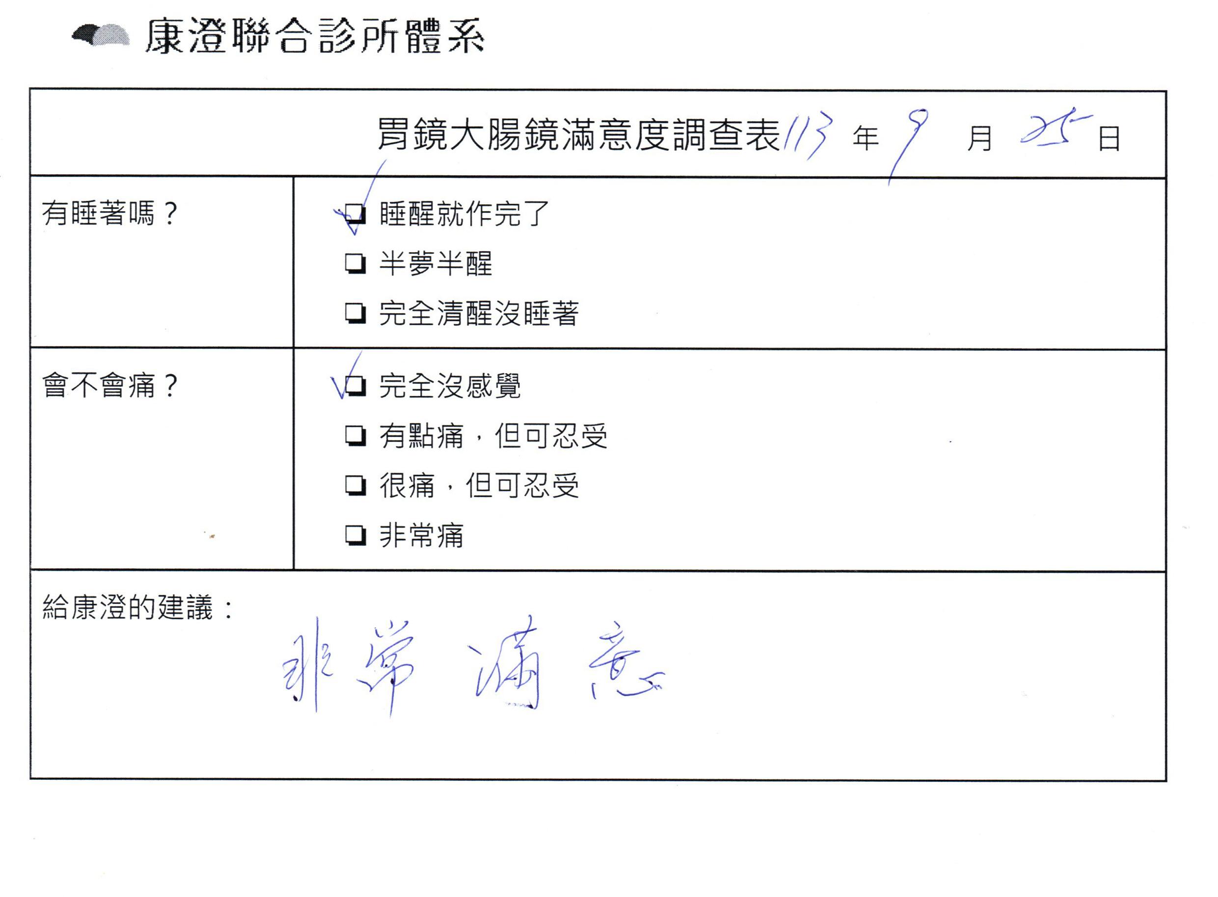 「定期穩定在櫃診所健檢,腸胃鏡的檢查醫療團隊及護理人員後續衛教的處理不輸醫院等級ㆍ專業丶舒適丶 安心,整個療程無痛,護理人員親切可降低檢查的緊張感,非常感謝!」