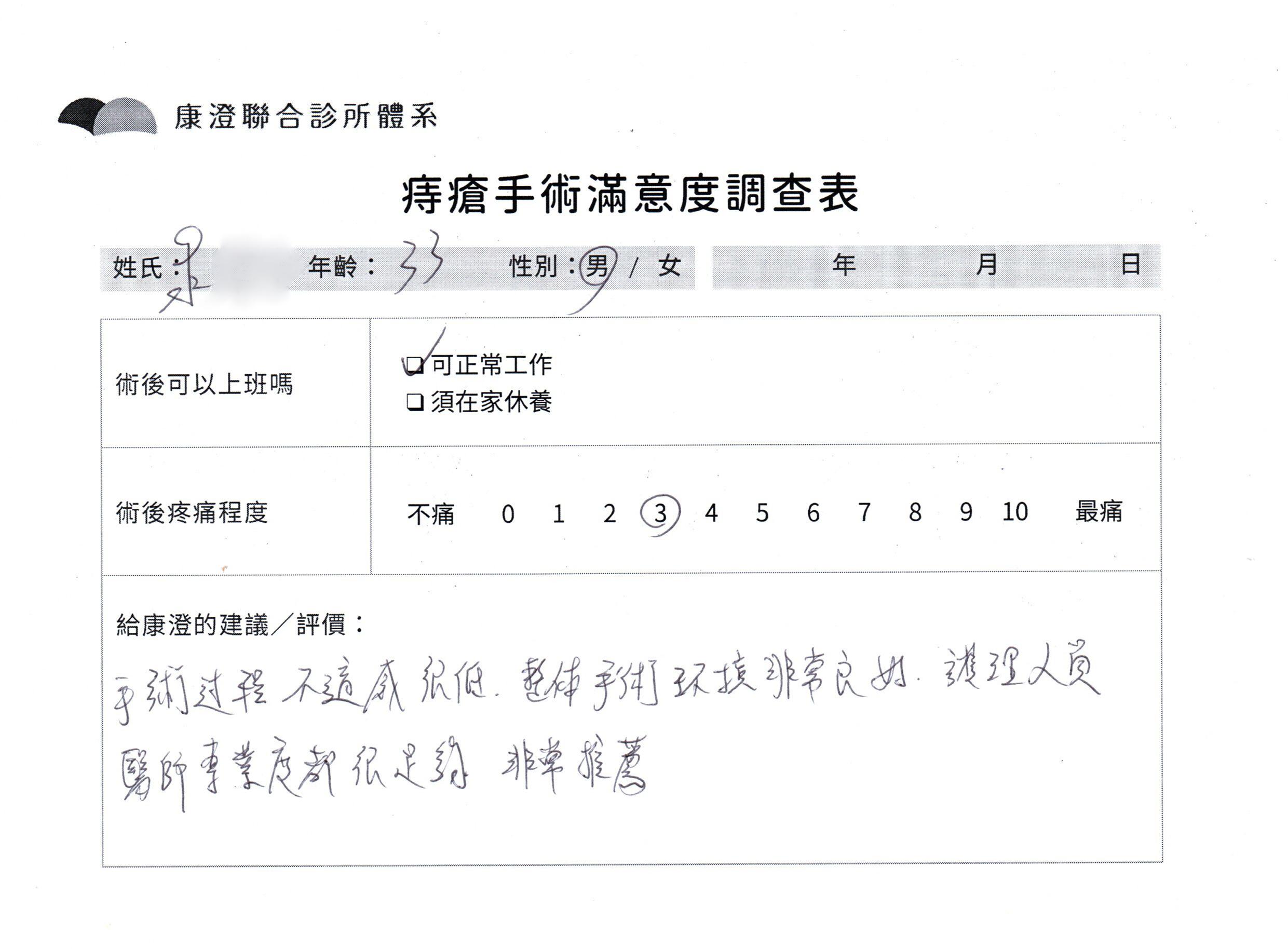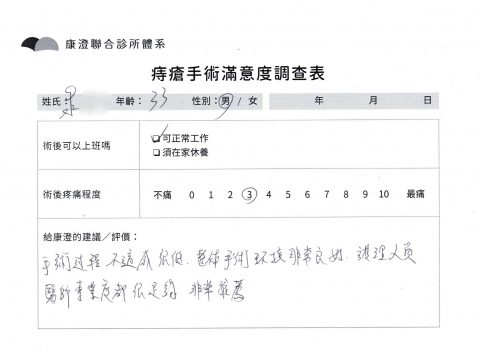 「困擾了20多年的三期內痔,終於在幾天內就解決了,原以為會很疼痛的手術及復原過程,結果真是神奇 啊!不會痛呢!長效針應該是有用的,前幾天主要是腫脹,感謝林醫師,以及術後時時電話關心的小護士們,很棒!」