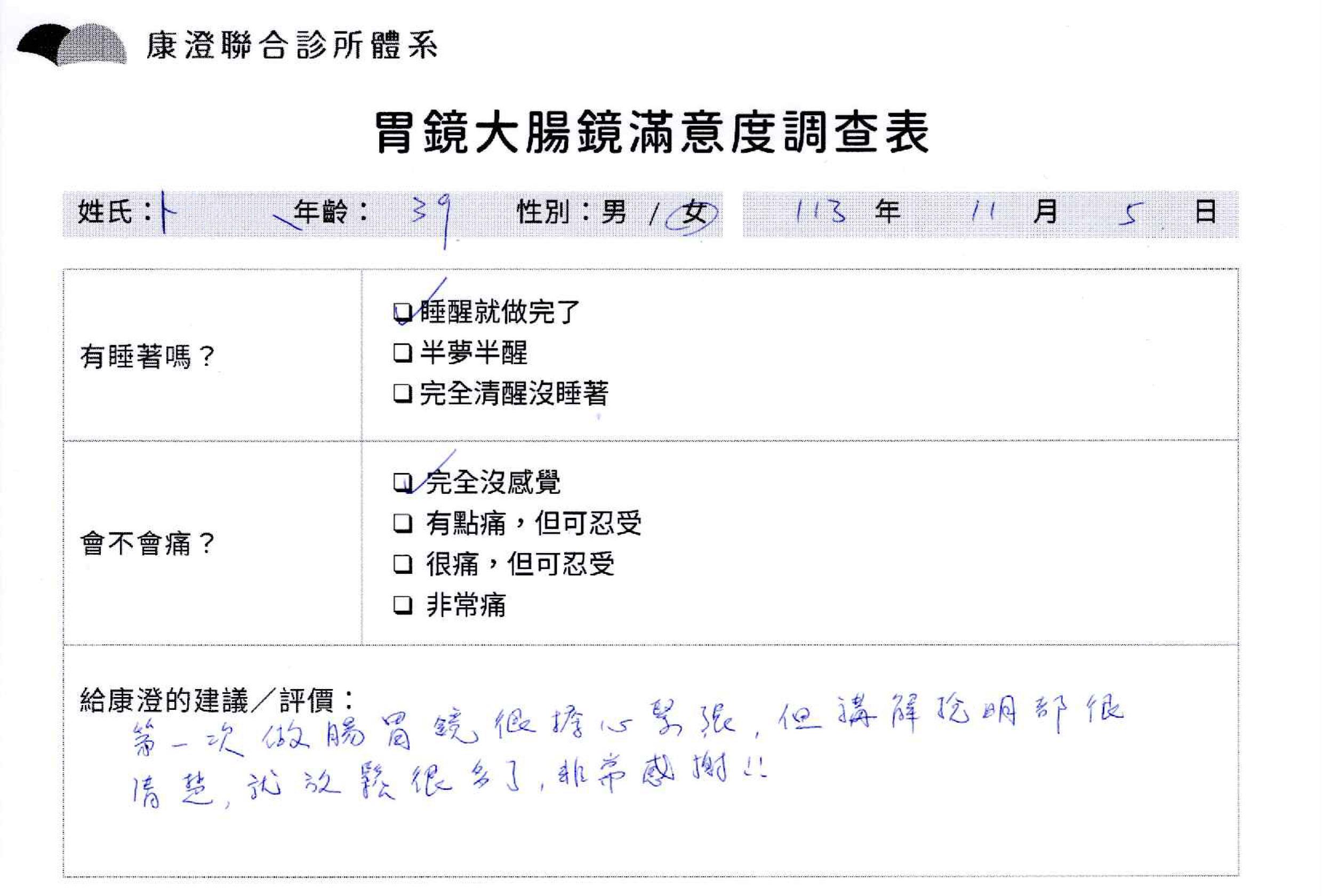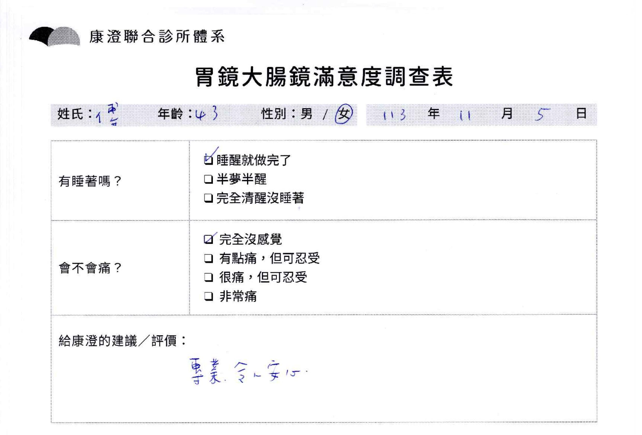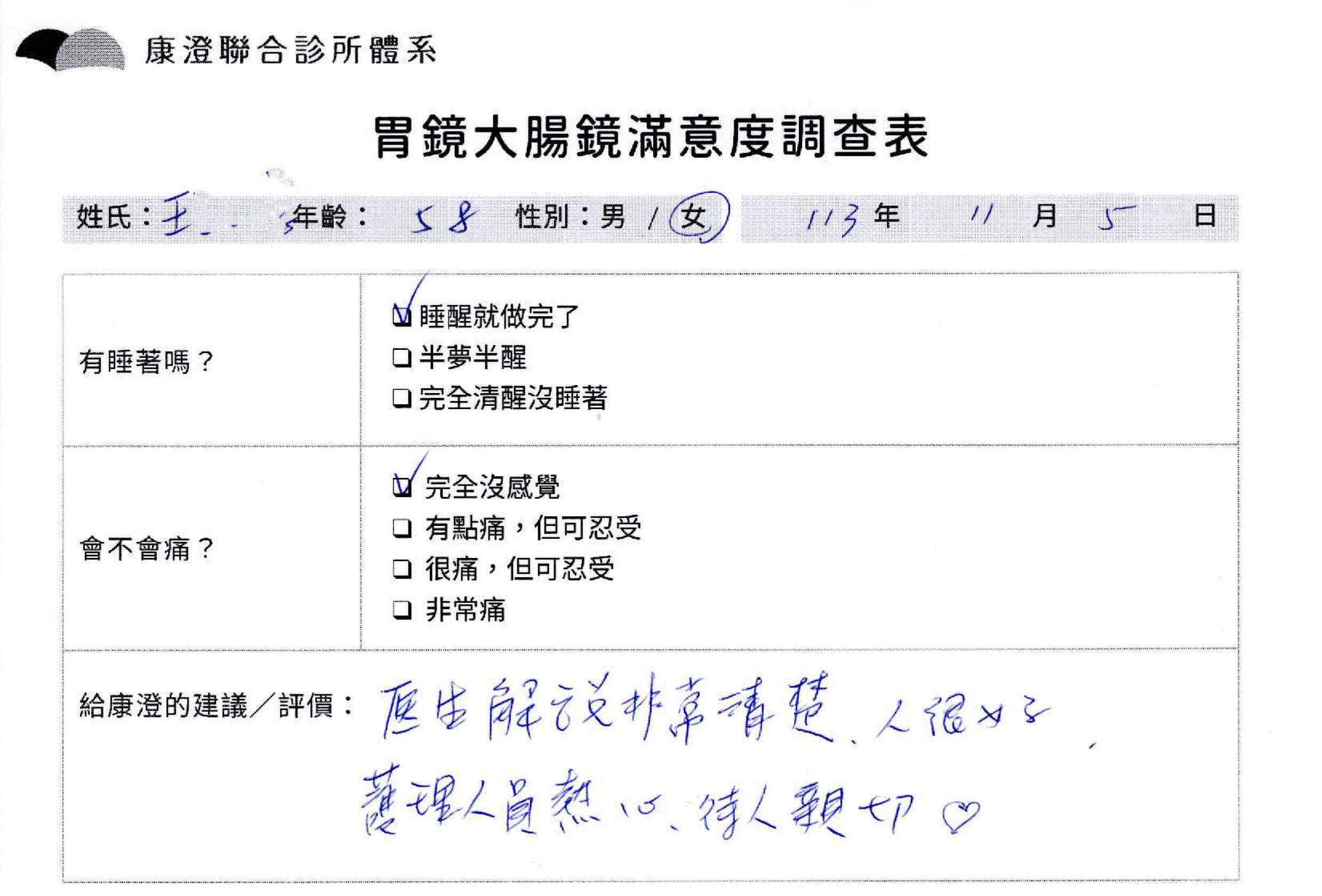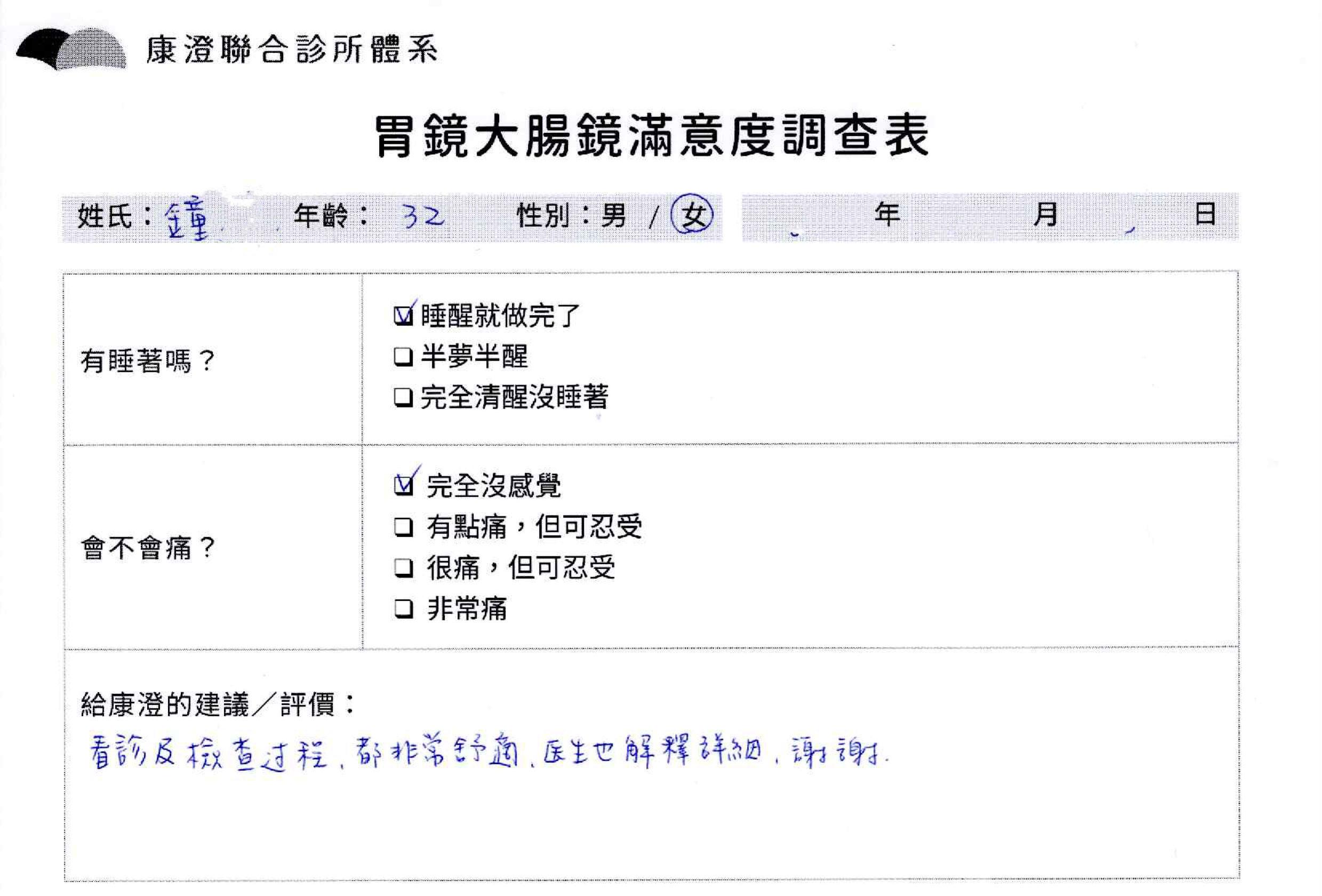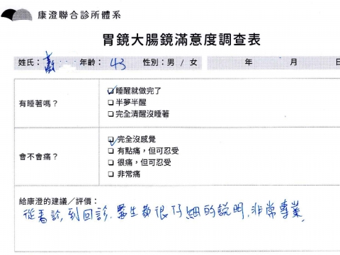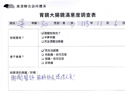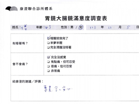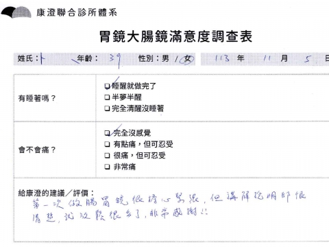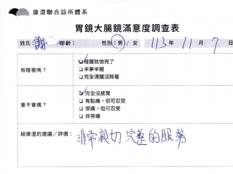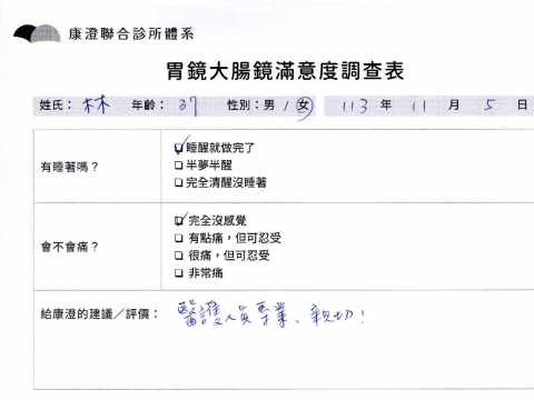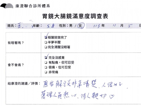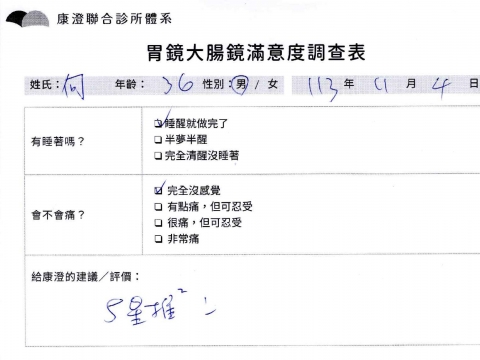 「定期穩定在櫃診所健檢,腸胃鏡的檢查醫療團隊及護理人員後續衛教的處理不輸醫院等級ㆍ專業丶舒適丶 安心,整個療程無痛,護理人員親切可降低檢查的緊張感,非常感謝!」