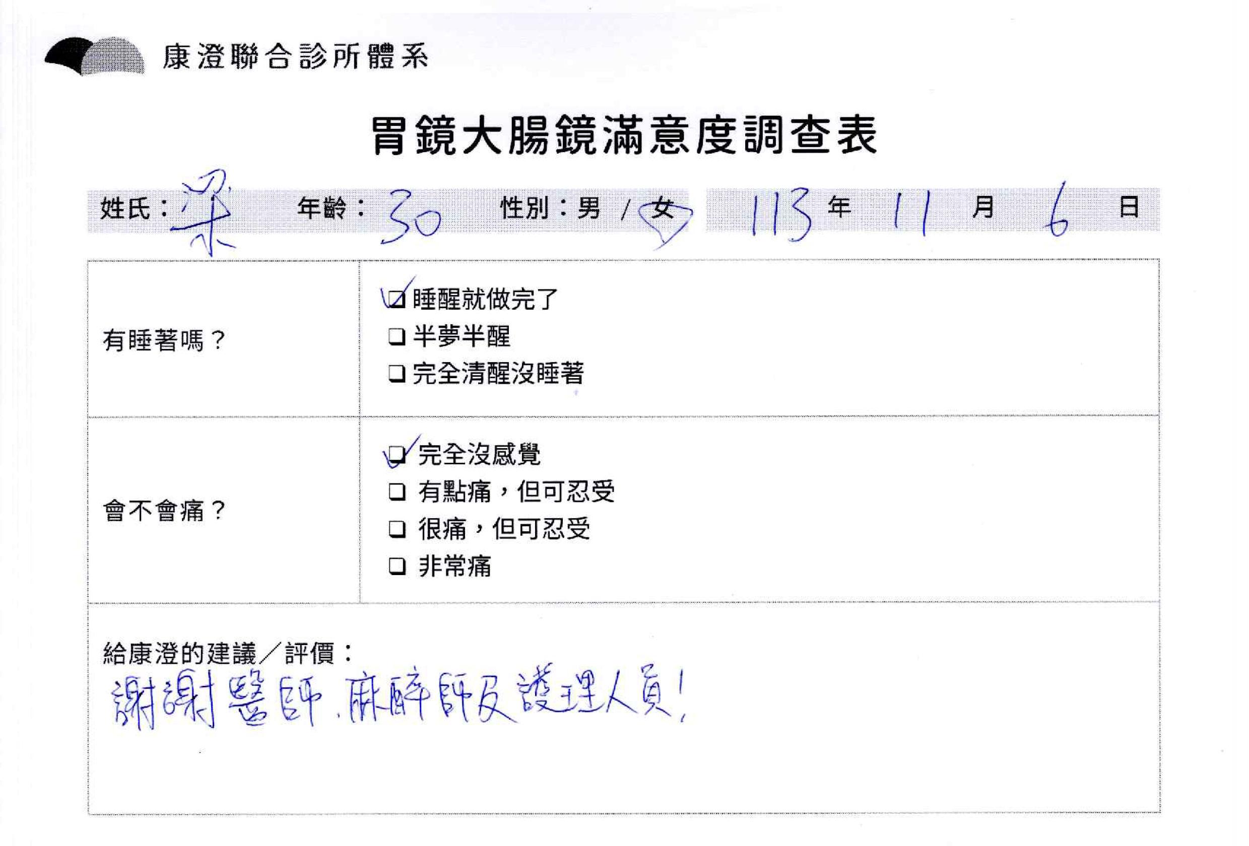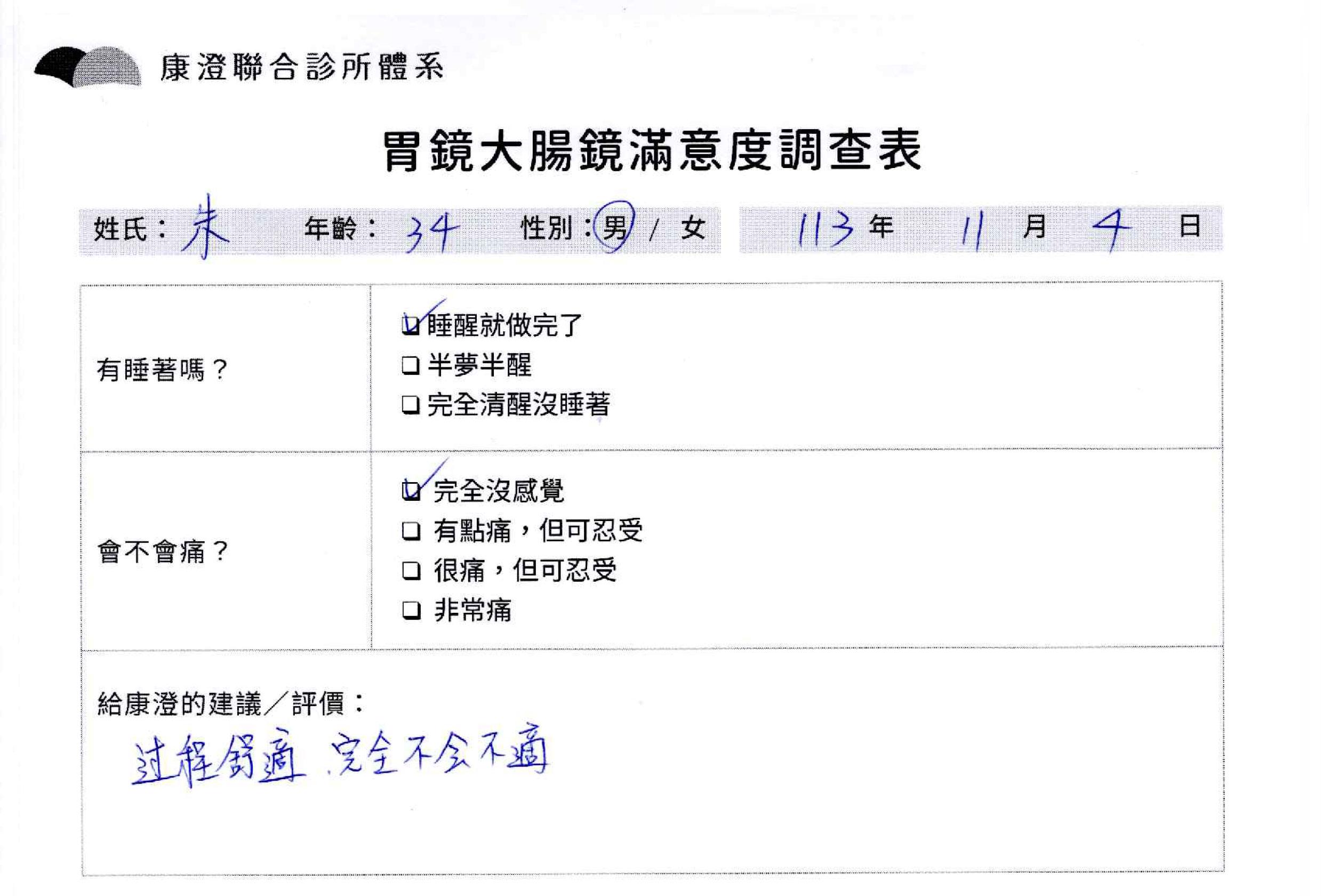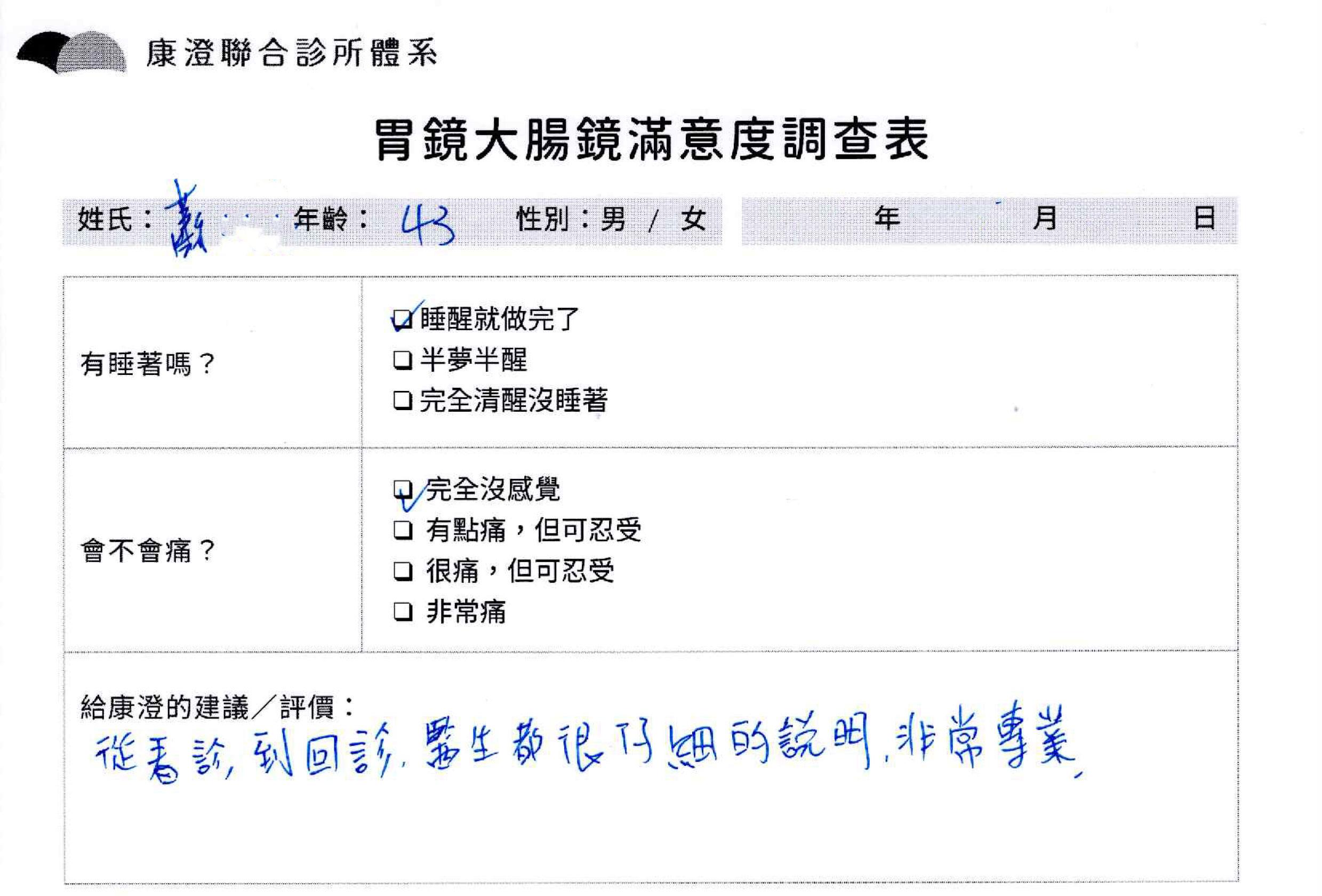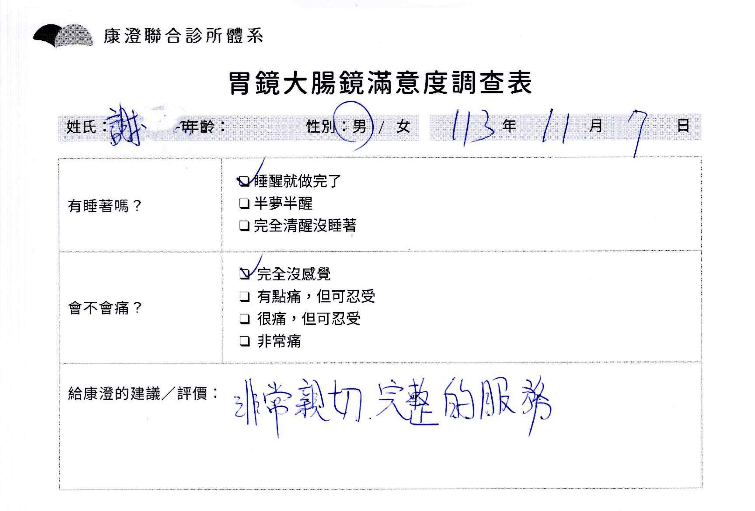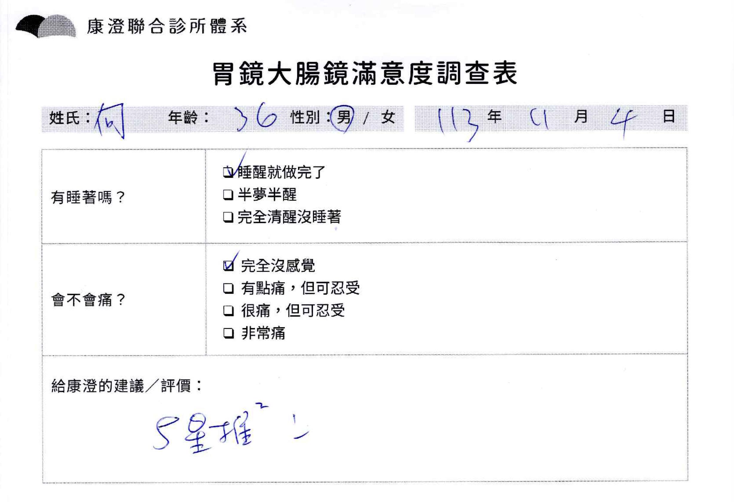 「定期穩定在櫃診所健檢,腸胃鏡的檢查醫療團隊及護理人員後續衛教的處理不輸醫院等級ㆍ專業丶舒適丶 安心,整個療程無痛,護理人員親切可降低檢查的緊張感,非常感謝!」