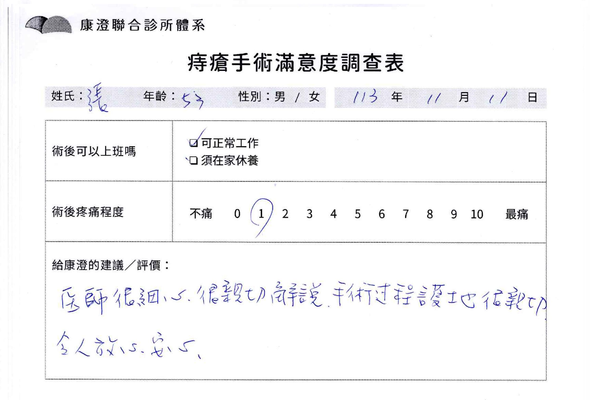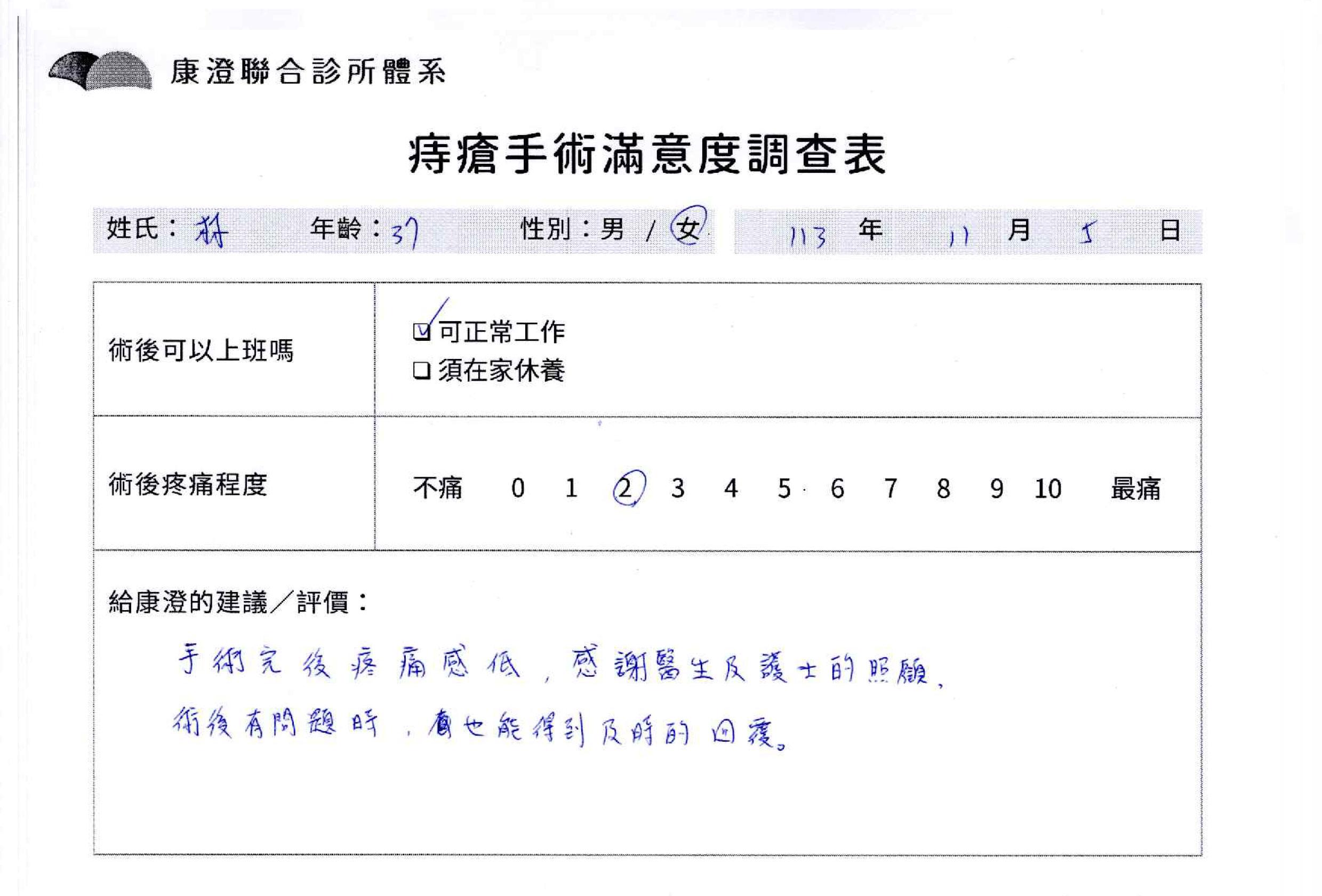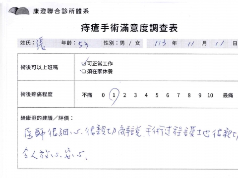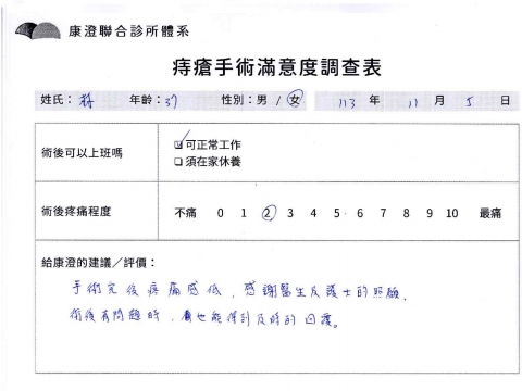 「困擾了20多年的三期內痔,終於在幾天內就解決了,原以為會很疼痛的手術及復原過程,結果真是神奇 啊!不會痛呢!長效針應該是有用的,前幾天主要是腫脹,感謝林醫師,以及術後時時電話關心的小護士們,很棒!」