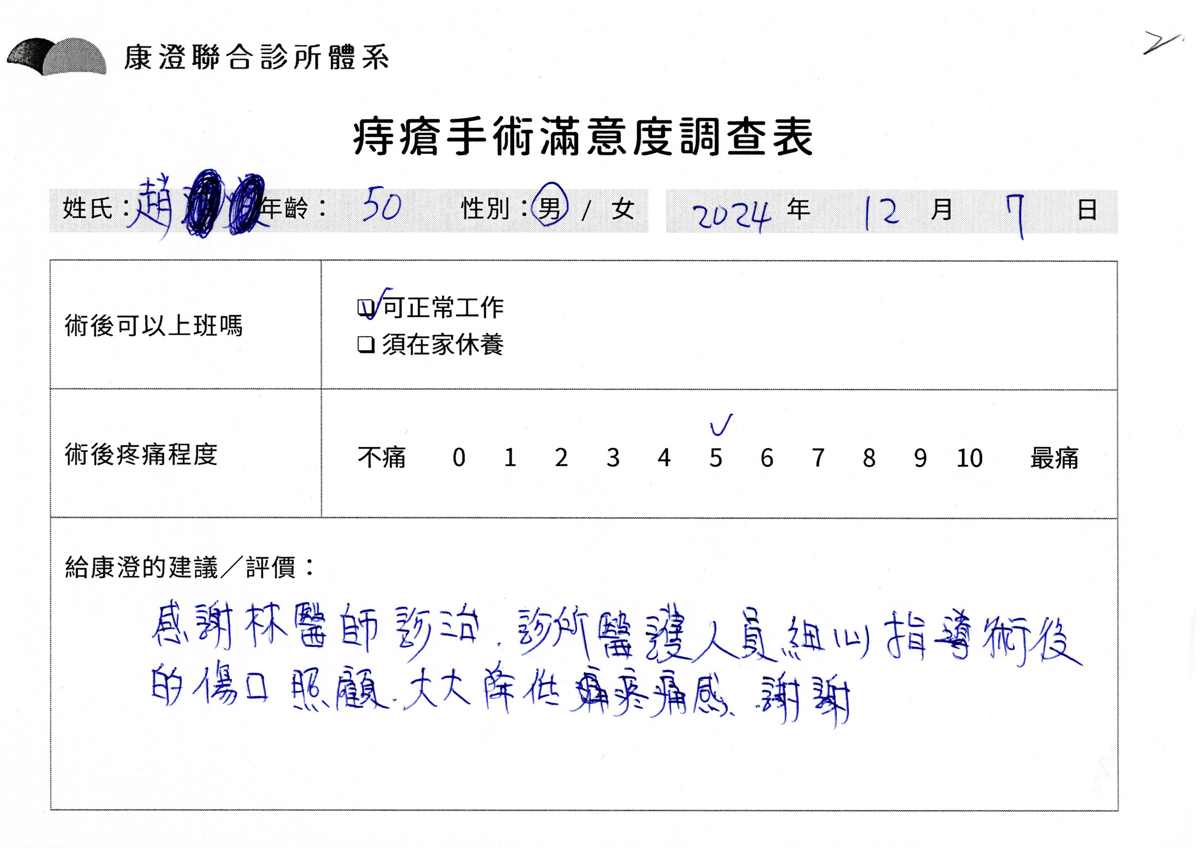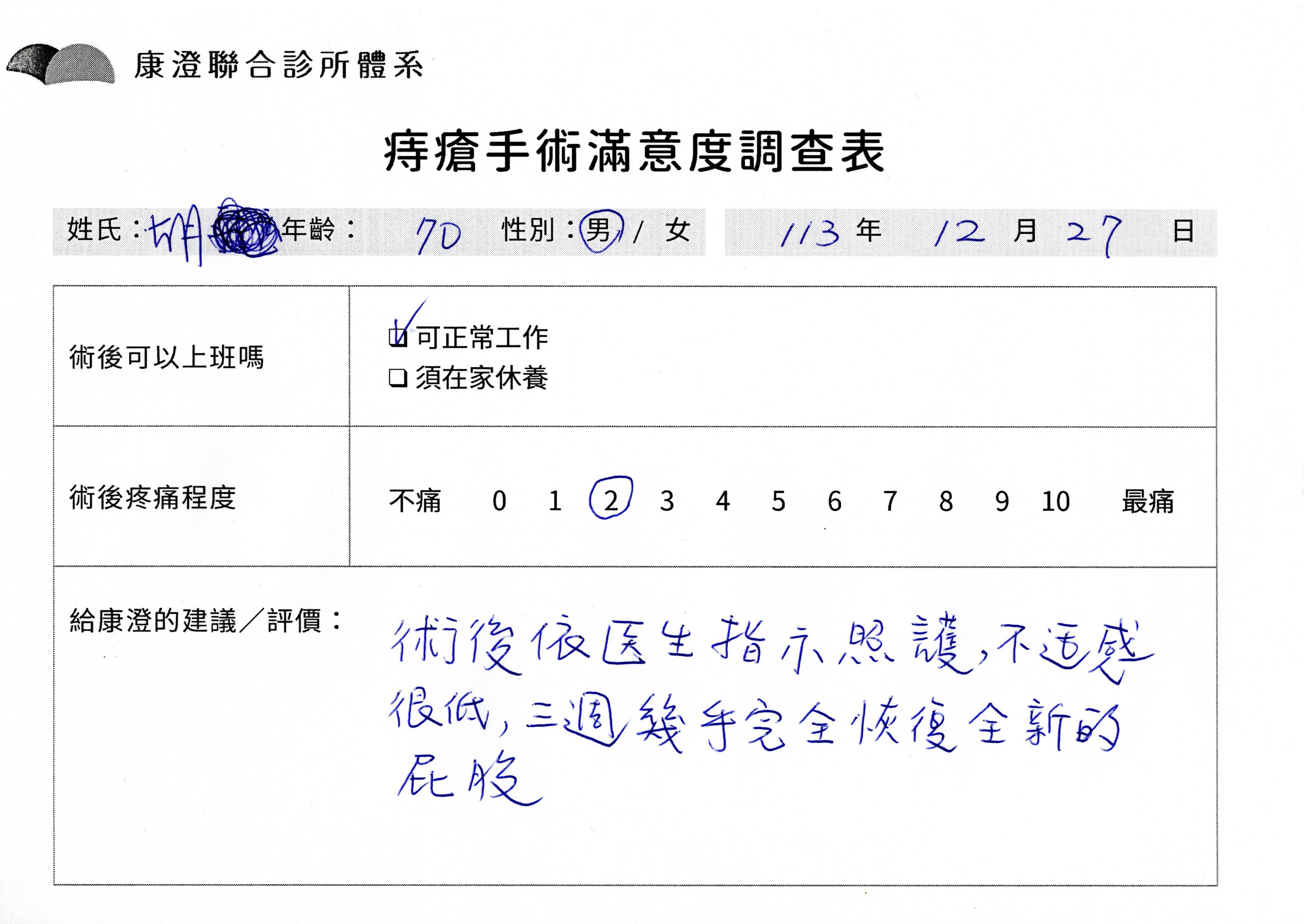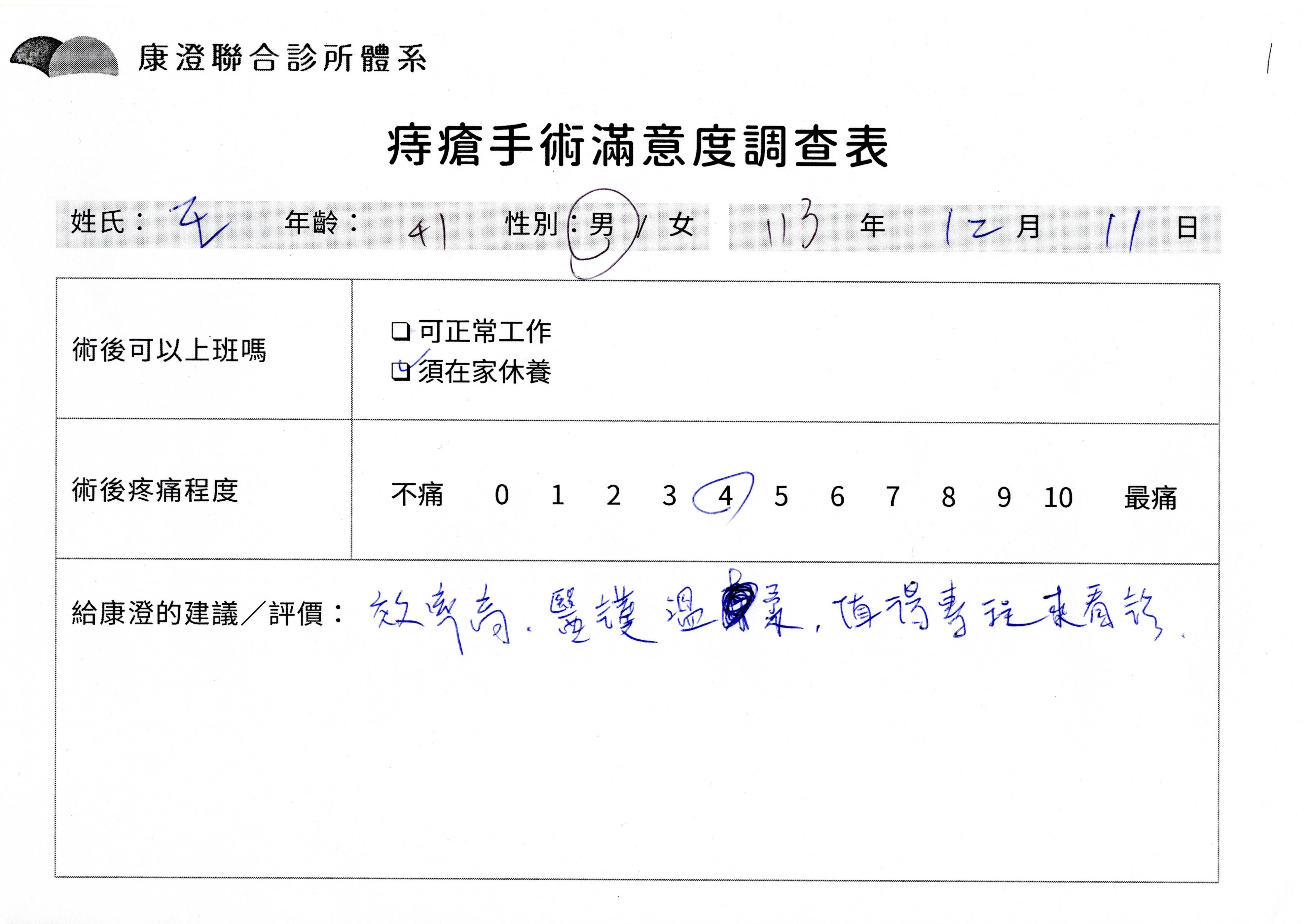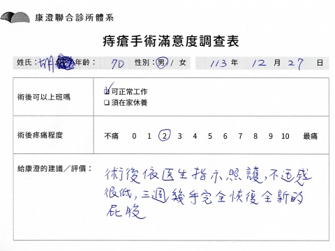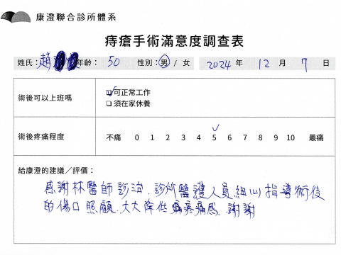「困擾了20多年的三期內痔,終於在幾天內就解決了,原以為會很疼痛的手術及復原過程,結果真是神奇 啊!不會痛呢!長效針應該是有用的,前幾天主要是腫脹,感謝林醫師,以及術後時時電話關心的小護士們,很棒!」