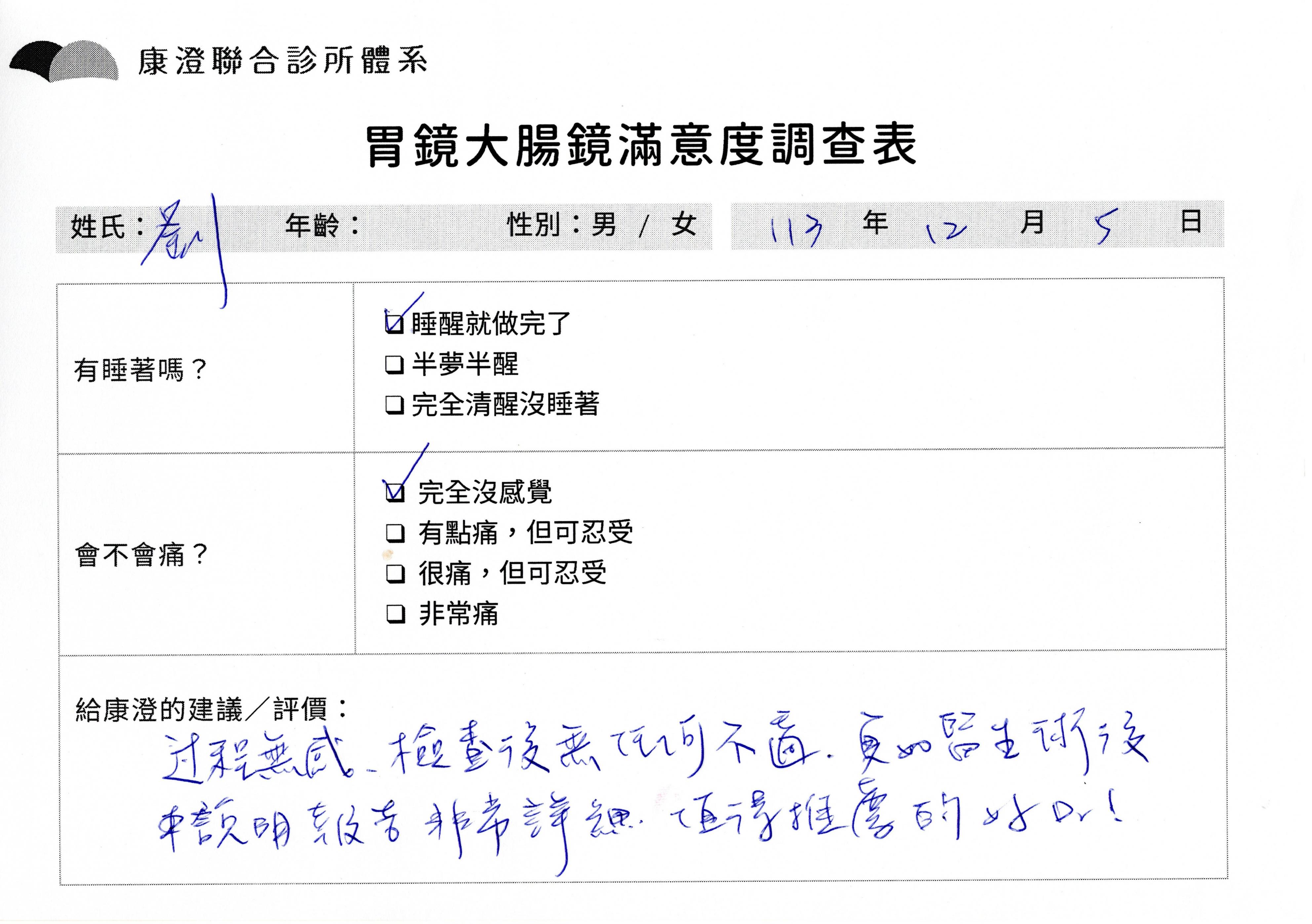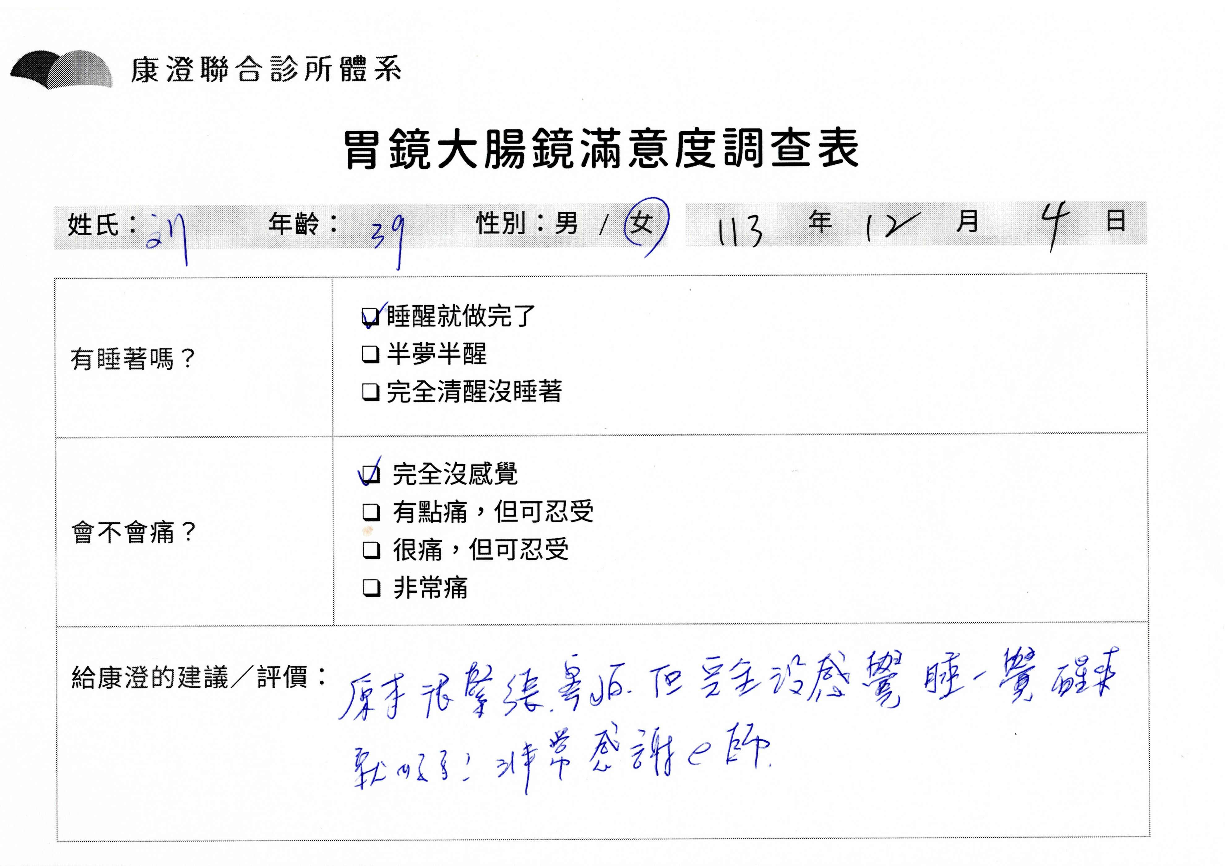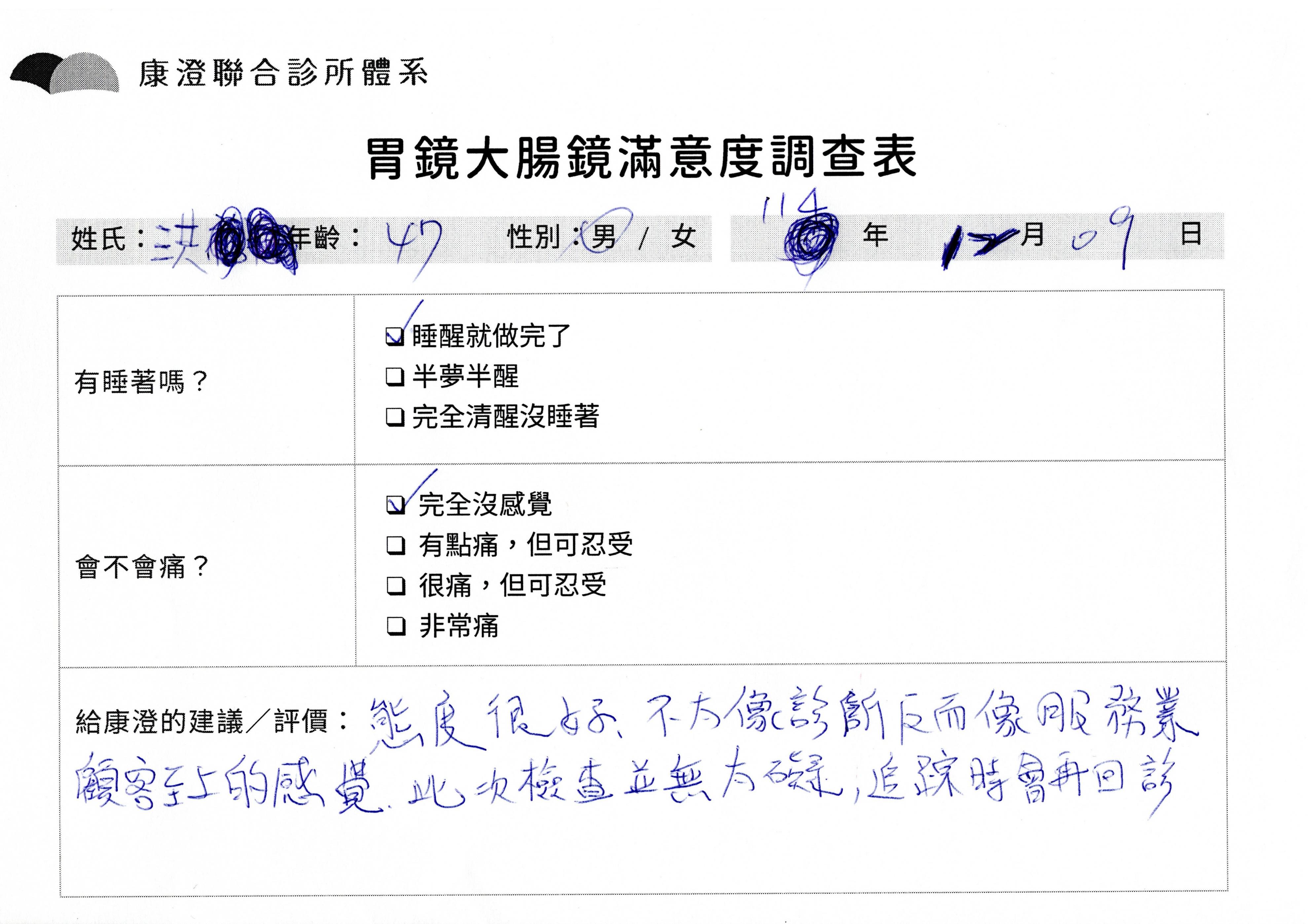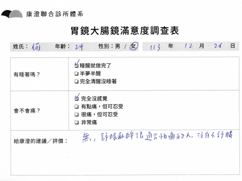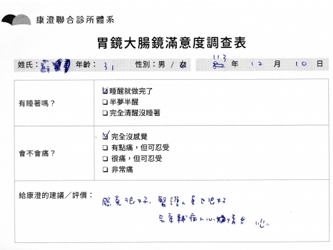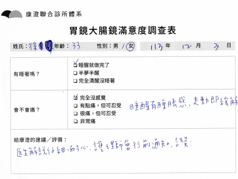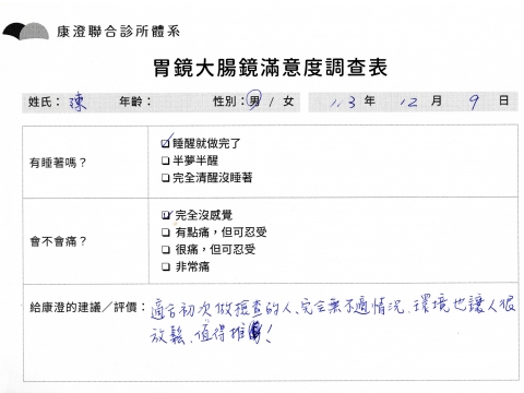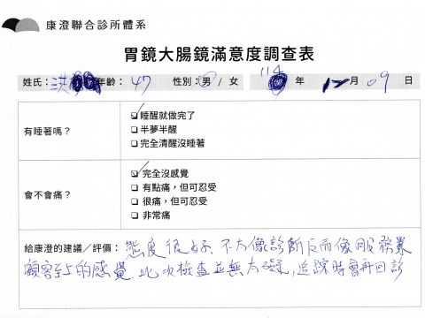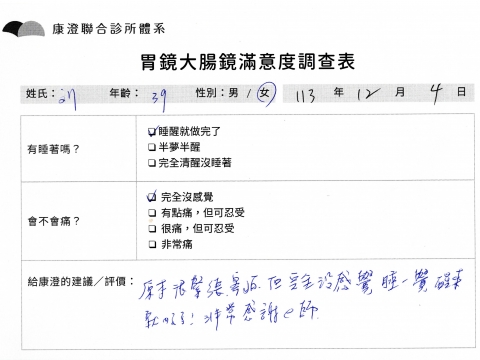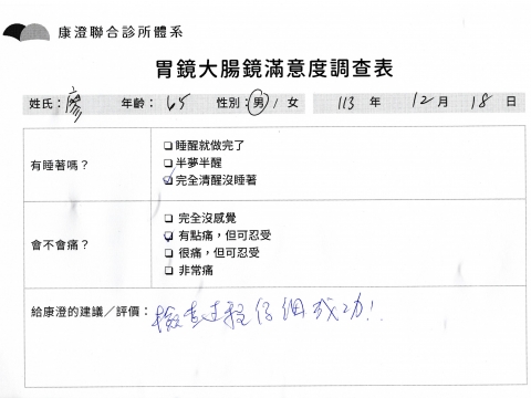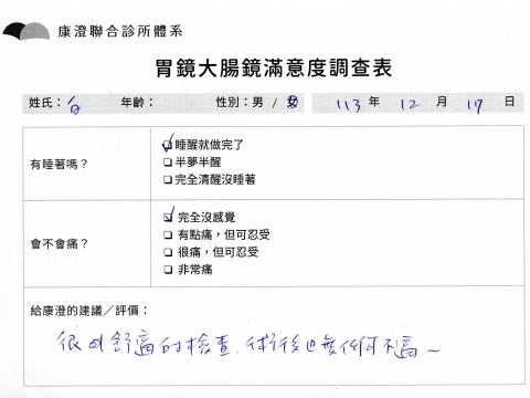 「定期穩定在櫃診所健檢,腸胃鏡的檢查醫療團隊及護理人員後續衛教的處理不輸醫院等級ㆍ專業丶舒適丶 安心,整個療程無痛,護理人員親切可降低檢查的緊張感,非常感謝!」