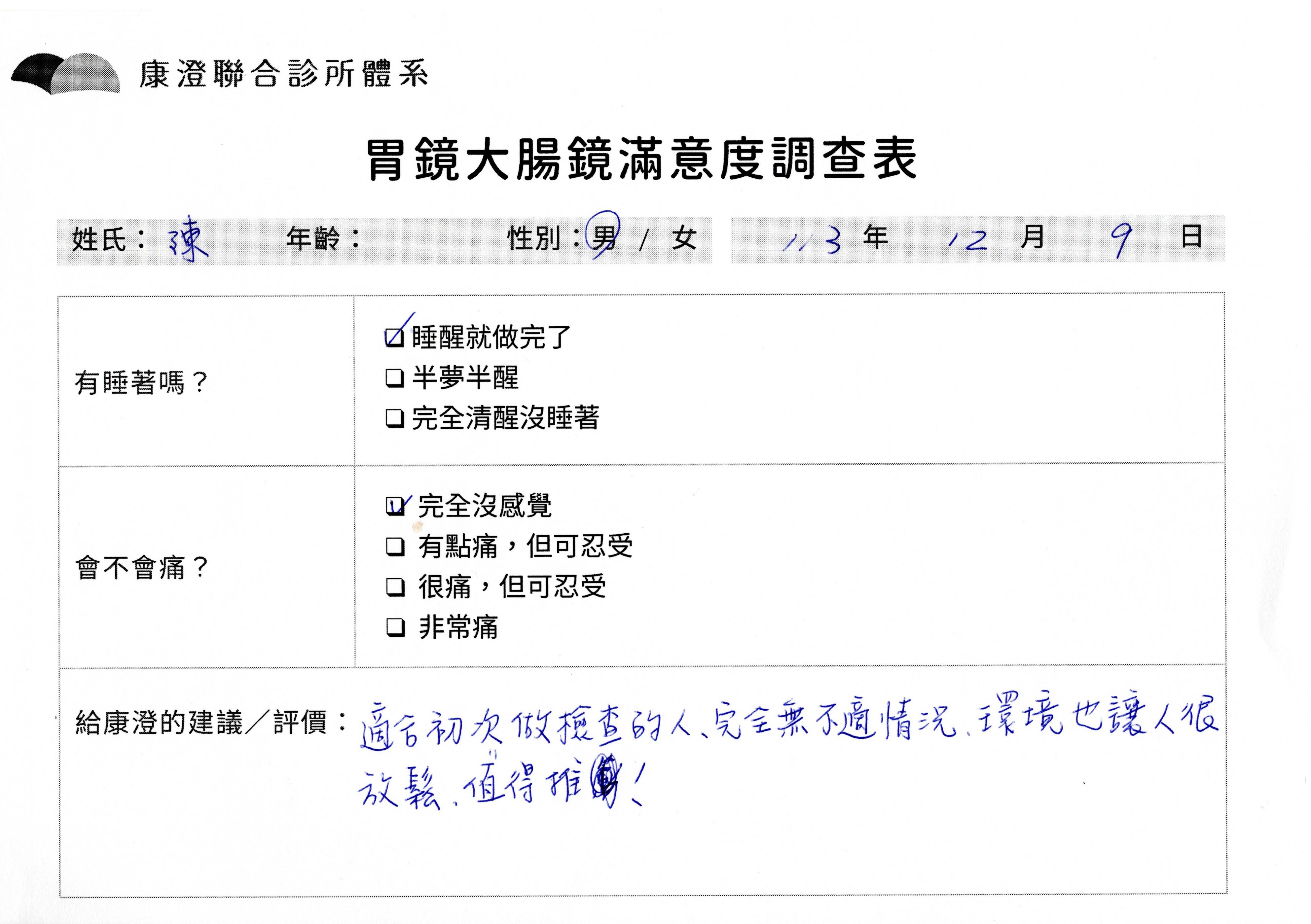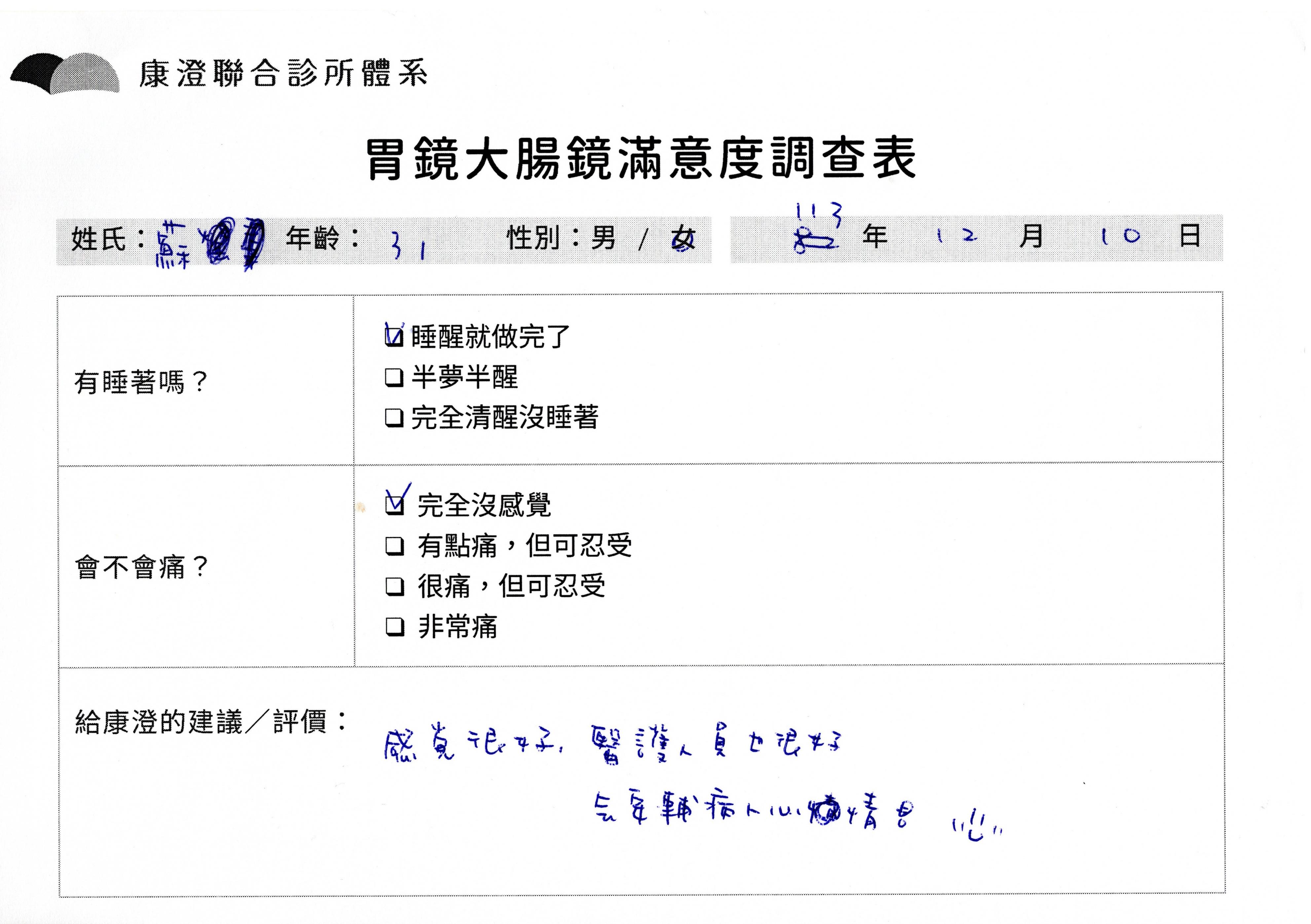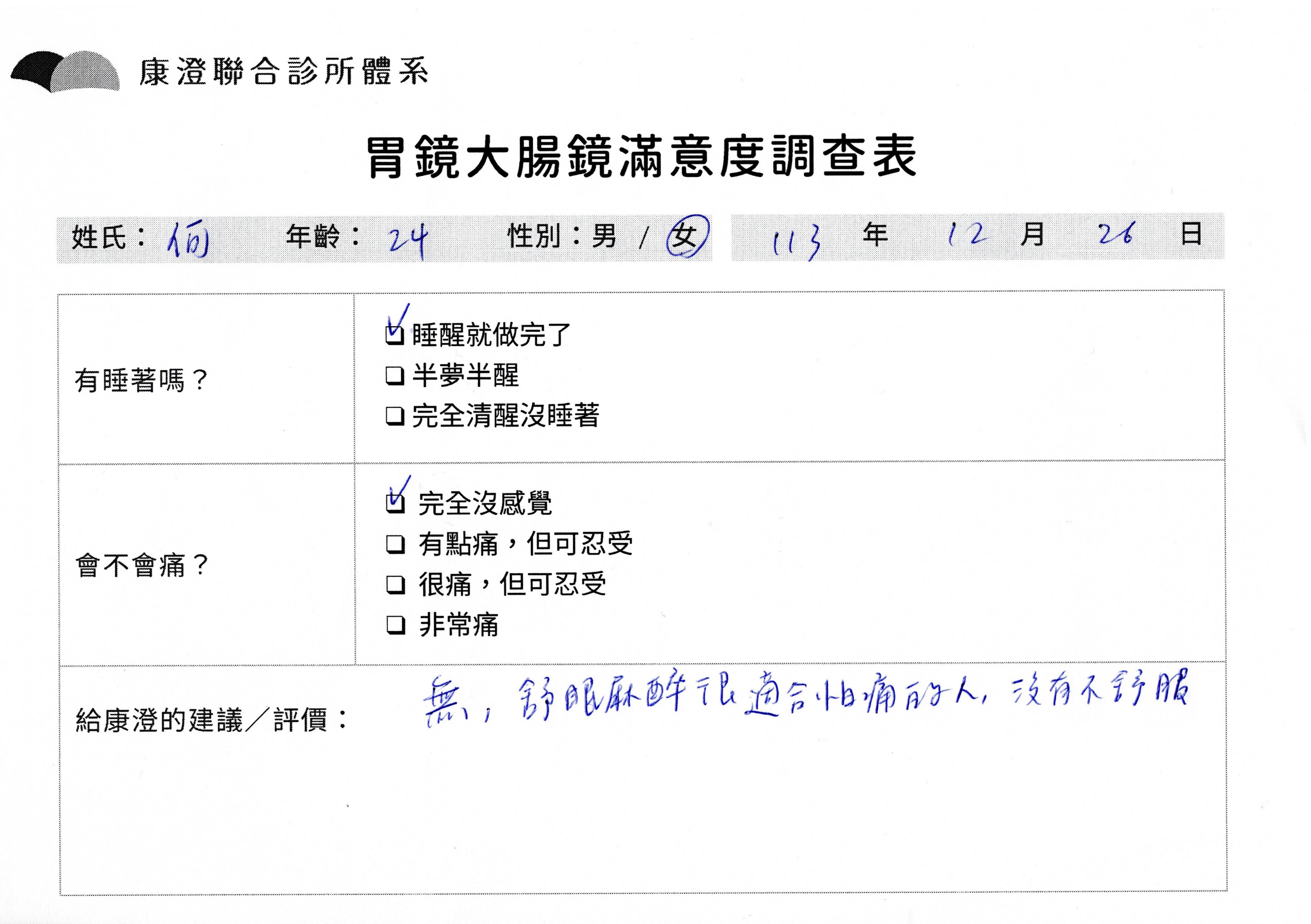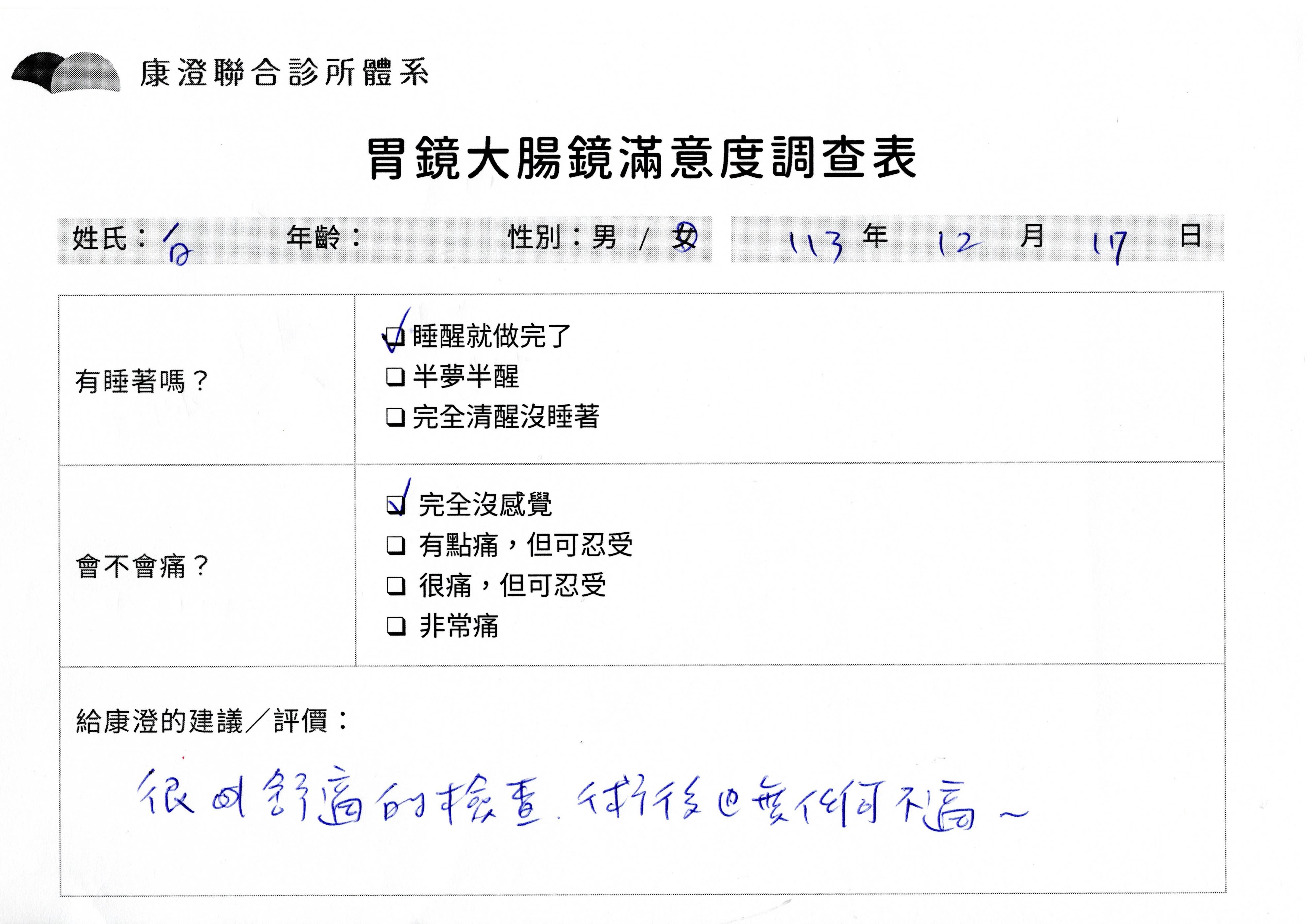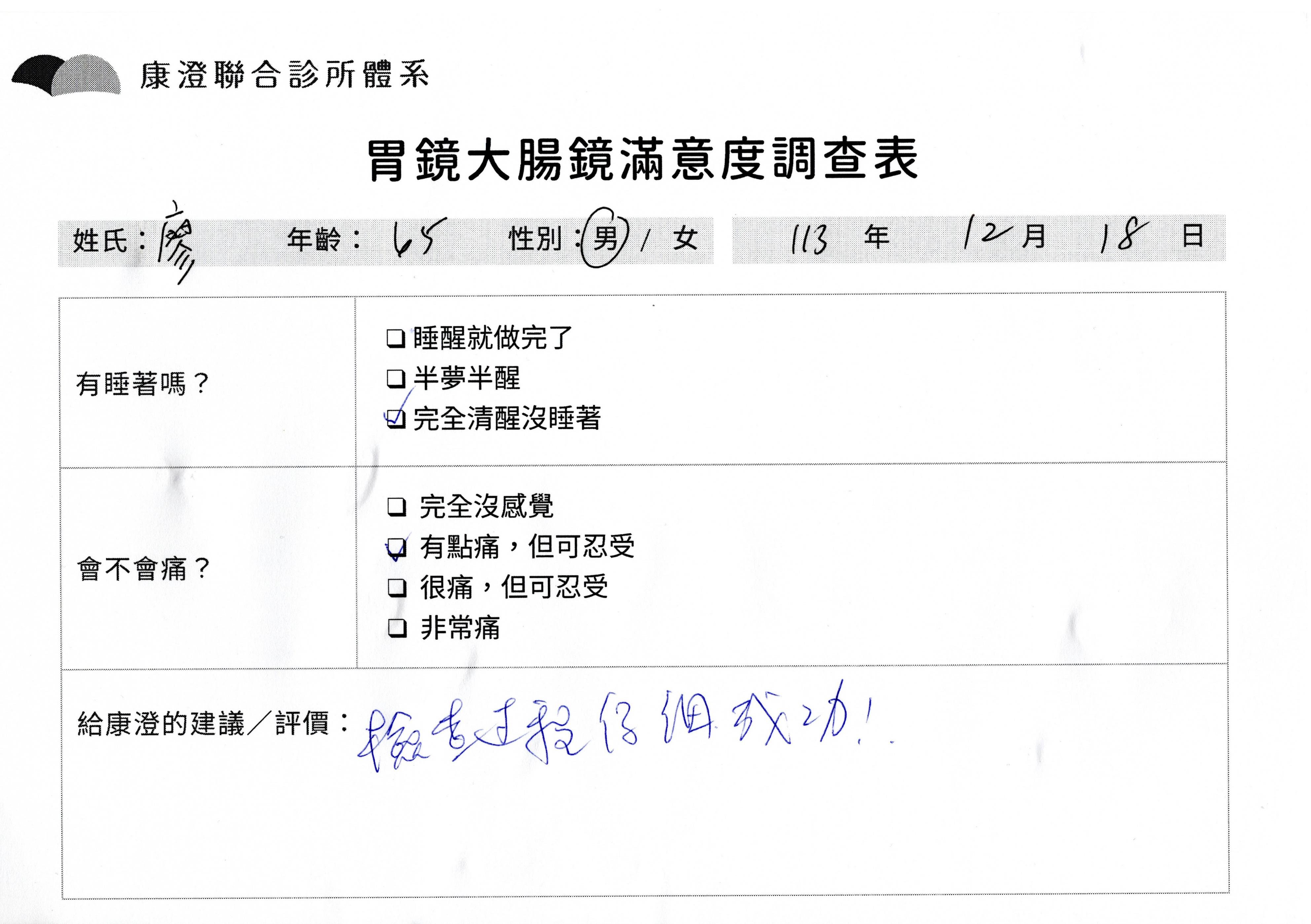 「定期穩定在櫃診所健檢,腸胃鏡的檢查醫療團隊及護理人員後續衛教的處理不輸醫院等級ㆍ專業丶舒適丶 安心,整個療程無痛,護理人員親切可降低檢查的緊張感,非常感謝!」
