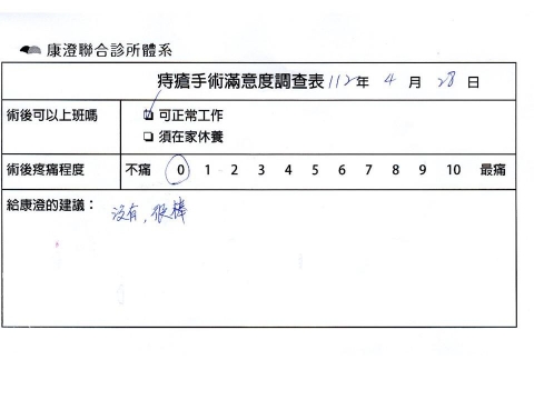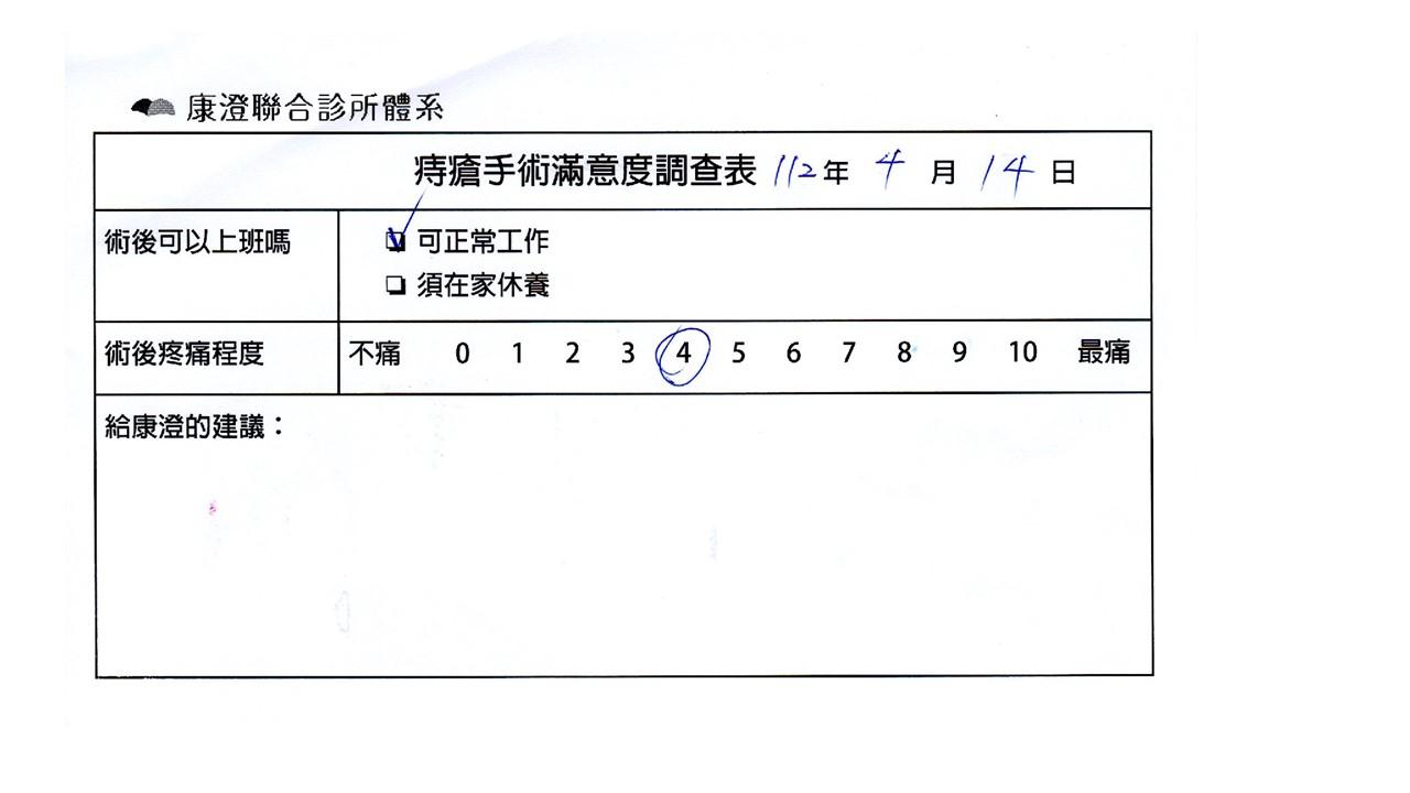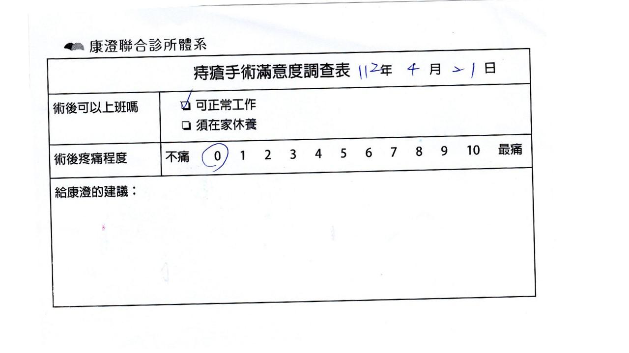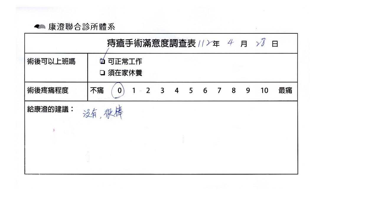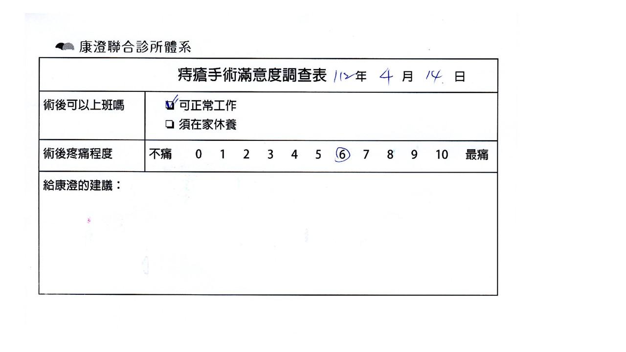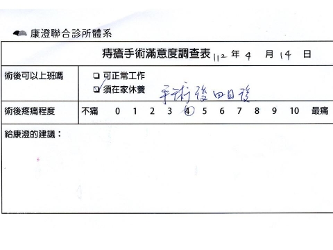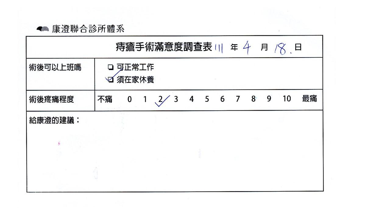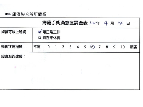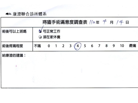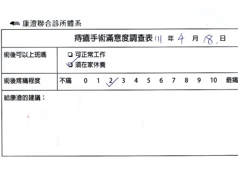 「困擾了20多年的三期內痔,終於在幾天內就解決了,原以為會很疼痛的手術及復原過程,結果真是神奇啊!不會痛呢!長效針應該是有用的,前幾天主要是腫脹,感謝林醫師,以及術後時時電話關心的小護士們,很棒!」