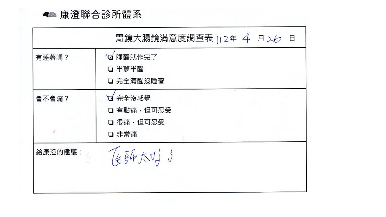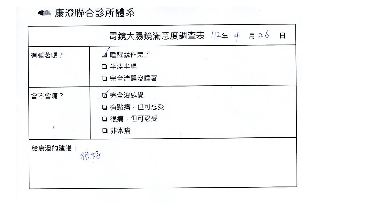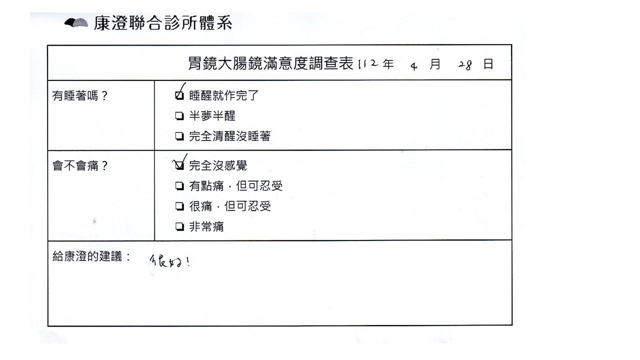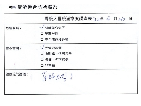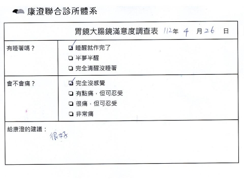 「定期穩定在櫃診所健檢,腸胃鏡的檢查醫療團隊及護理人員後續衛教的處理不輸醫院等級ㆍ專業丶舒適丶安心,整個療程無痛,護理人員親切可降低檢查的緊張感,非常感謝!」