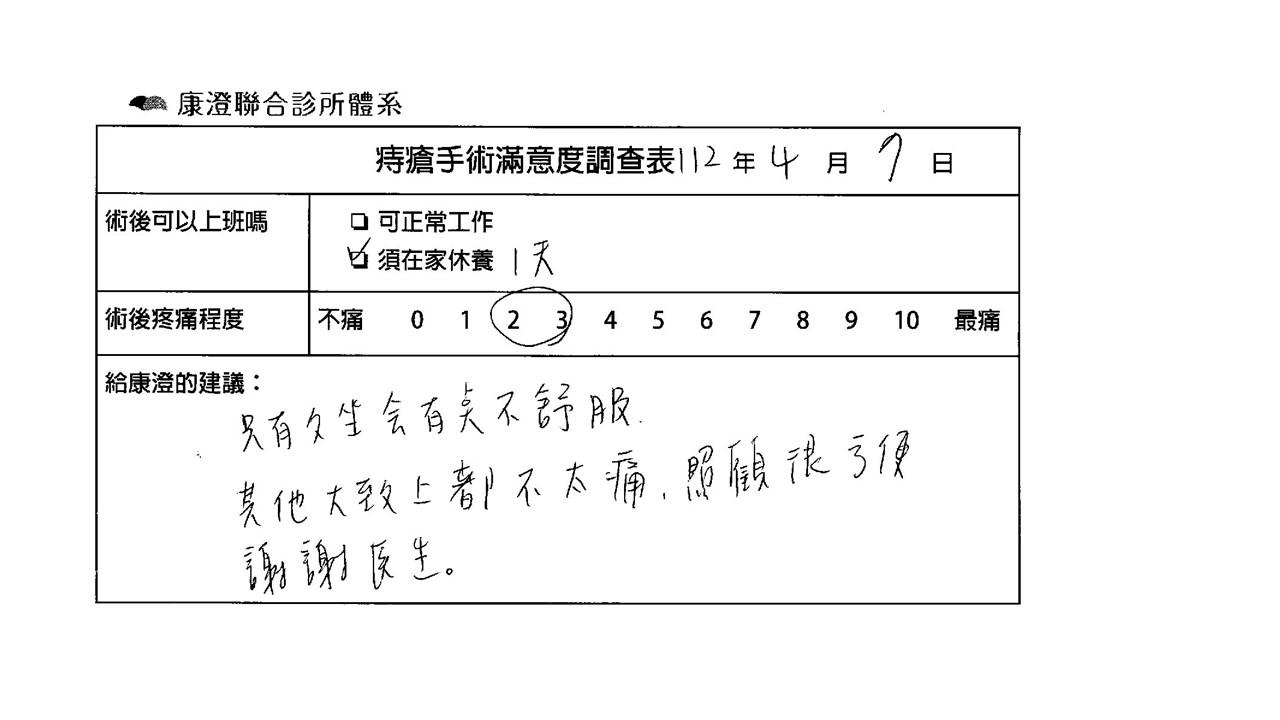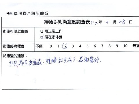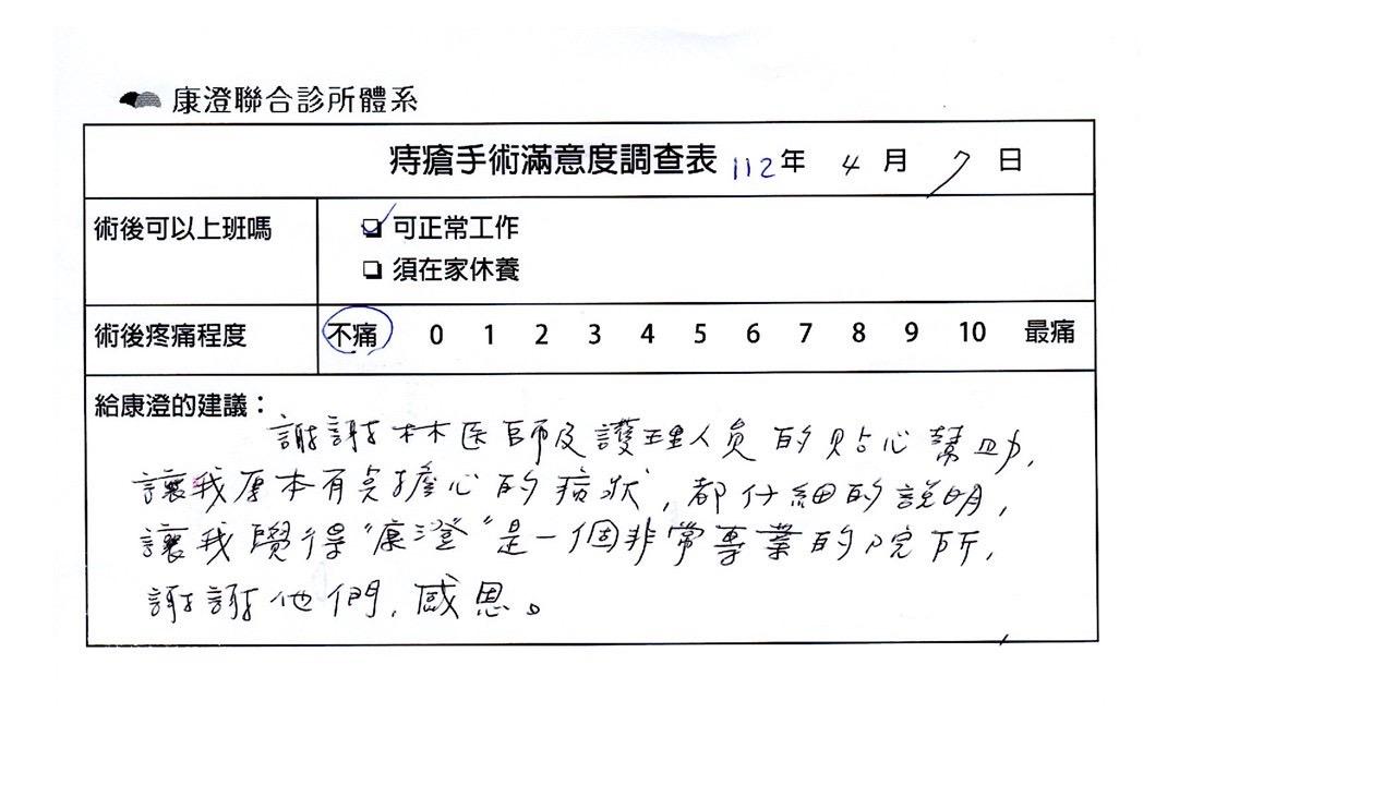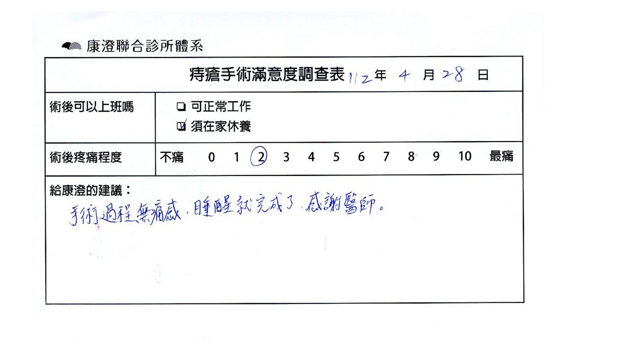 「困擾了20多年的三期內痔,終於在幾天內就解決了,原以為會很疼痛的手術及復原過程,結果真是神奇啊!不會痛呢!長效針應該是有用的,前幾天主要是腫脹,感謝林醫師,以及術後時時電話關心的小護士們,很棒!」