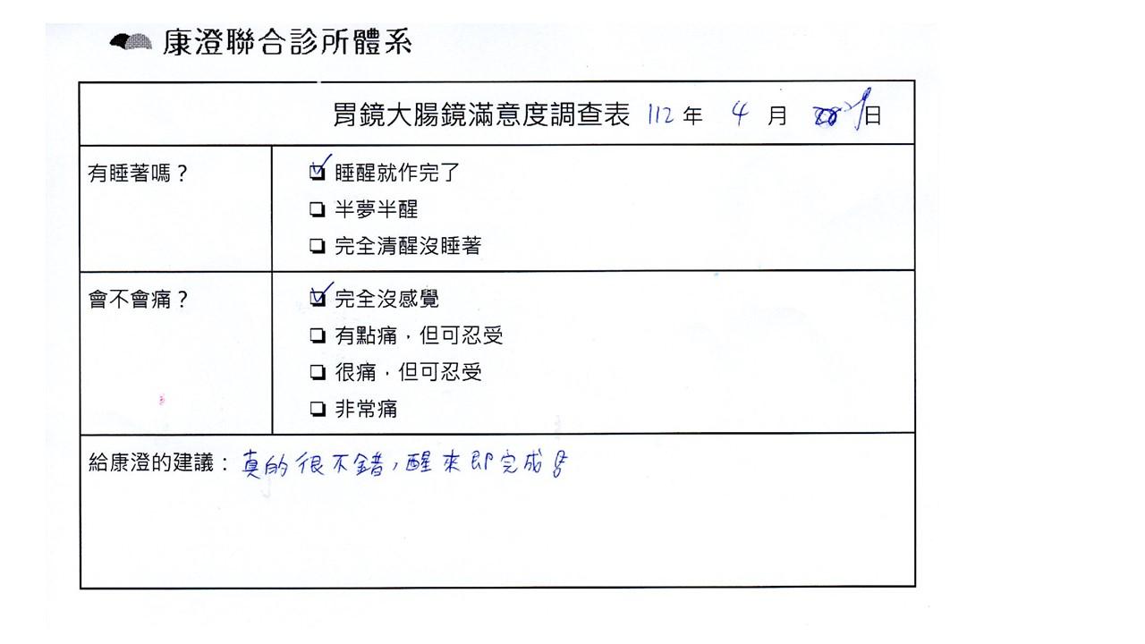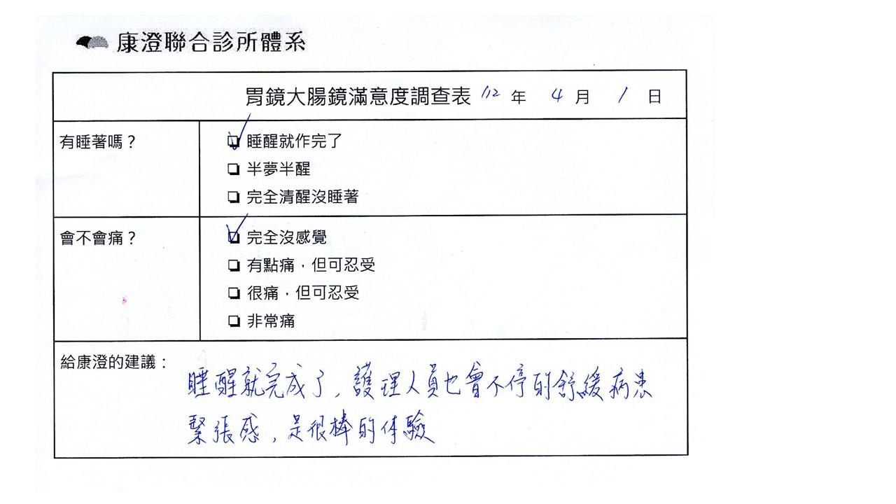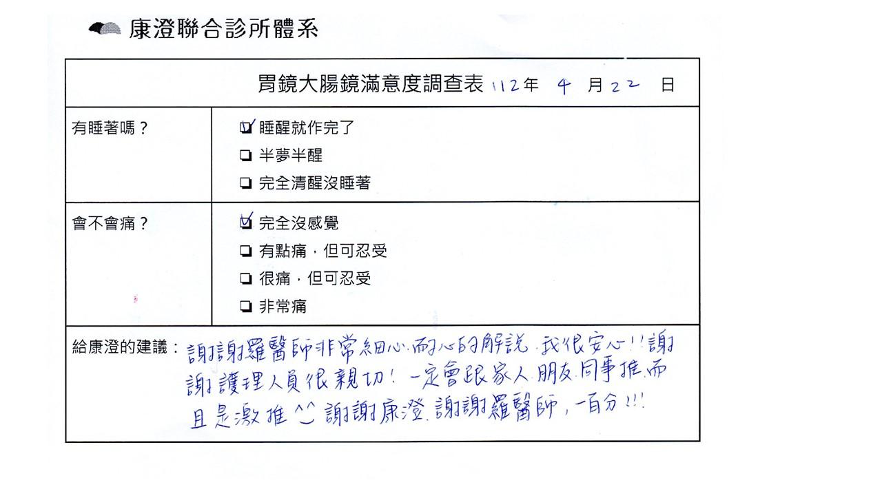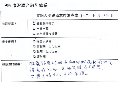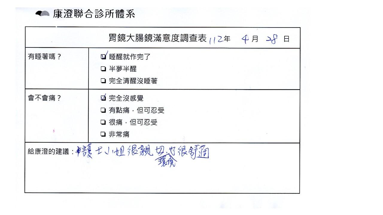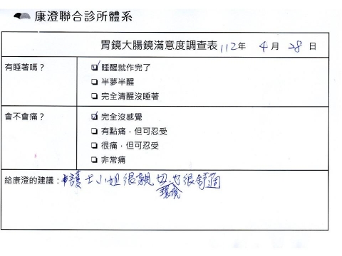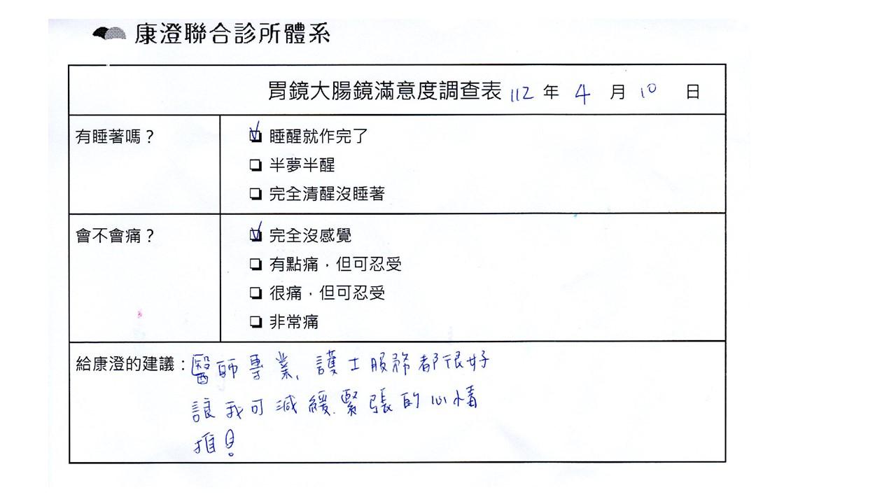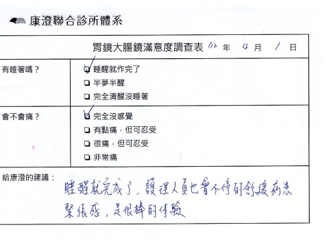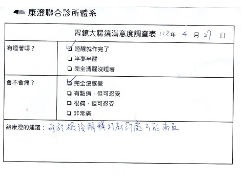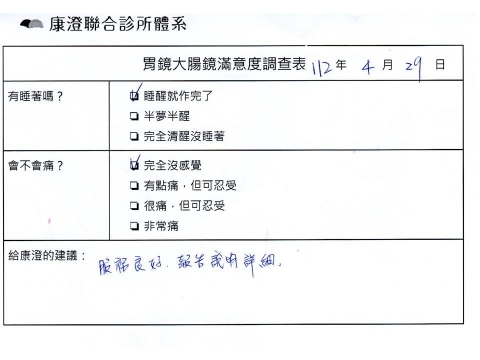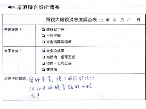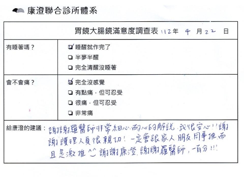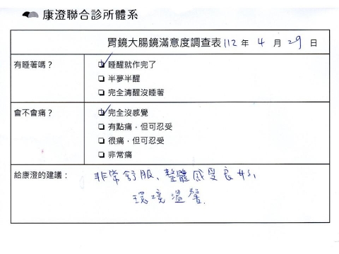 「定期穩定在櫃診所健檢,腸胃鏡的檢查醫療團隊及護理人員後續衛教的處理不輸醫院等級ㆍ專業丶舒適丶安心,整個療程無痛,護理人員親切可降低檢查的緊張感,非常感謝!」