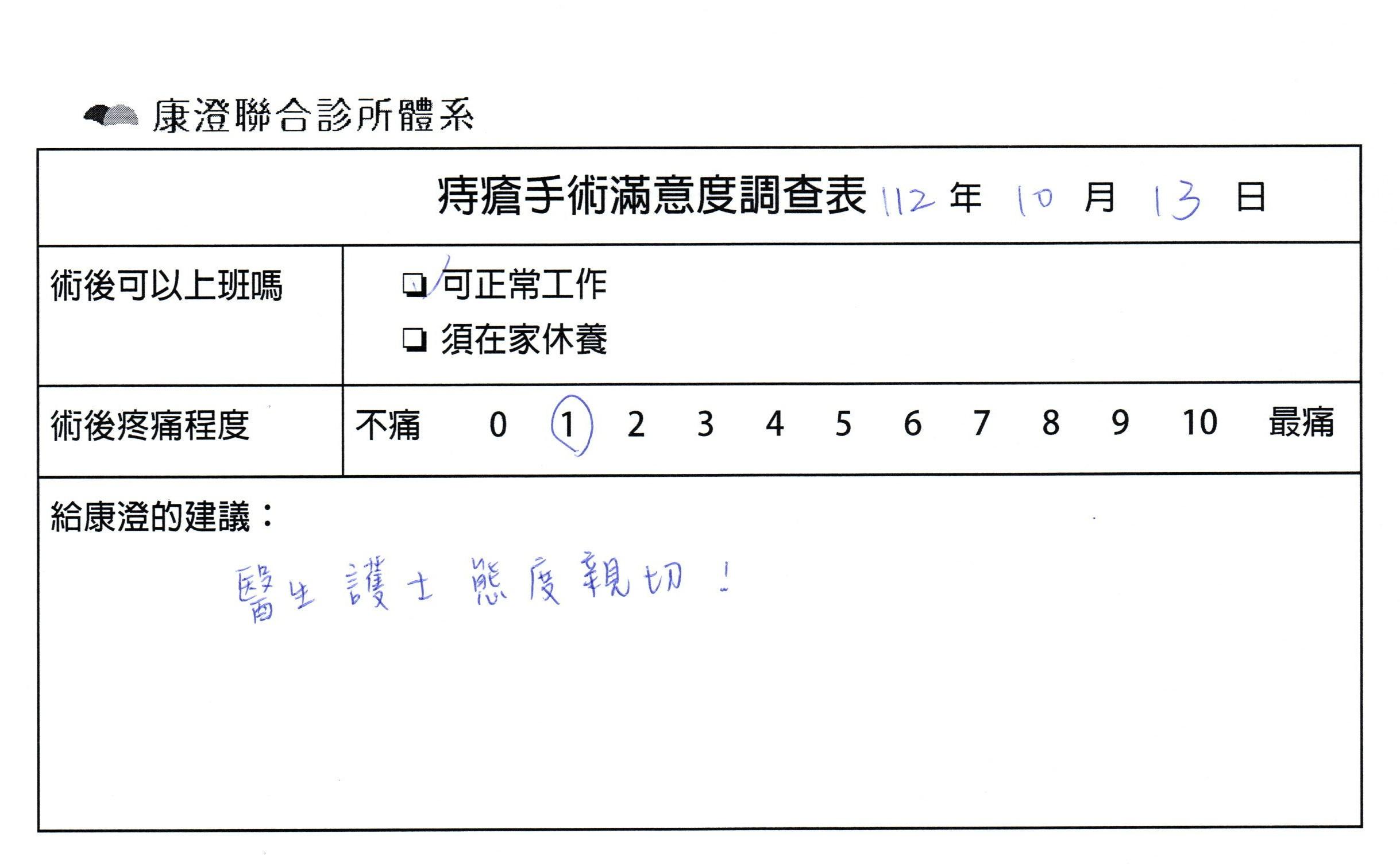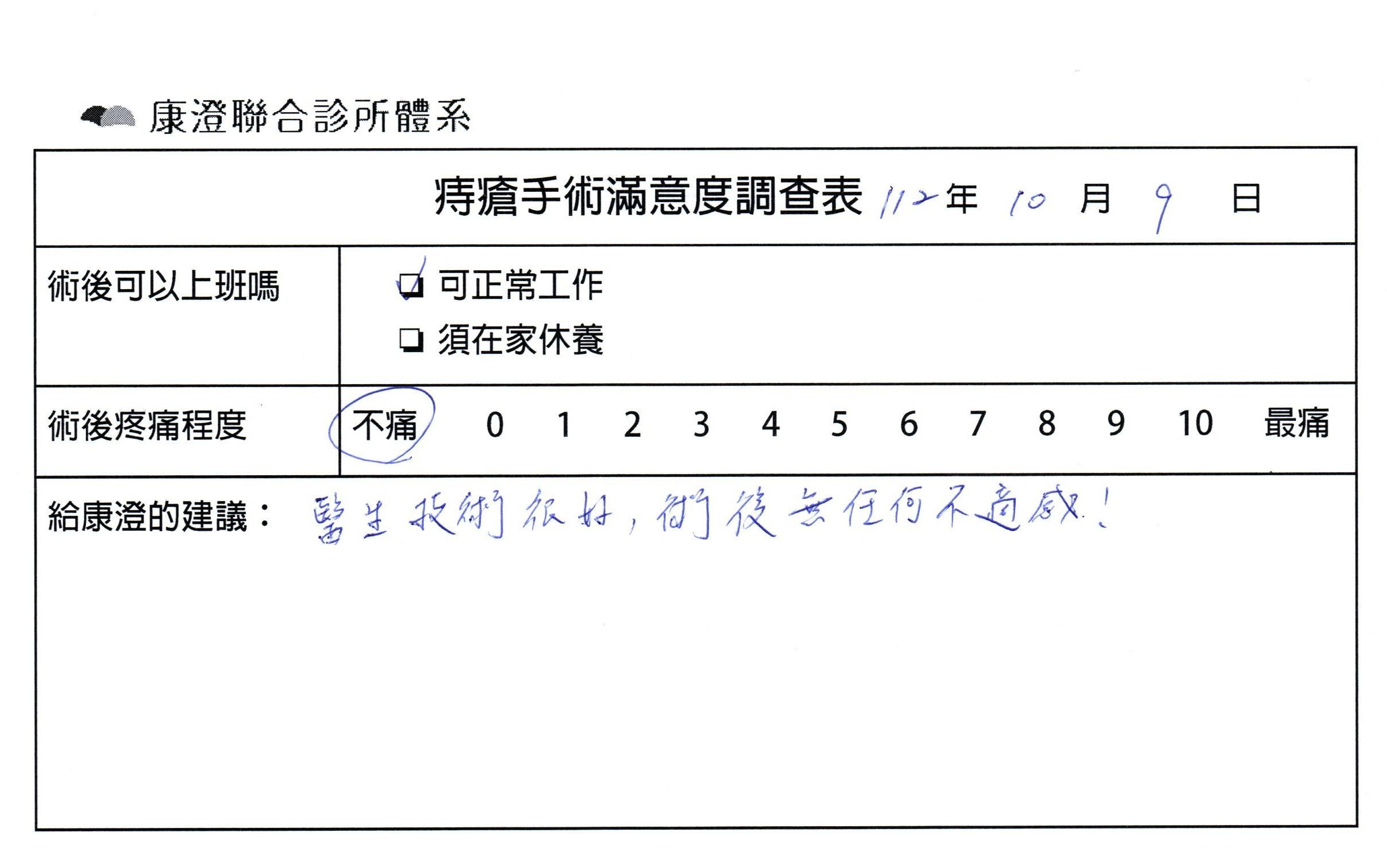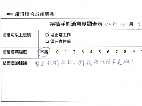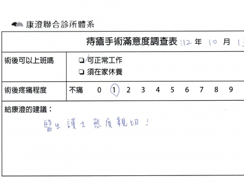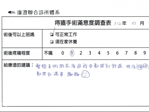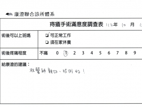 「困擾了20多年的三期內痔,終於在幾天內就解決了,原以為會很疼痛的手術及復原過程,結果真是神奇啊!不會痛呢!長效針應該是有用的,前幾天主要是腫脹,感謝林醫師,以及術後時時電話關心的小護士們,很棒!」