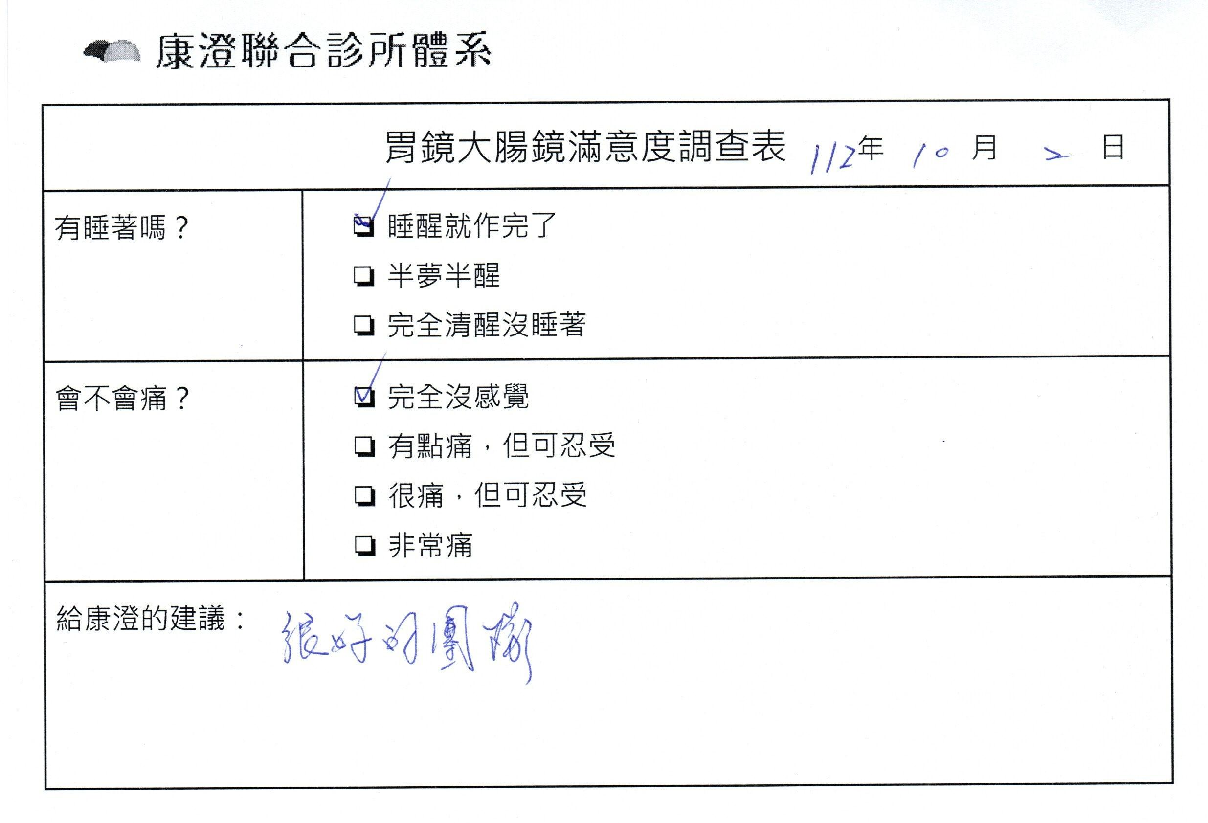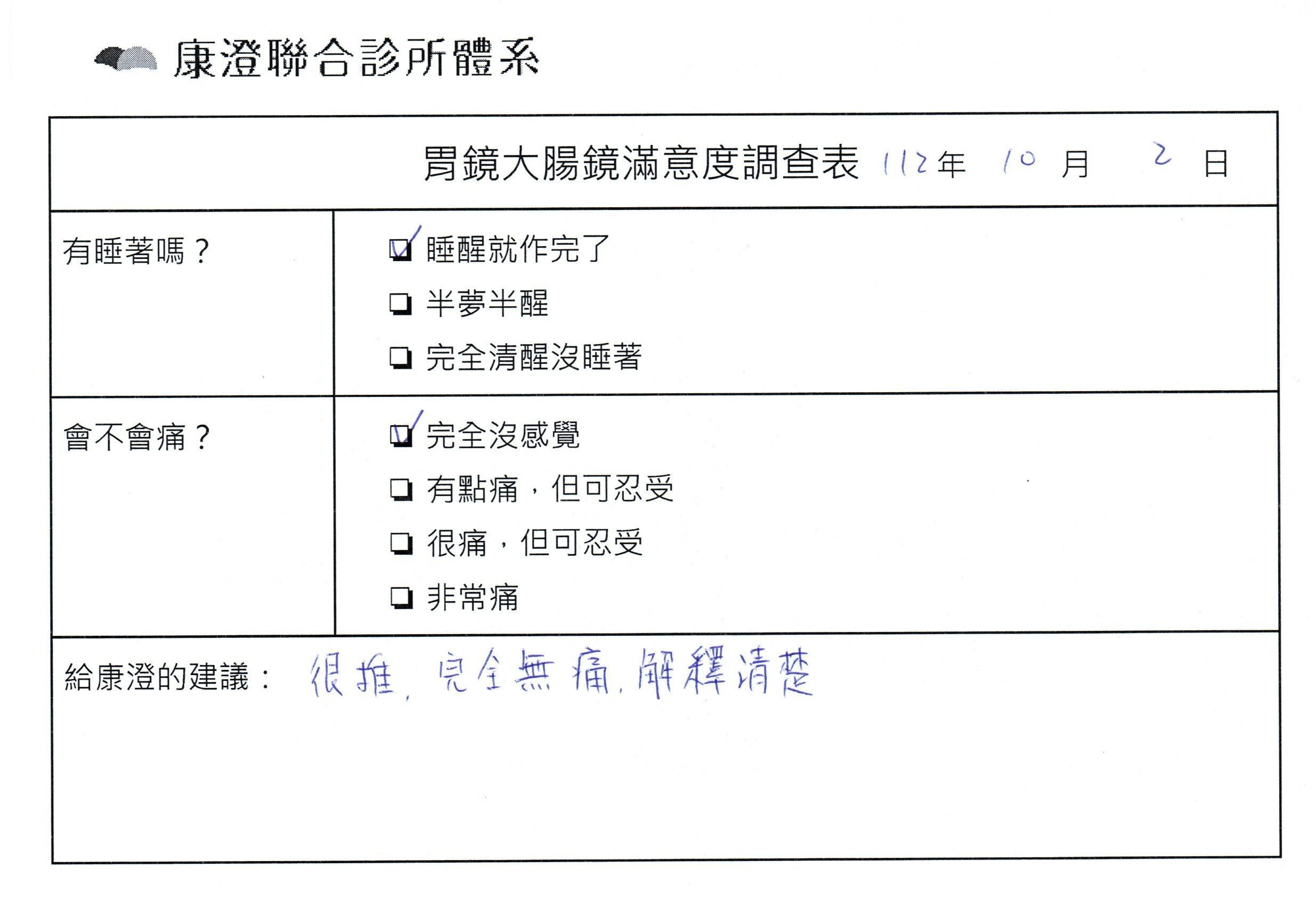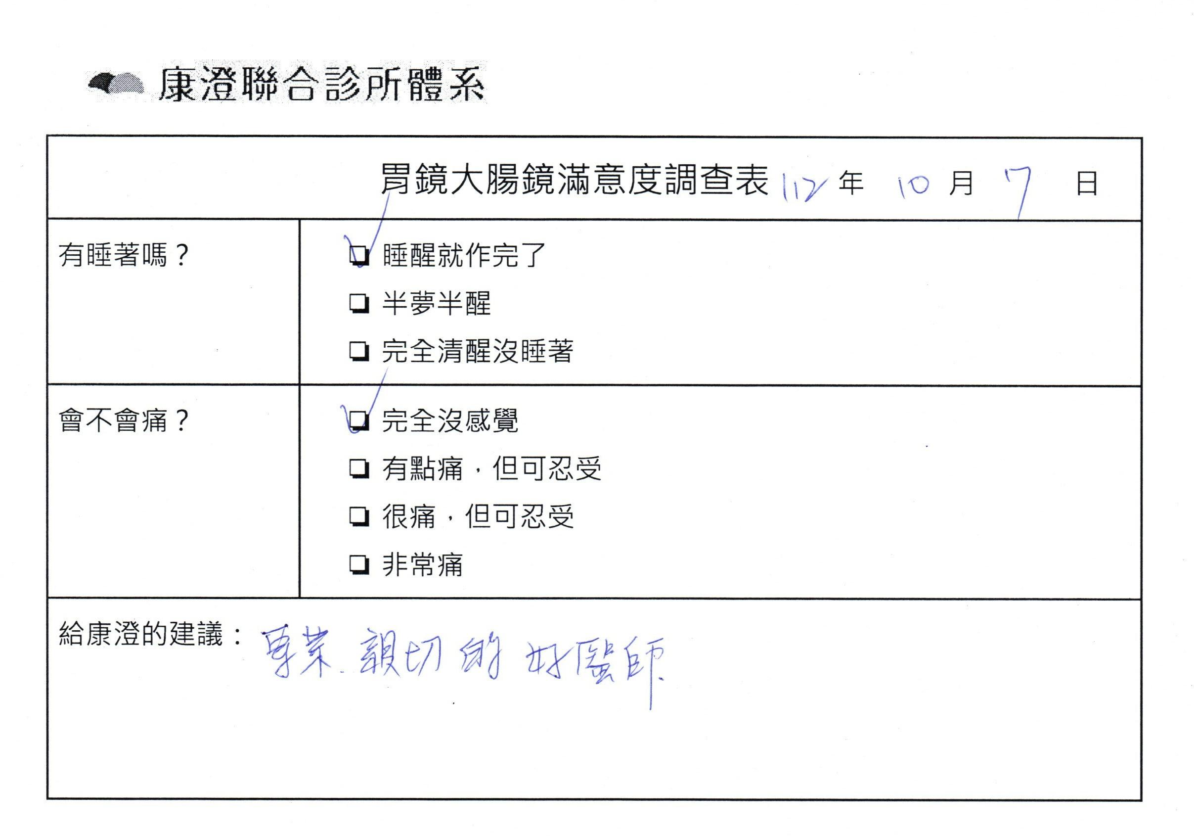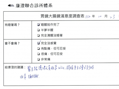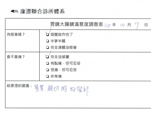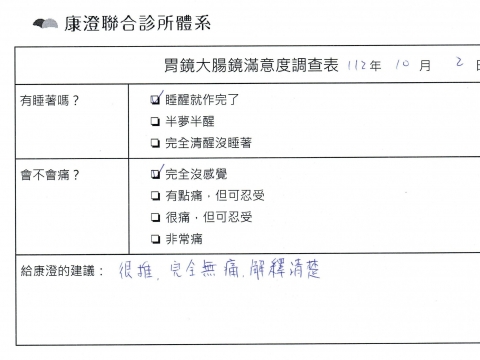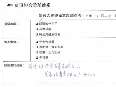 「定期穩定在櫃診所健檢,腸胃鏡的檢查醫療團隊及護理人員後續衛教的處理不輸醫院等級ㆍ專業丶舒適丶安心,整個療程無痛,護理人員親切可降低檢查的緊張感,非常感謝!」