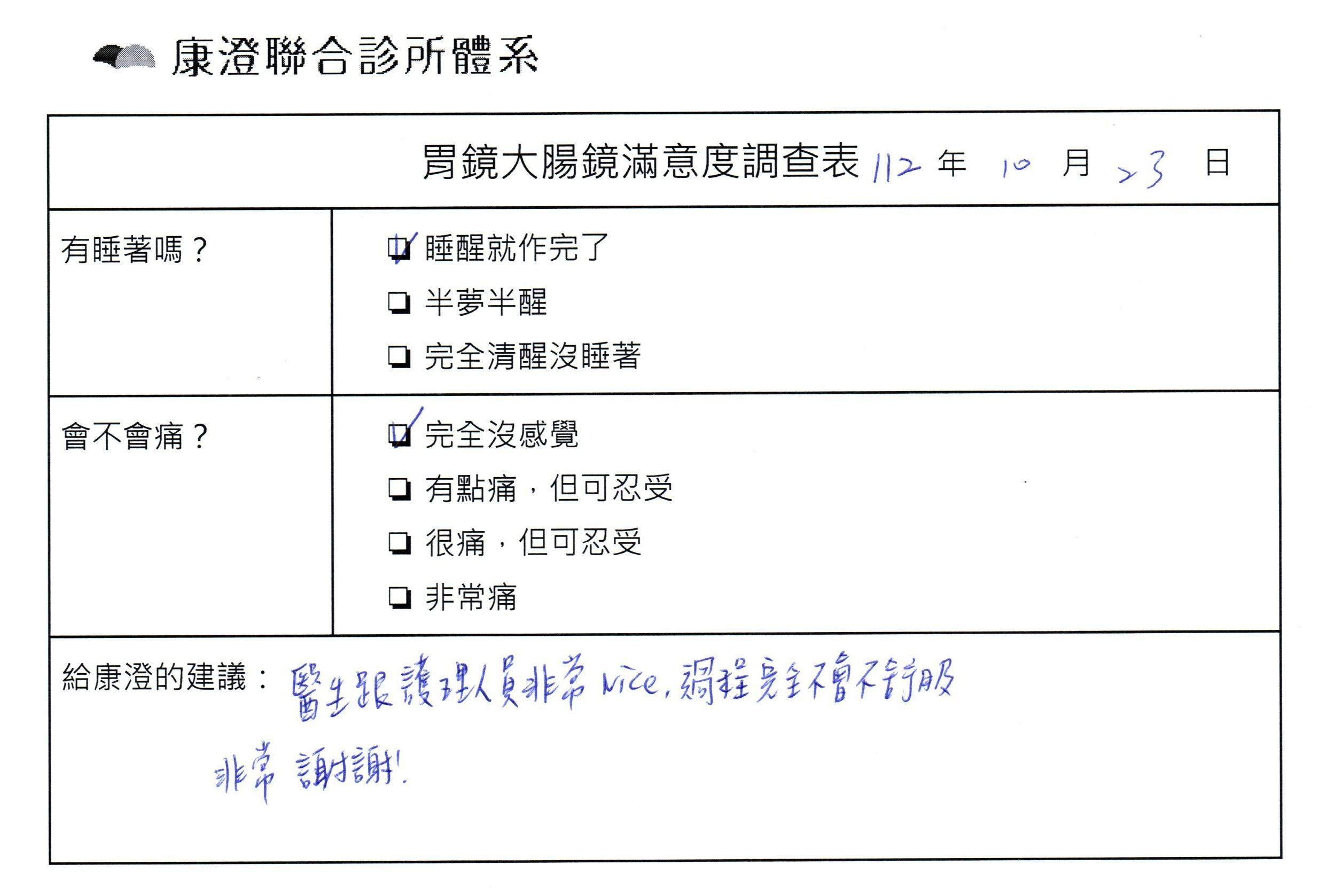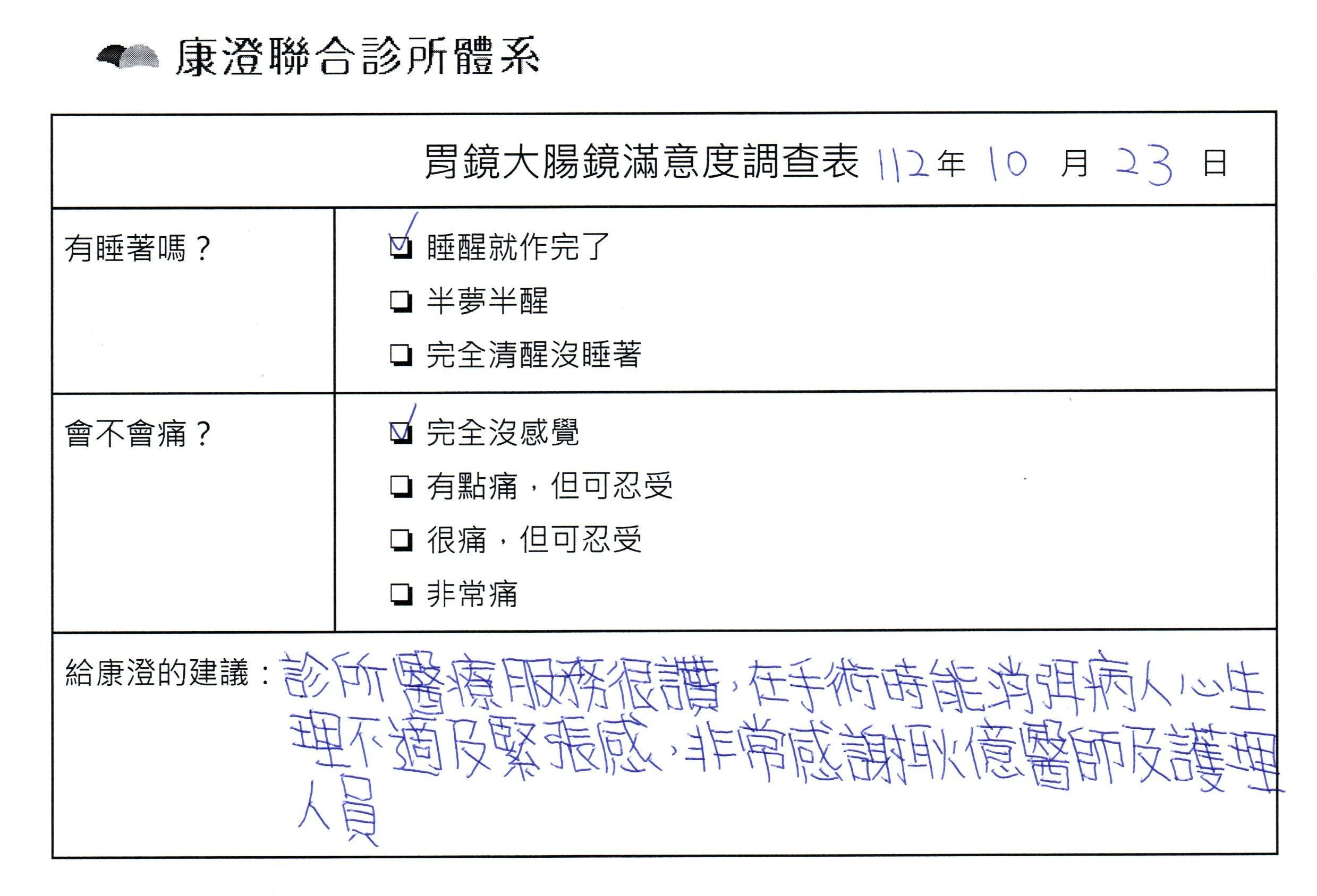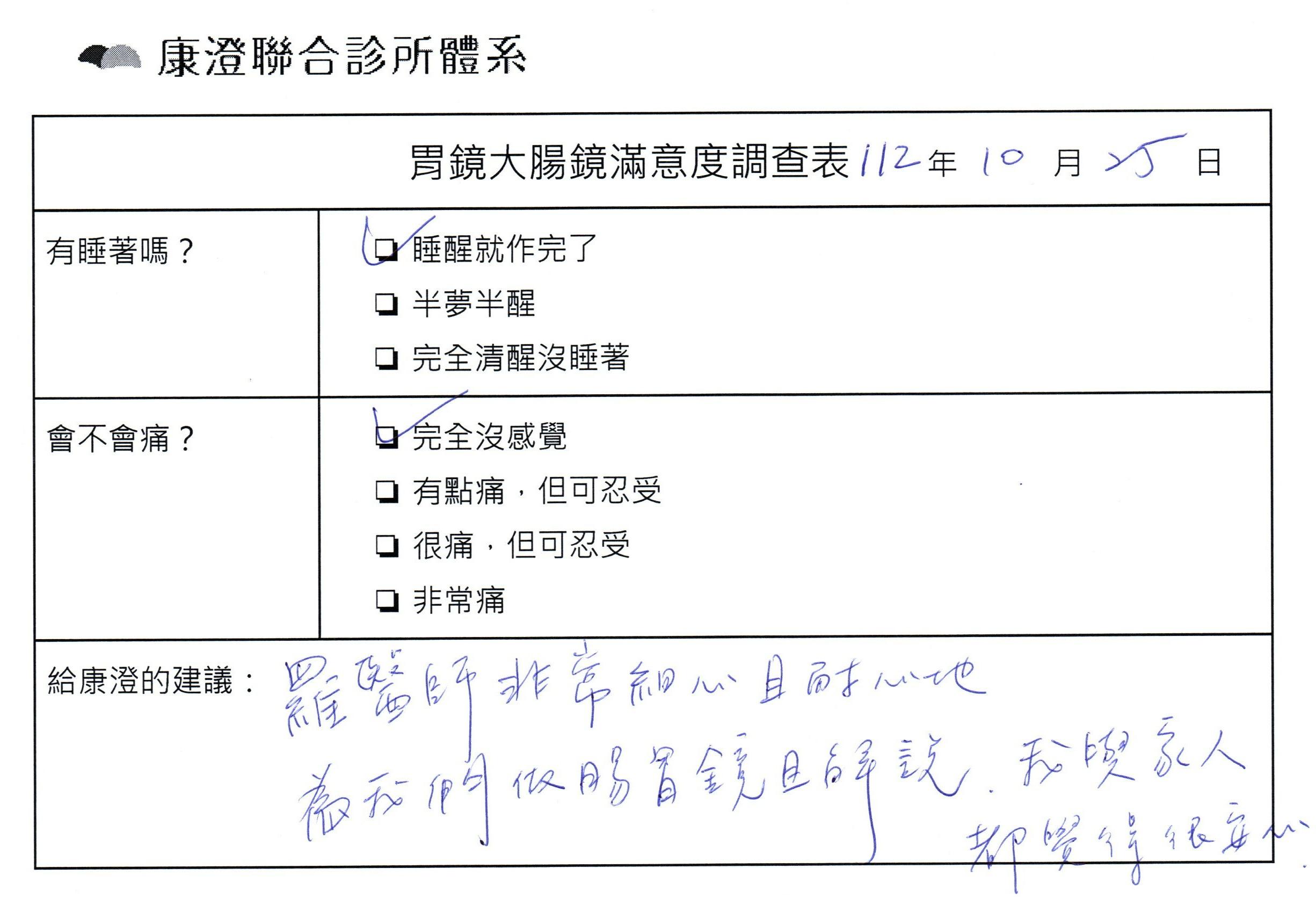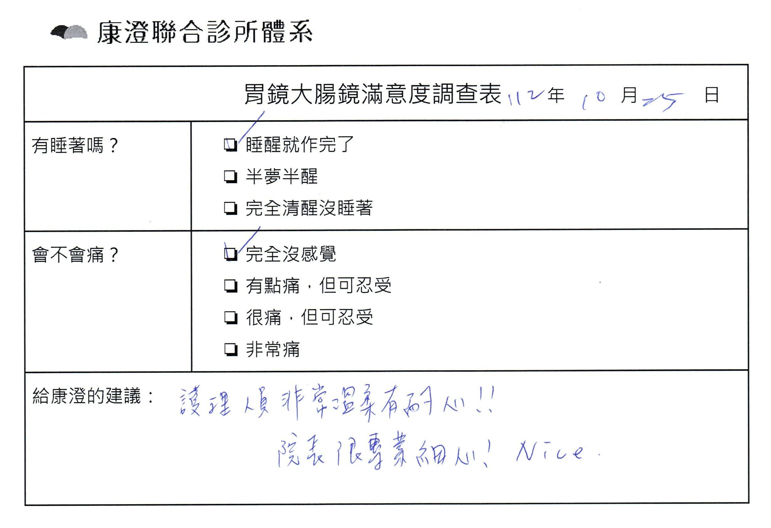「定期穩定在櫃診所健檢,腸胃鏡的檢查醫療團隊及護理人員後續衛教的處理不輸醫院等級ㆍ專業丶舒適丶安心,整個療程無痛,護理人員親切可降低檢查的緊張感,非常感謝!」