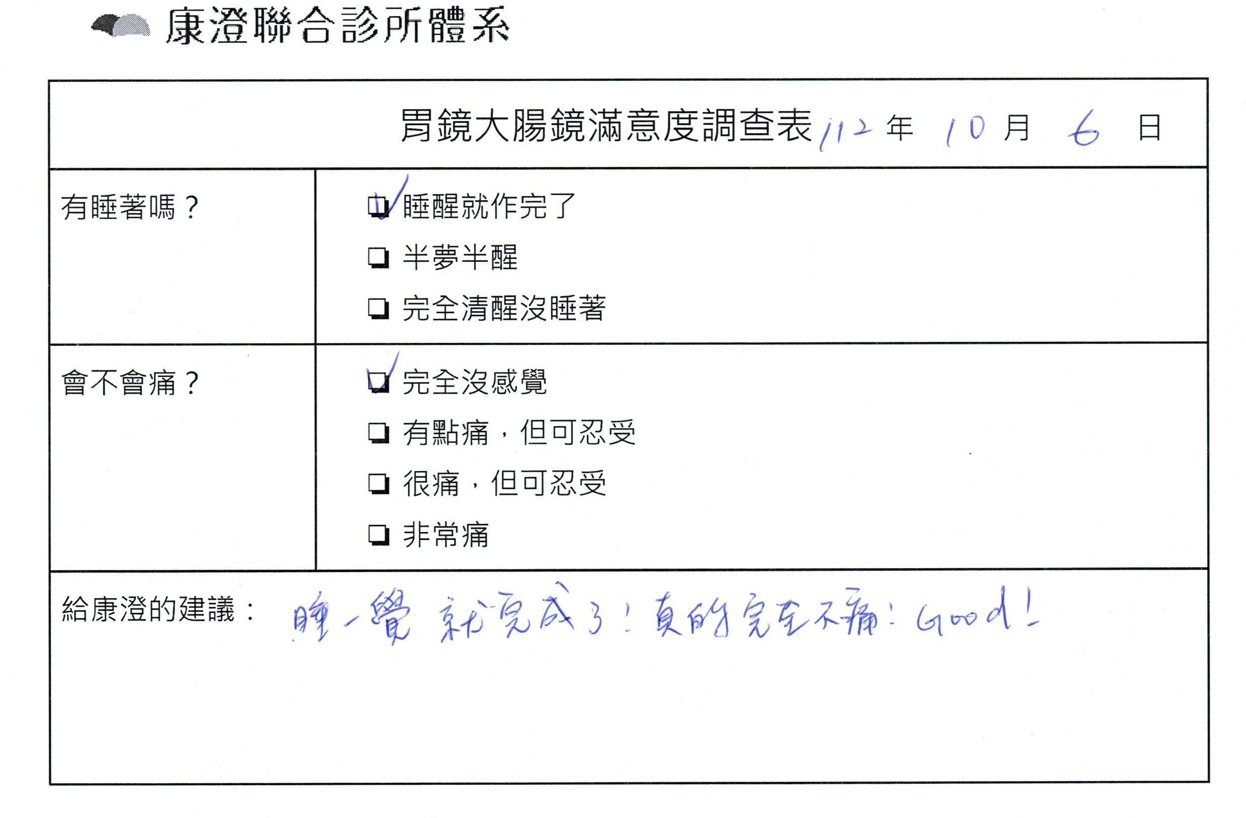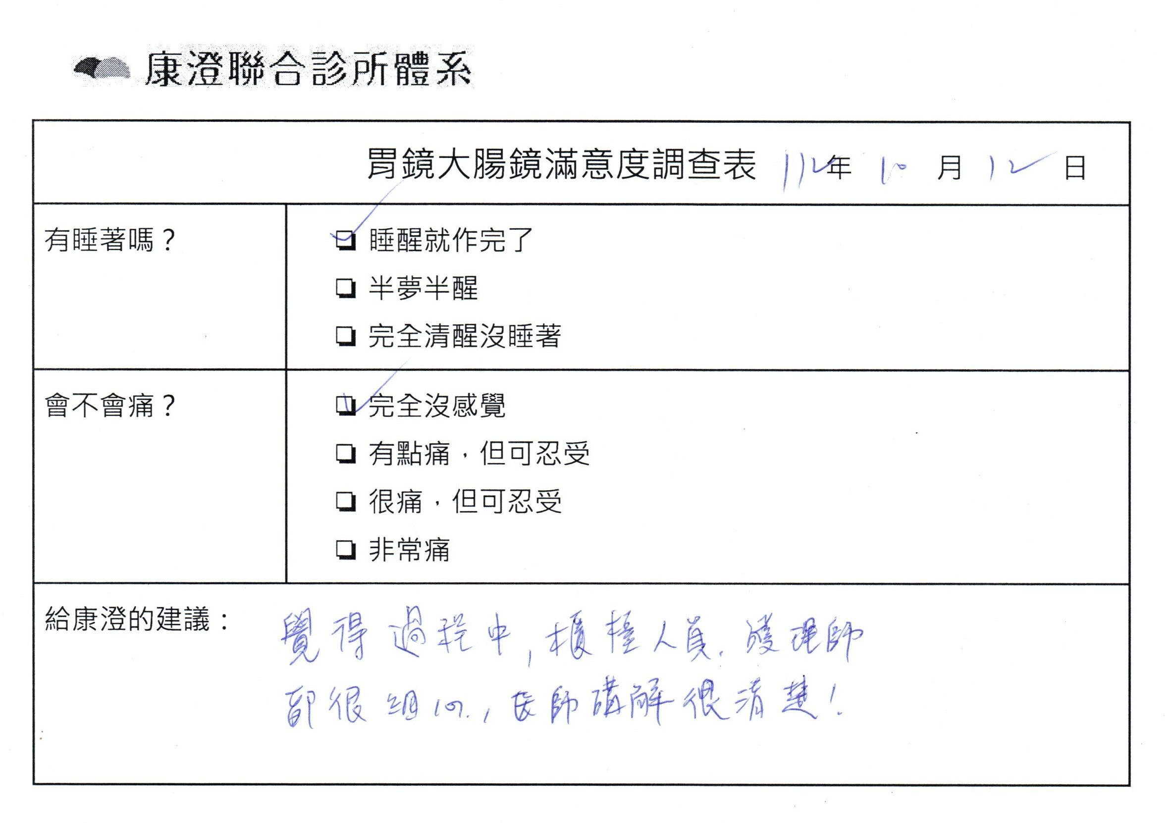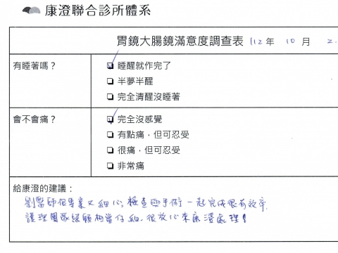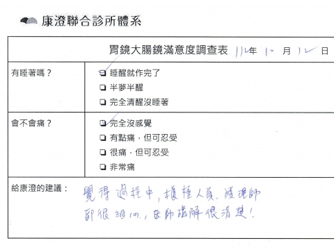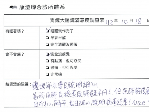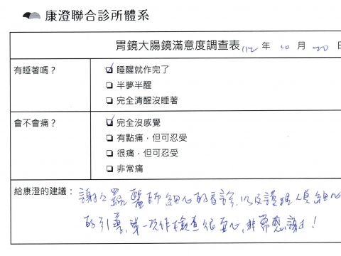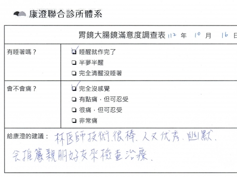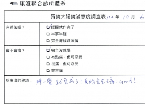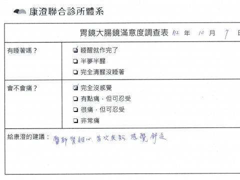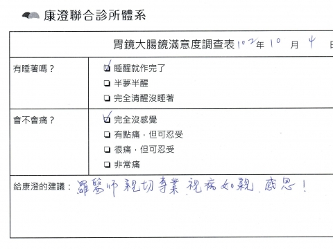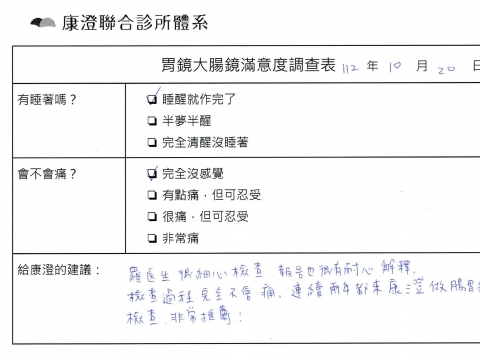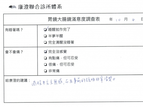 「定期穩定在櫃診所健檢,腸胃鏡的檢查醫療團隊及護理人員後續衛教的處理不輸醫院等級ㆍ專業丶舒適丶安心,整個療程無痛,護理人員親切可降低檢查的緊張感,非常感謝!」