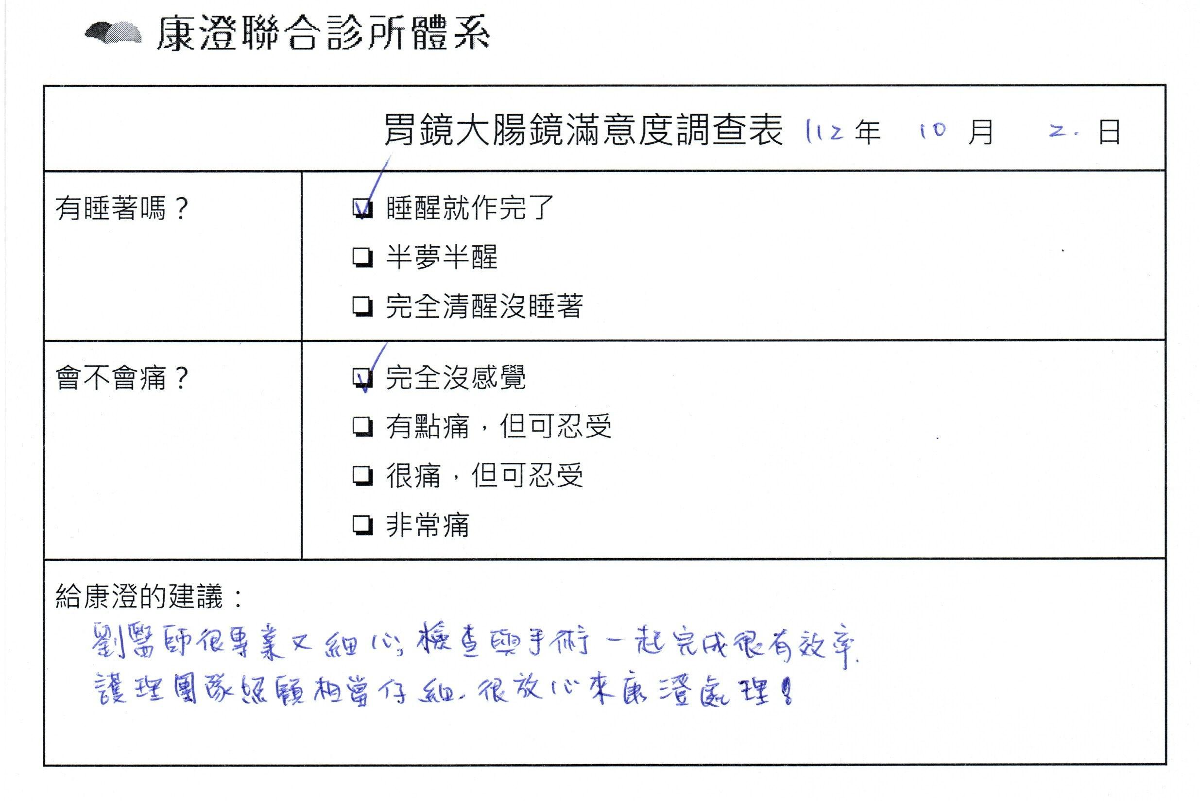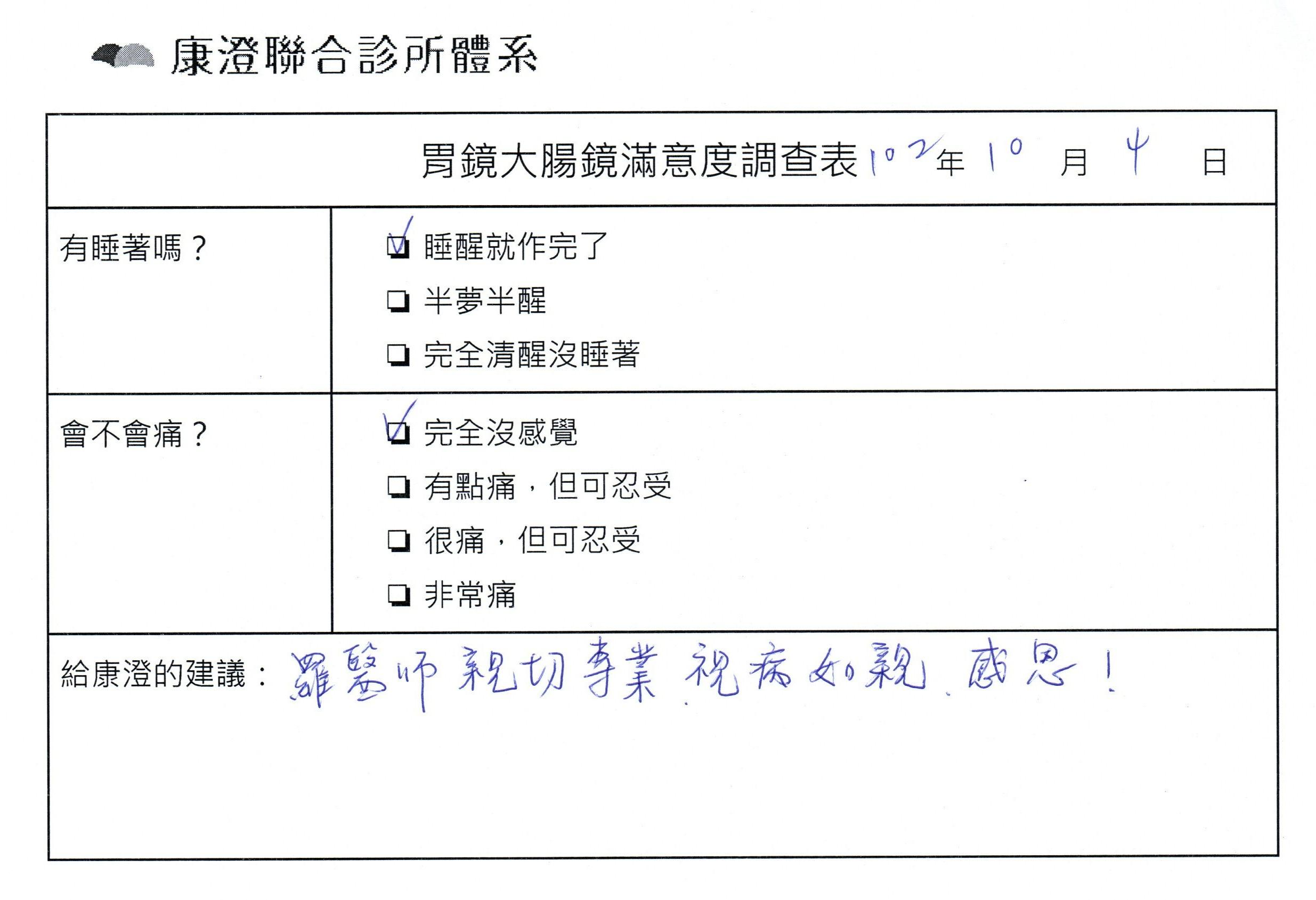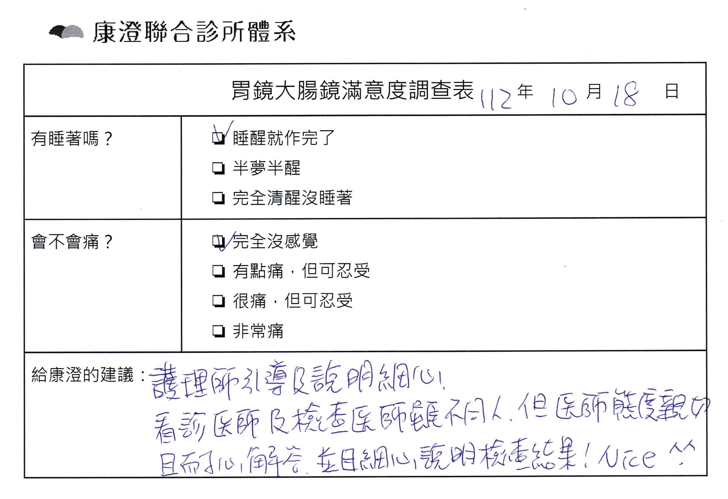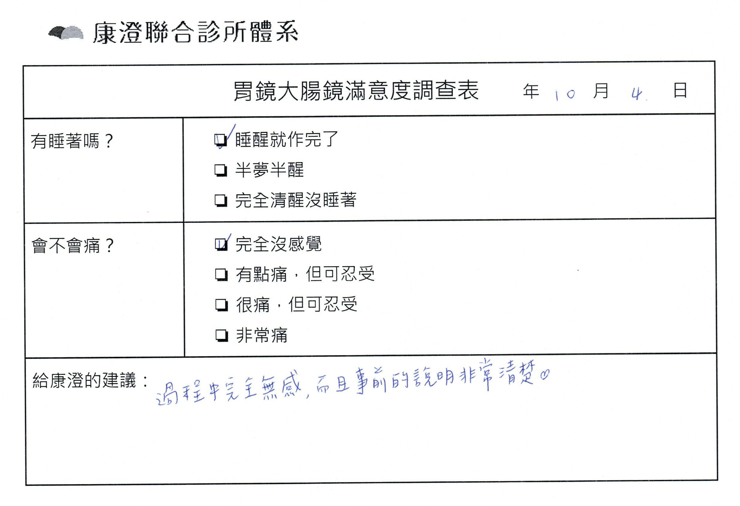 「定期穩定在櫃診所健檢,腸胃鏡的檢查醫療團隊及護理人員後續衛教的處理不輸醫院等級ㆍ專業丶舒適丶安心,整個療程無痛,護理人員親切可降低檢查的緊張感,非常感謝!」
