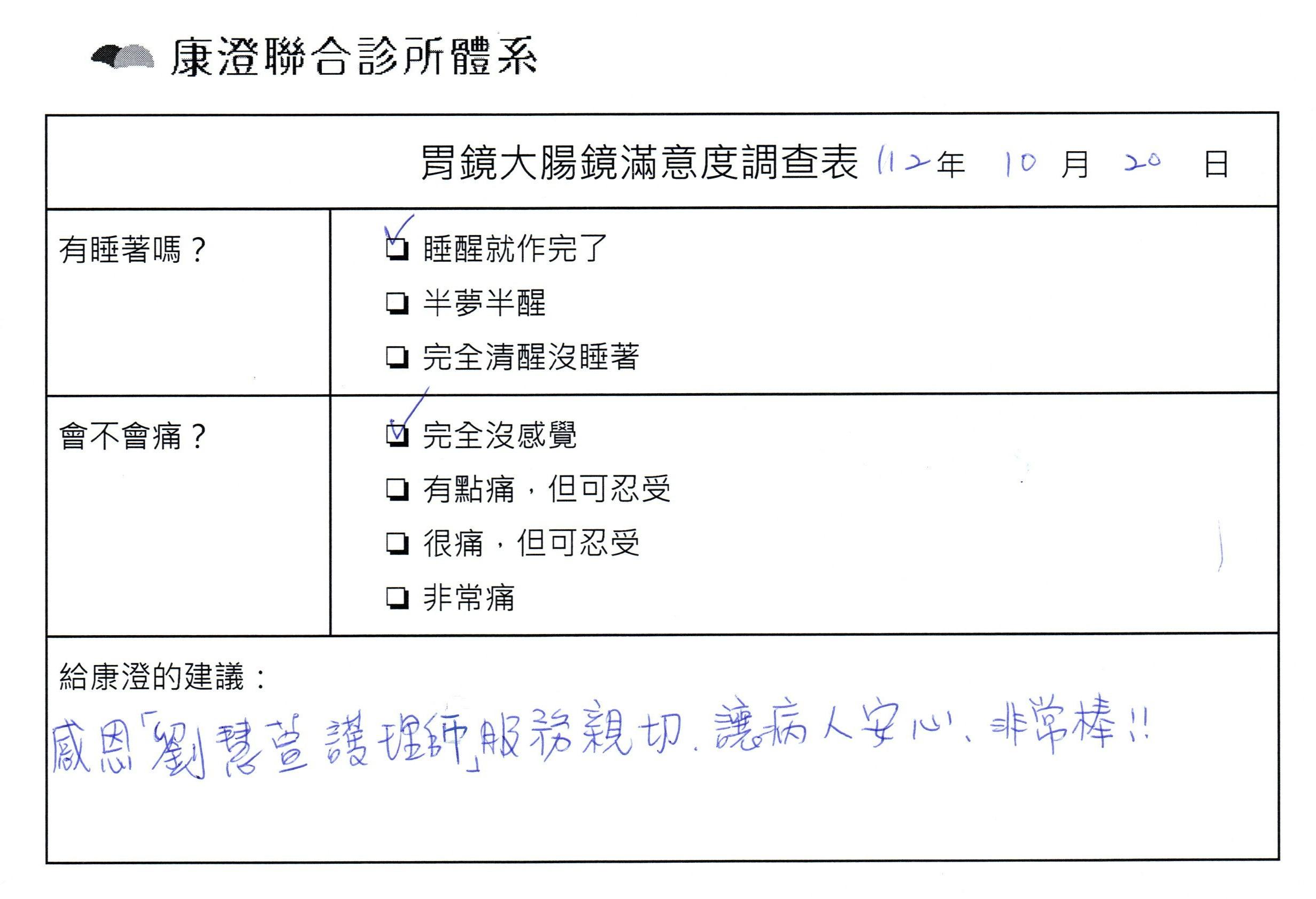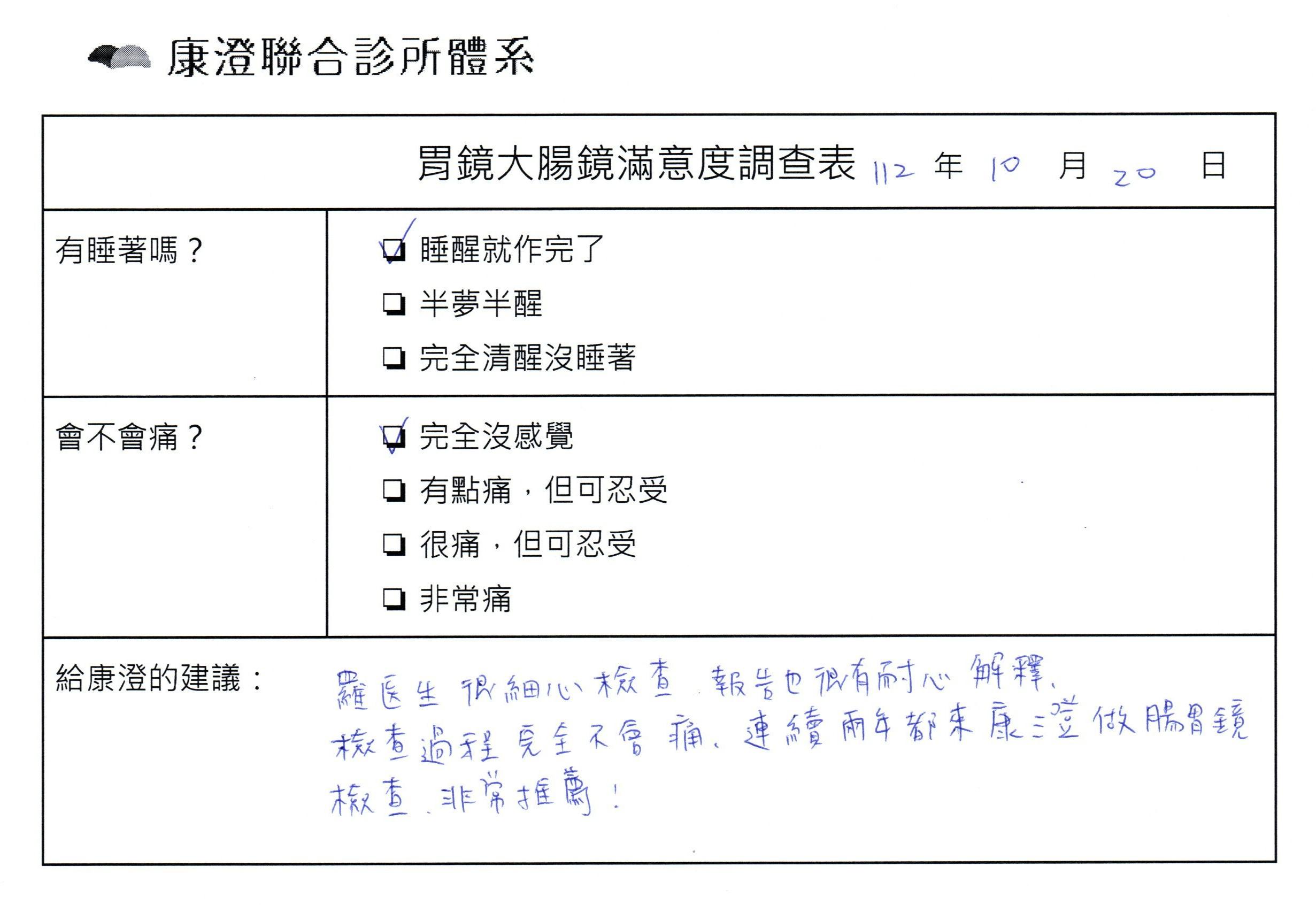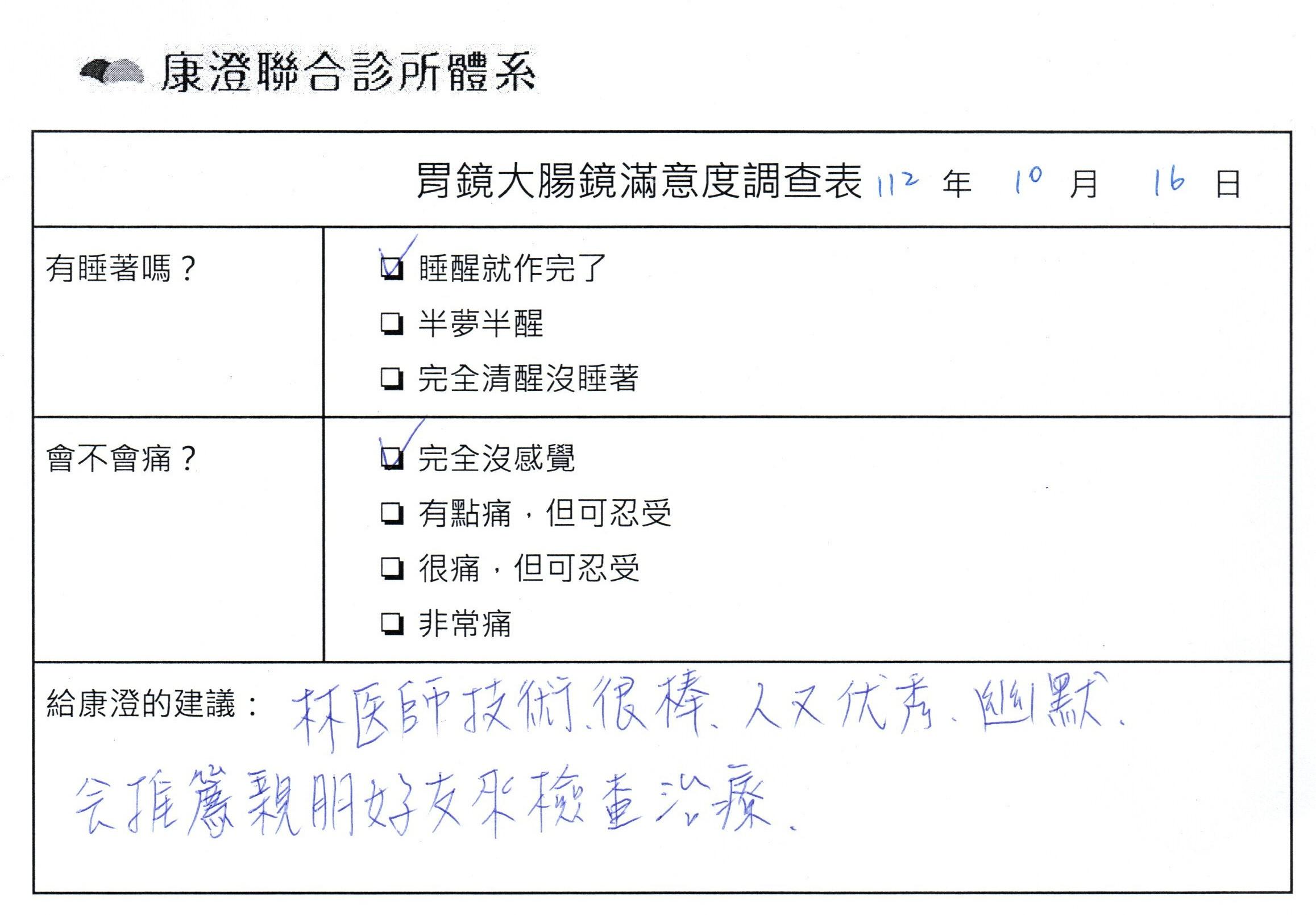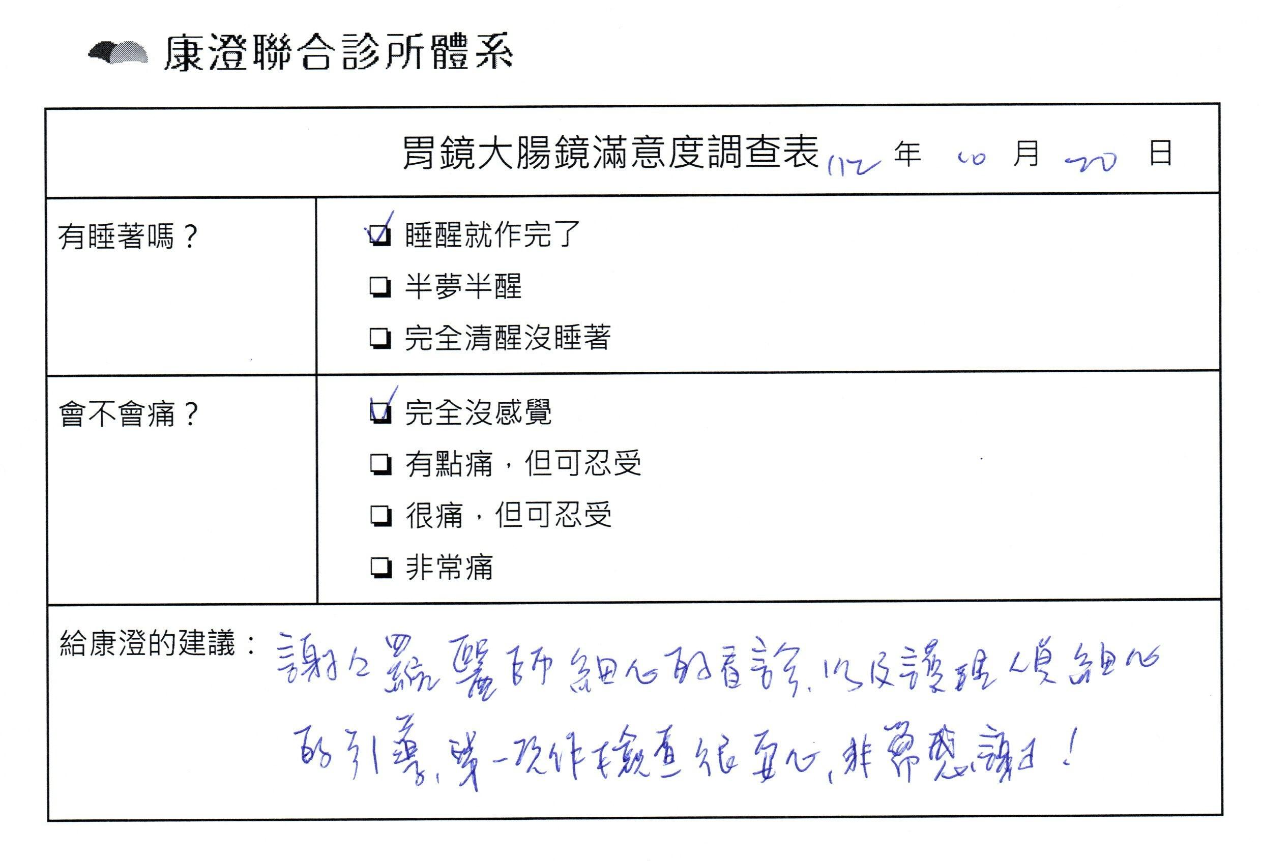 「定期穩定在櫃診所健檢,腸胃鏡的檢查醫療團隊及護理人員後續衛教的處理不輸醫院等級ㆍ專業丶舒適丶安心,整個療程無痛,護理人員親切可降低檢查的緊張感,非常感謝!」
