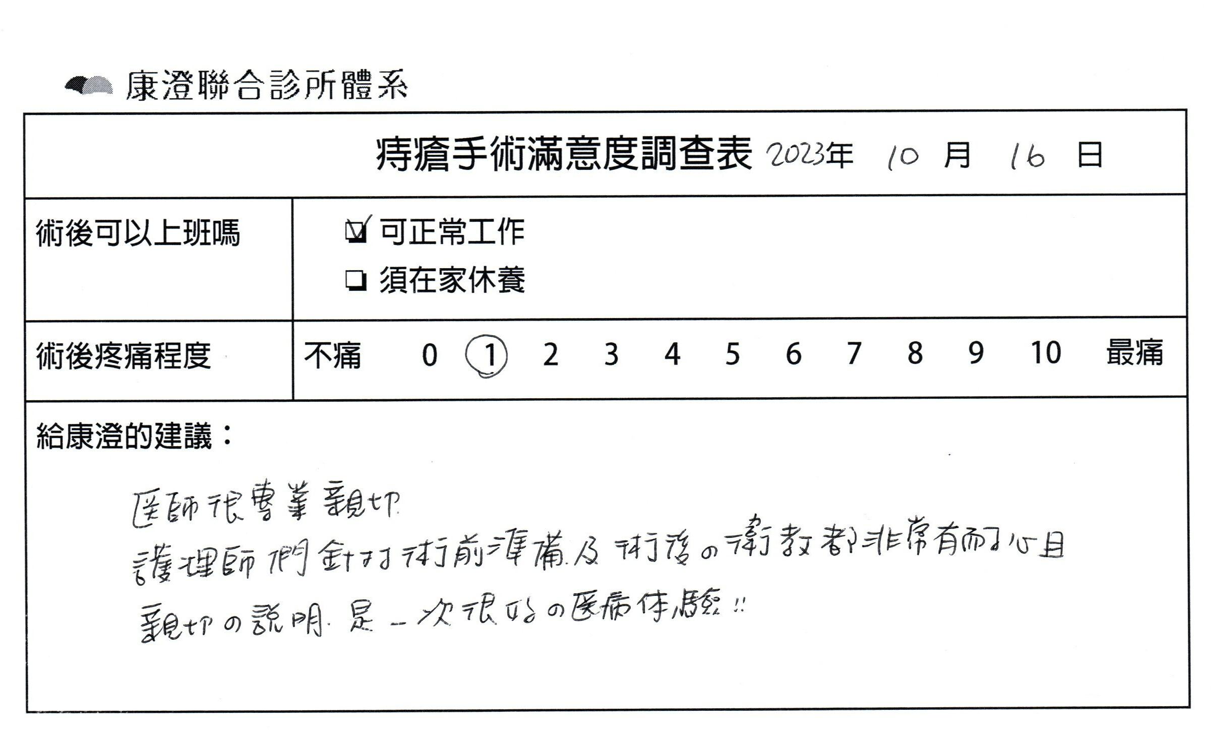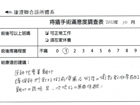 「困擾了20多年的三期內痔,終於在幾天內就解決了,原以為會很疼痛的手術及復原過程,結果真是神奇啊!不會痛呢!長效針應該是有用的,前幾天主要是腫脹,感謝林醫師,以及術後時時電話關心的小護士們,很棒!」