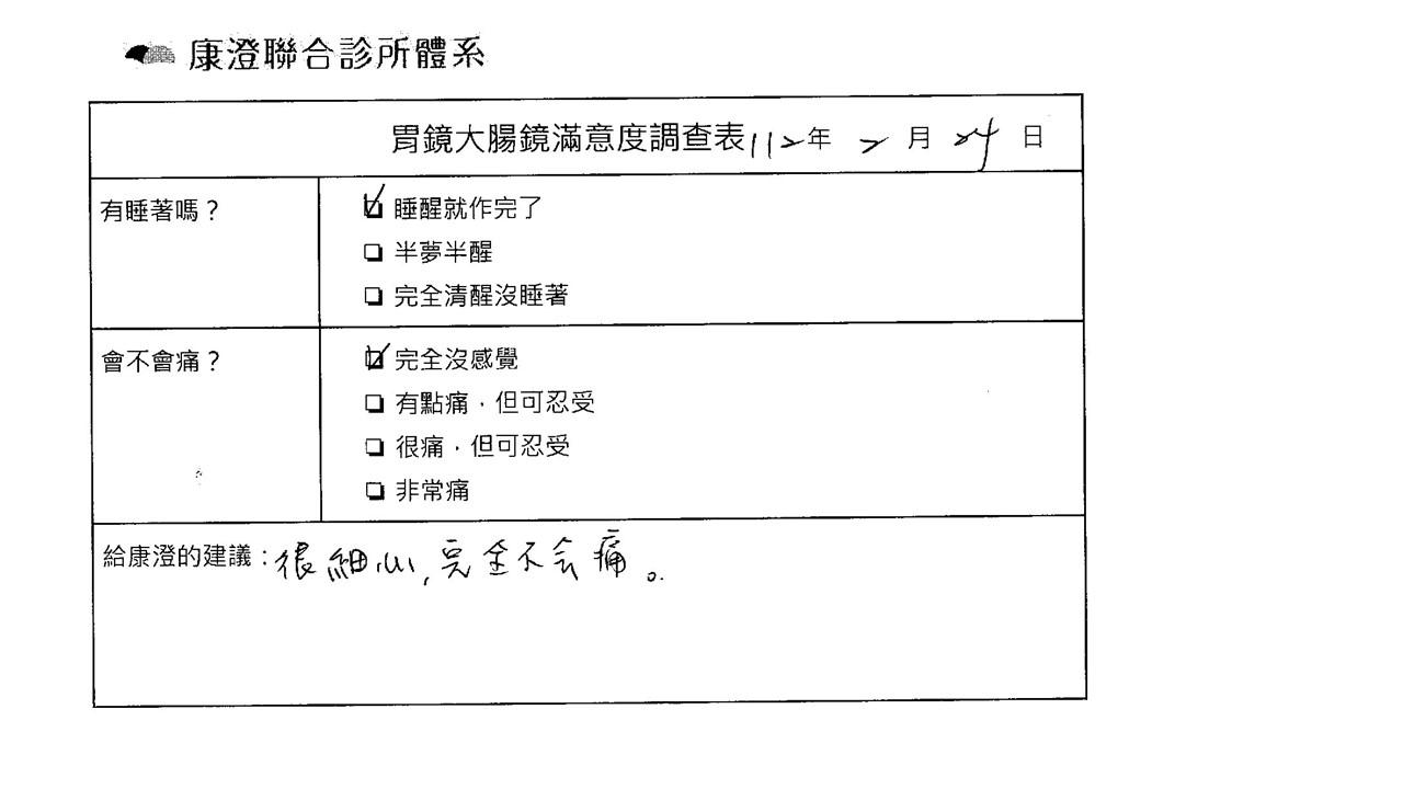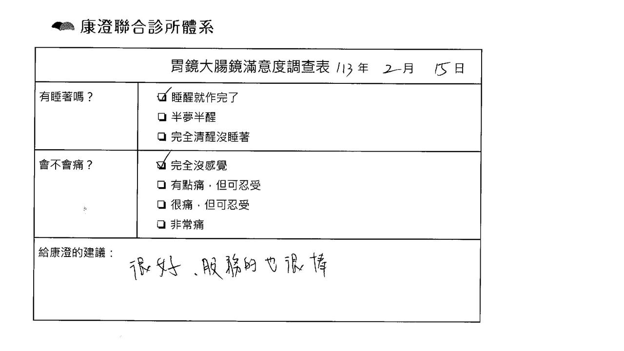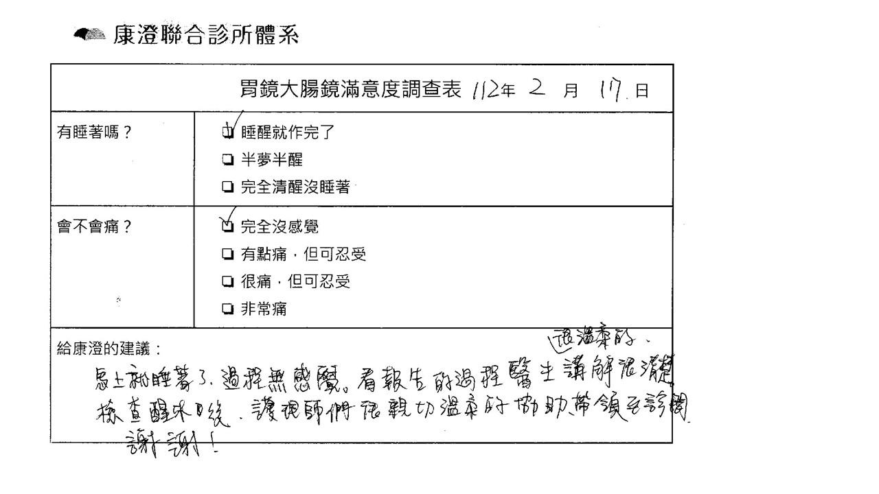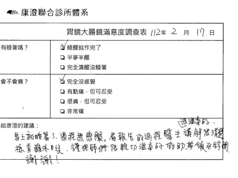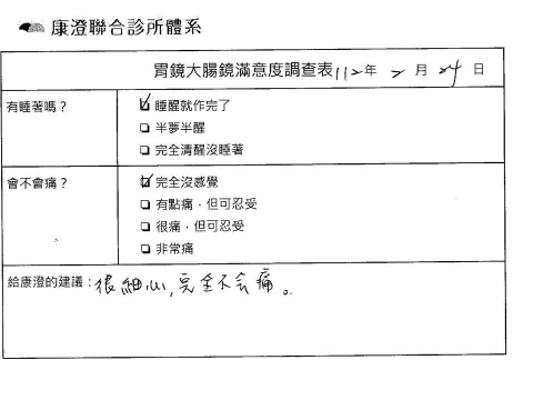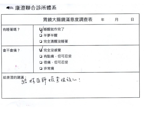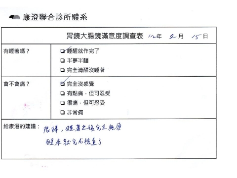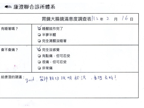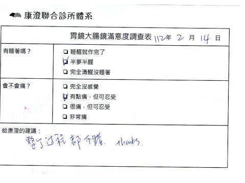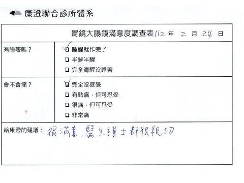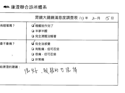 「定期穩定在櫃診所健檢,腸胃鏡的檢查醫療團隊及護理人員後續衛教的處理不輸醫院等級ㆍ專業丶舒適丶安心,整個療程無痛,護理人員親切可降低檢查的緊張感,非常感謝!」