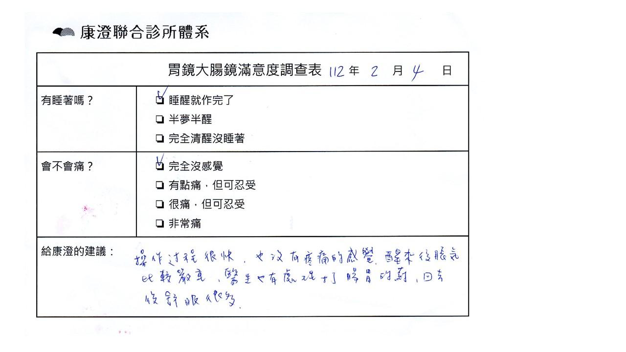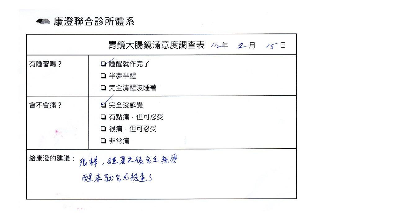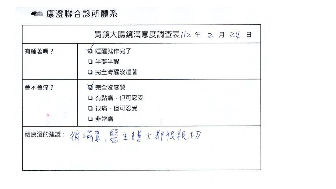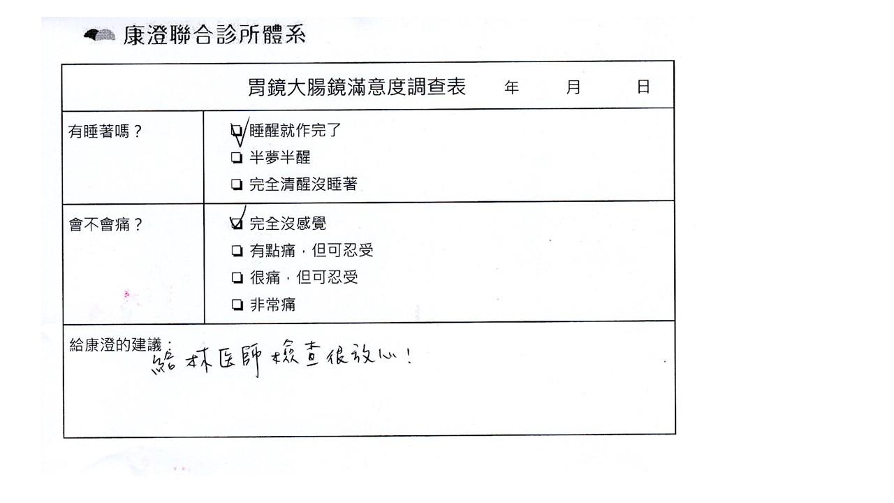 「定期穩定在櫃診所健檢,腸胃鏡的檢查醫療團隊及護理人員後續衛教的處理不輸醫院等級ㆍ專業丶舒適丶安心,整個療程無痛,護理人員親切可降低檢查的緊張感,非常感謝!」