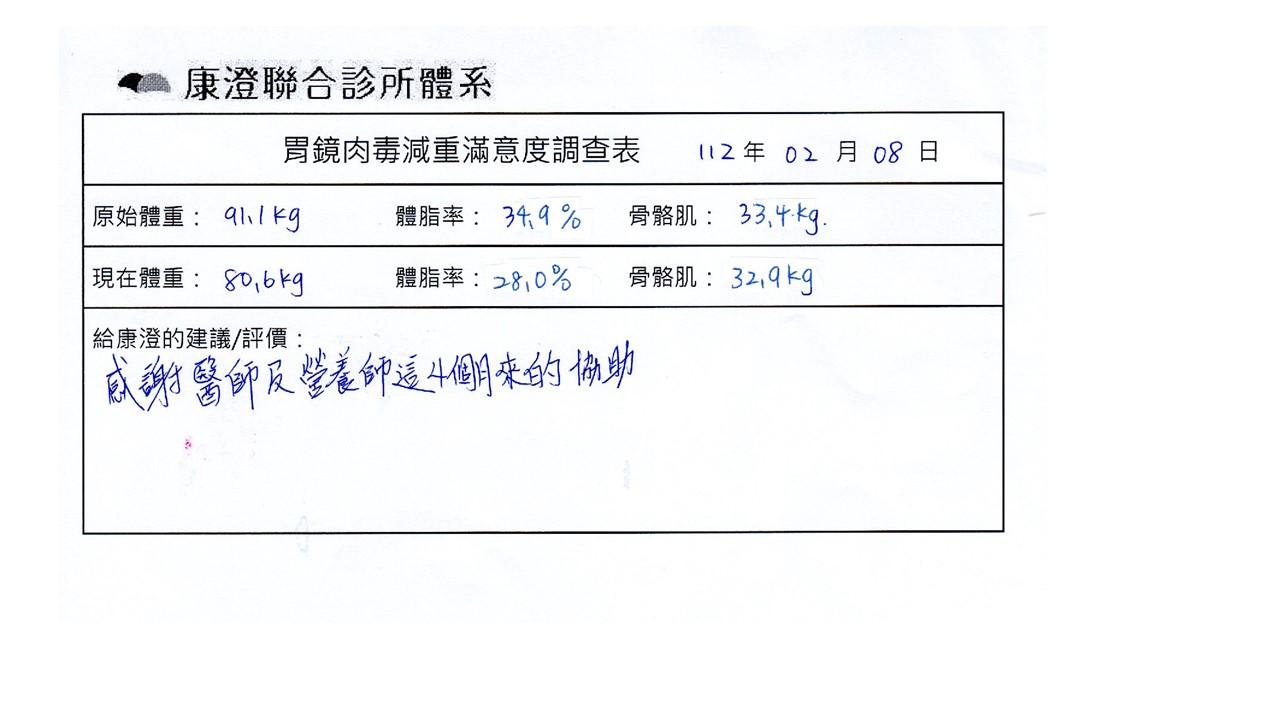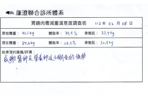 「很開心做了胃肉毒減重療程,讓我體會最幸福不挨餓的減肥方式!瘦了10%體重後,讓體態變美,最重要是身體變健康喔!感謝羅醫師及營養師的提醒及追蹤。」