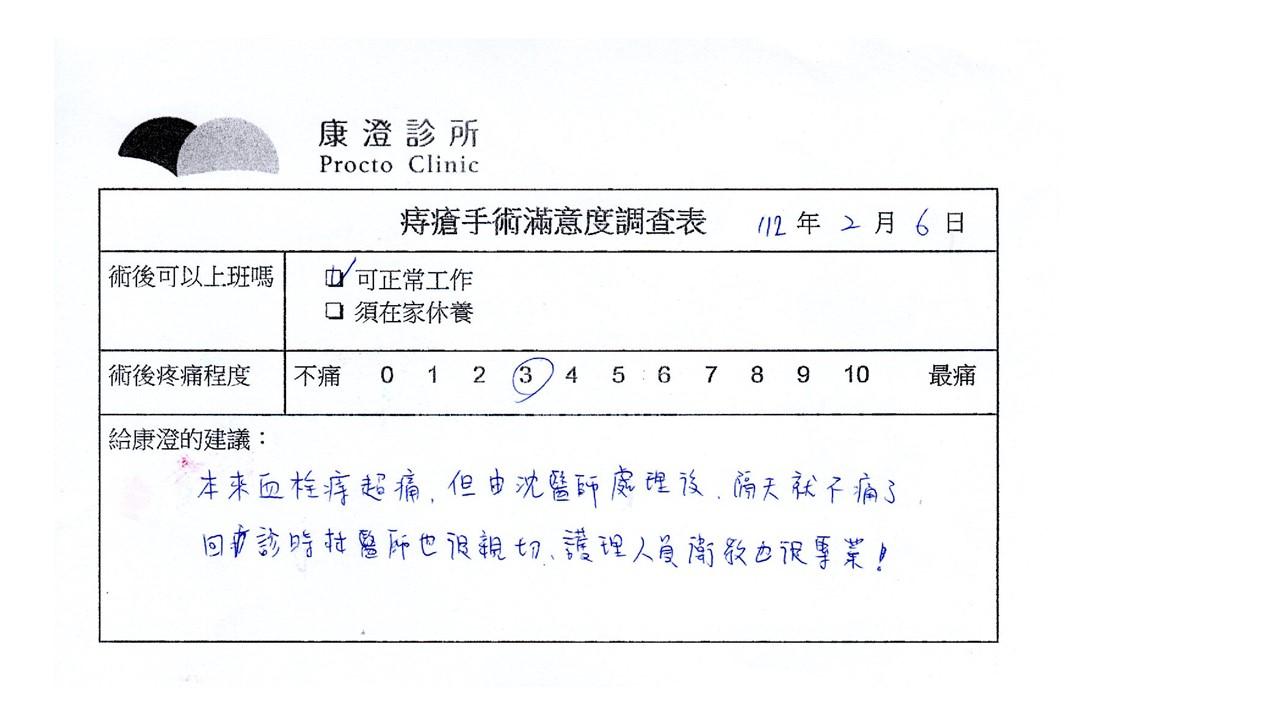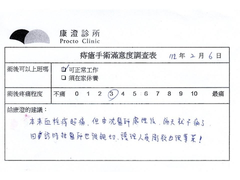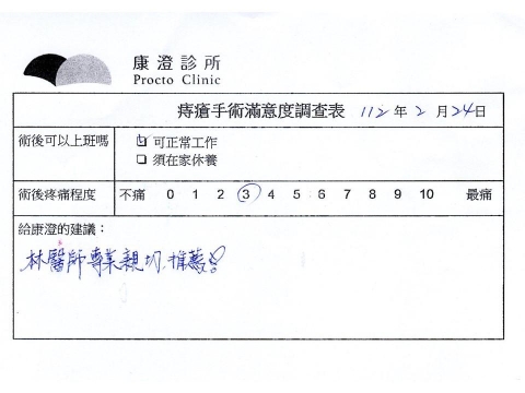 「困擾了20多年的三期內痔,終於在幾天內就解決了,原以為會很疼痛的手術及復原過程,結果真是神奇啊!不會痛呢!長效針應該是有用的,前幾天主要是腫脹,感謝林醫師,以及術後時時電話關心的小護士們,很棒!」