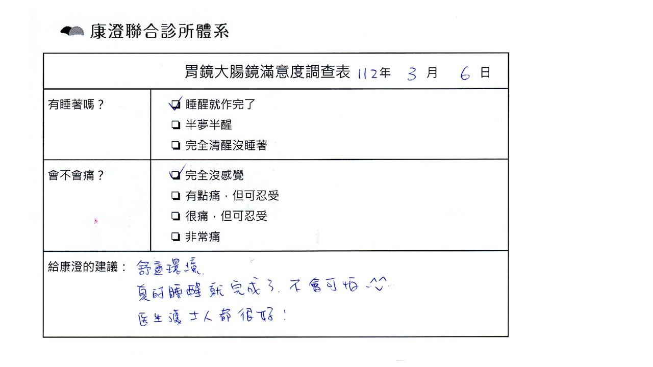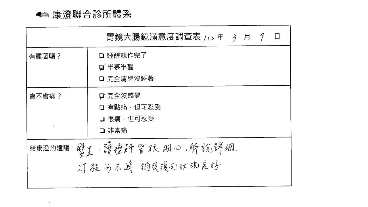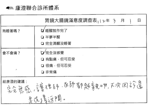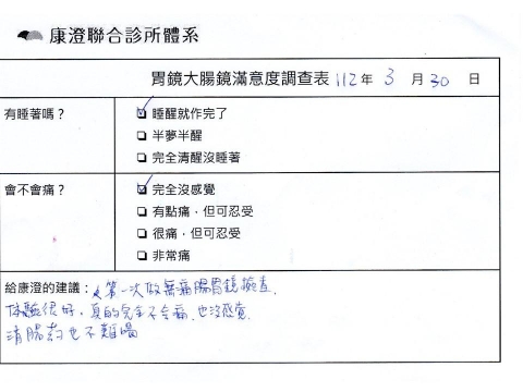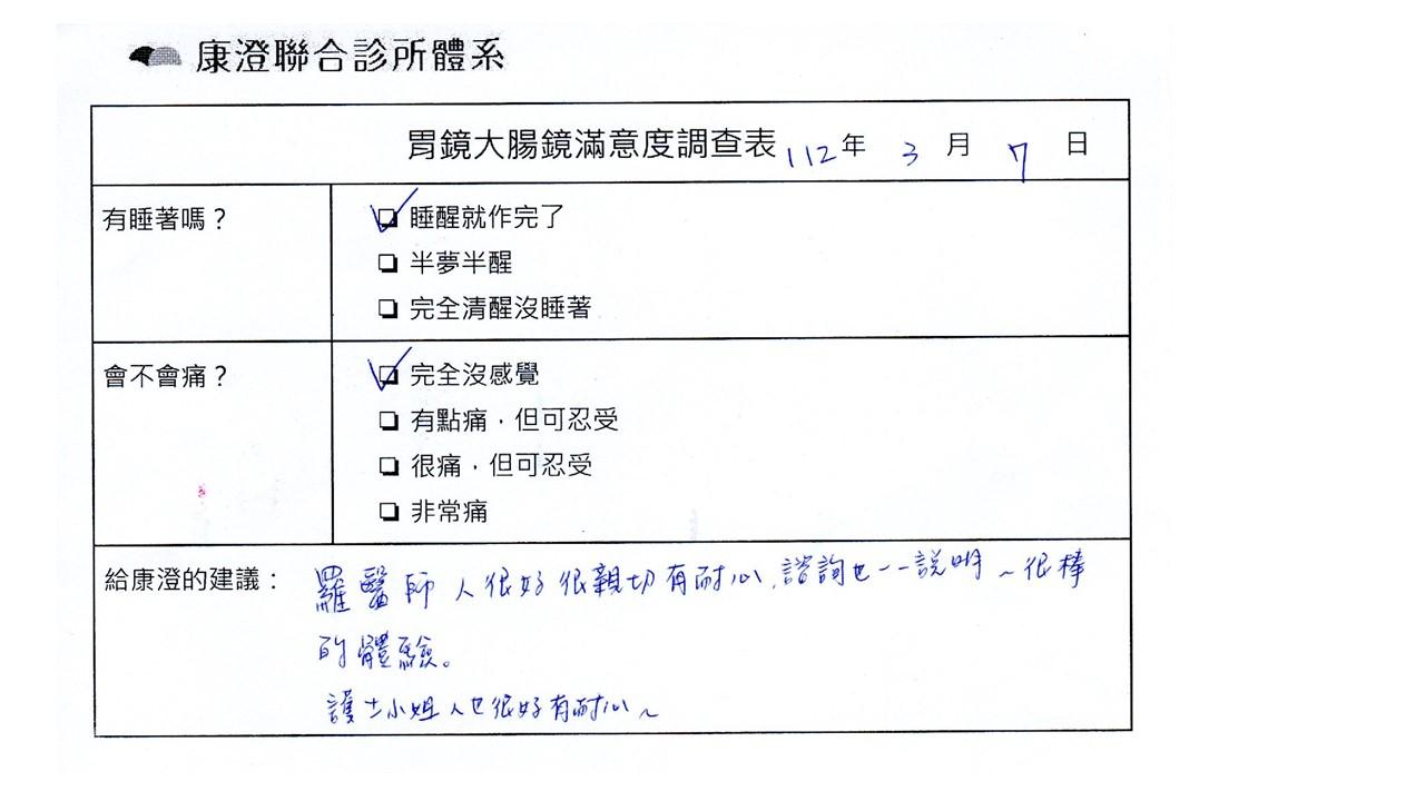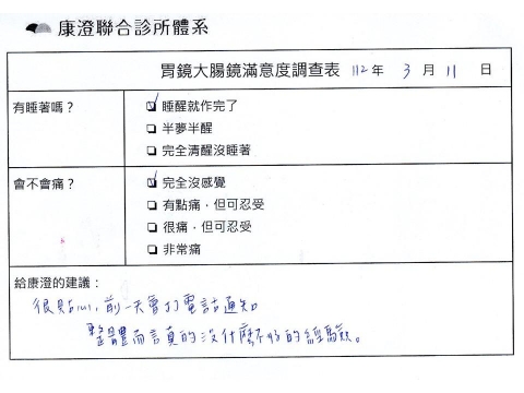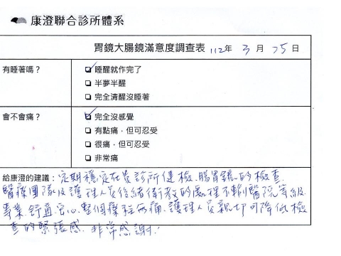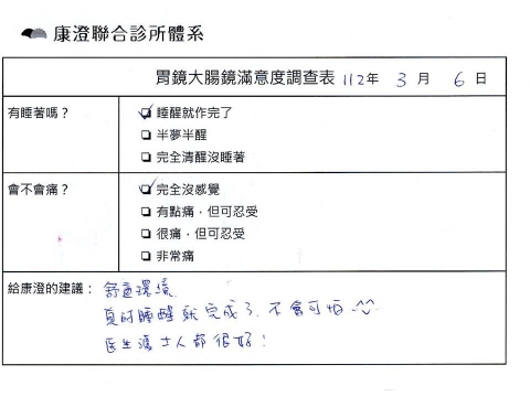 「定期穩定在櫃診所健檢,腸胃鏡的檢查醫療團隊及護理人員後續衛教的處理不輸醫院等級ㆍ專業丶舒適丶安心,整個療程無痛,護理人員親切可降低檢查的緊張感,非常感謝!」