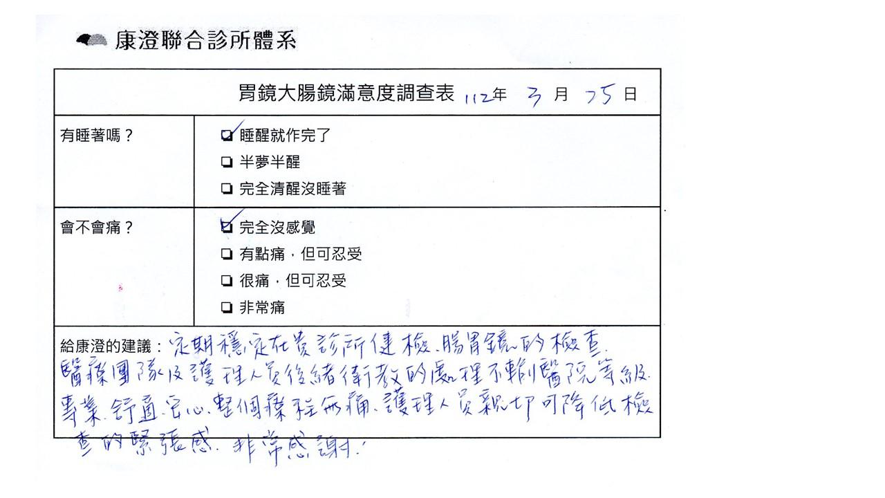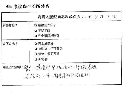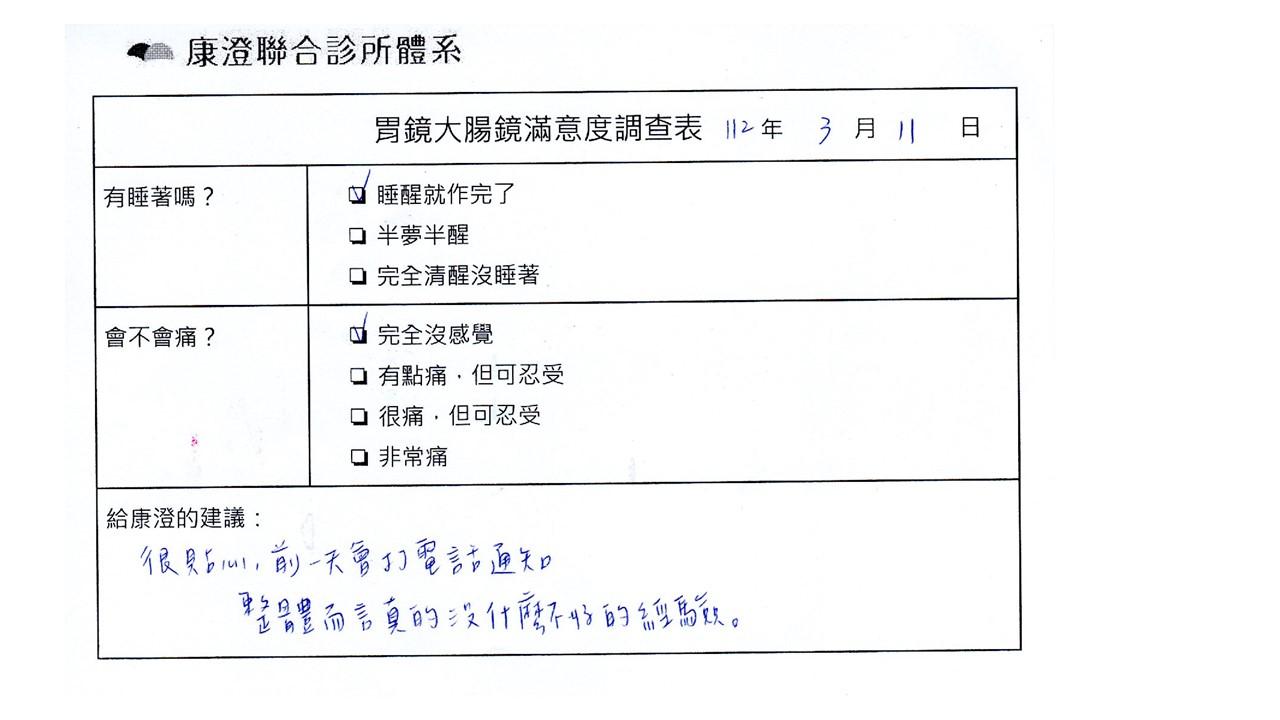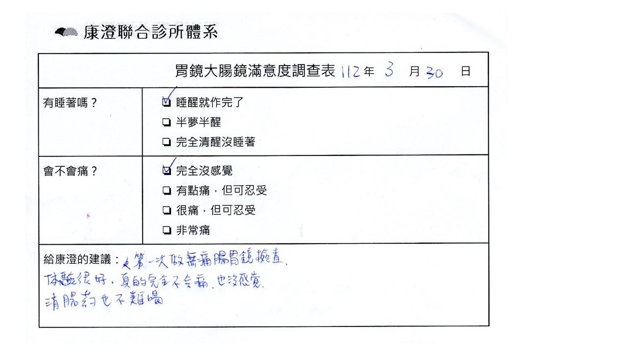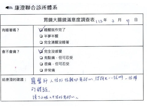 「定期穩定在櫃診所健檢,腸胃鏡的檢查醫療團隊及護理人員後續衛教的處理不輸醫院等級ㆍ專業丶舒適丶安心,整個療程無痛,護理人員親切可降低檢查的緊張感,非常感謝!」